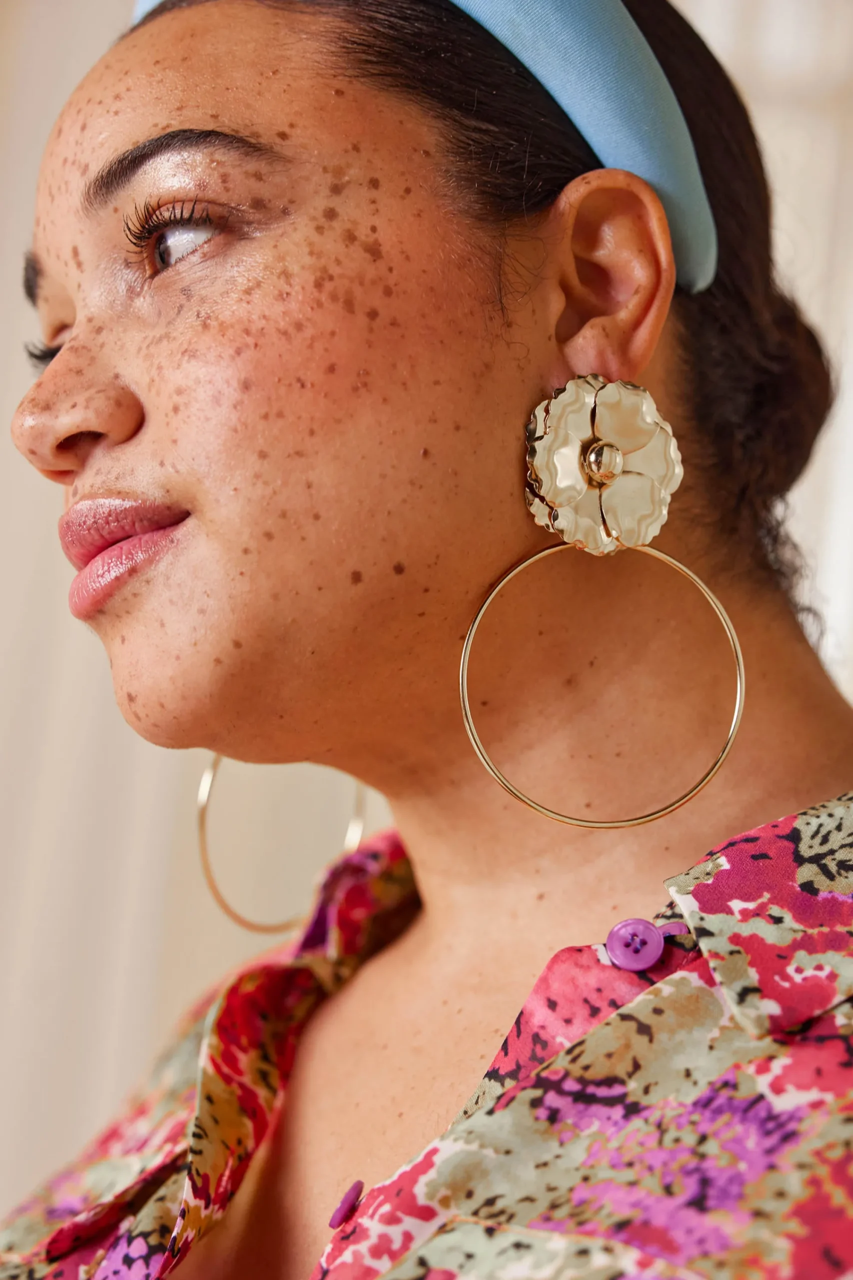 Boucle d’oreille à tige avec une grande fleur rattachée à une créole en laiton doré à l’or fin. Elle s’attache à l’oreille au niveau du dos de la fleur. Ne contient pas de nickel.