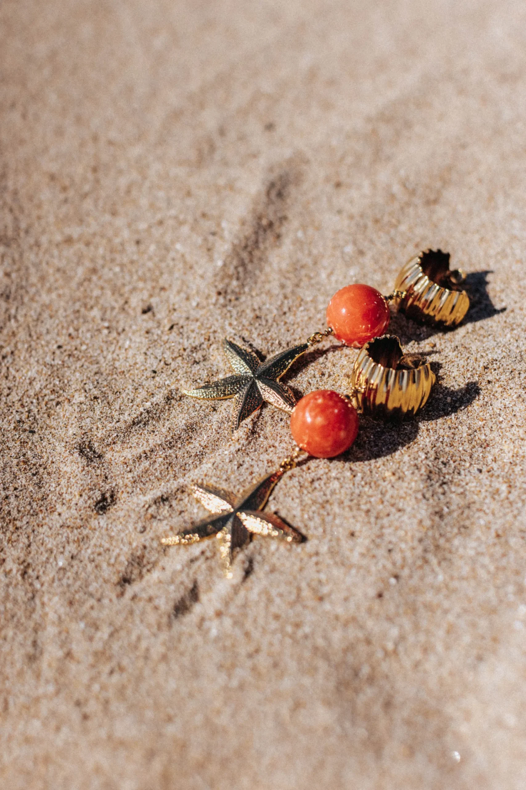 Créoles en laiton doré à l’or fin. Perles en plastique marbré et estampes d’étoiles de mer en laiton doré à l’or fin.