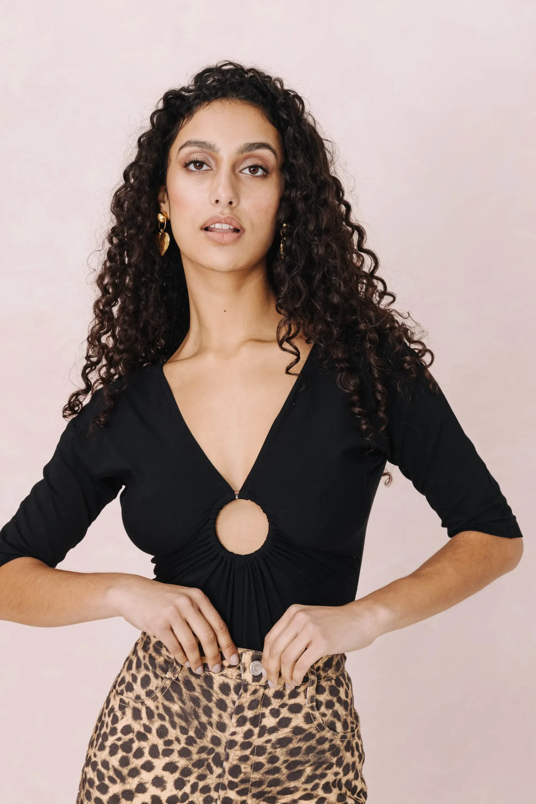 Body dont les manches n’ont pas de coutures aux niveau des épaules. Décolletés en V sur le devant et le dos, ornés de deux anneaux en plastique.