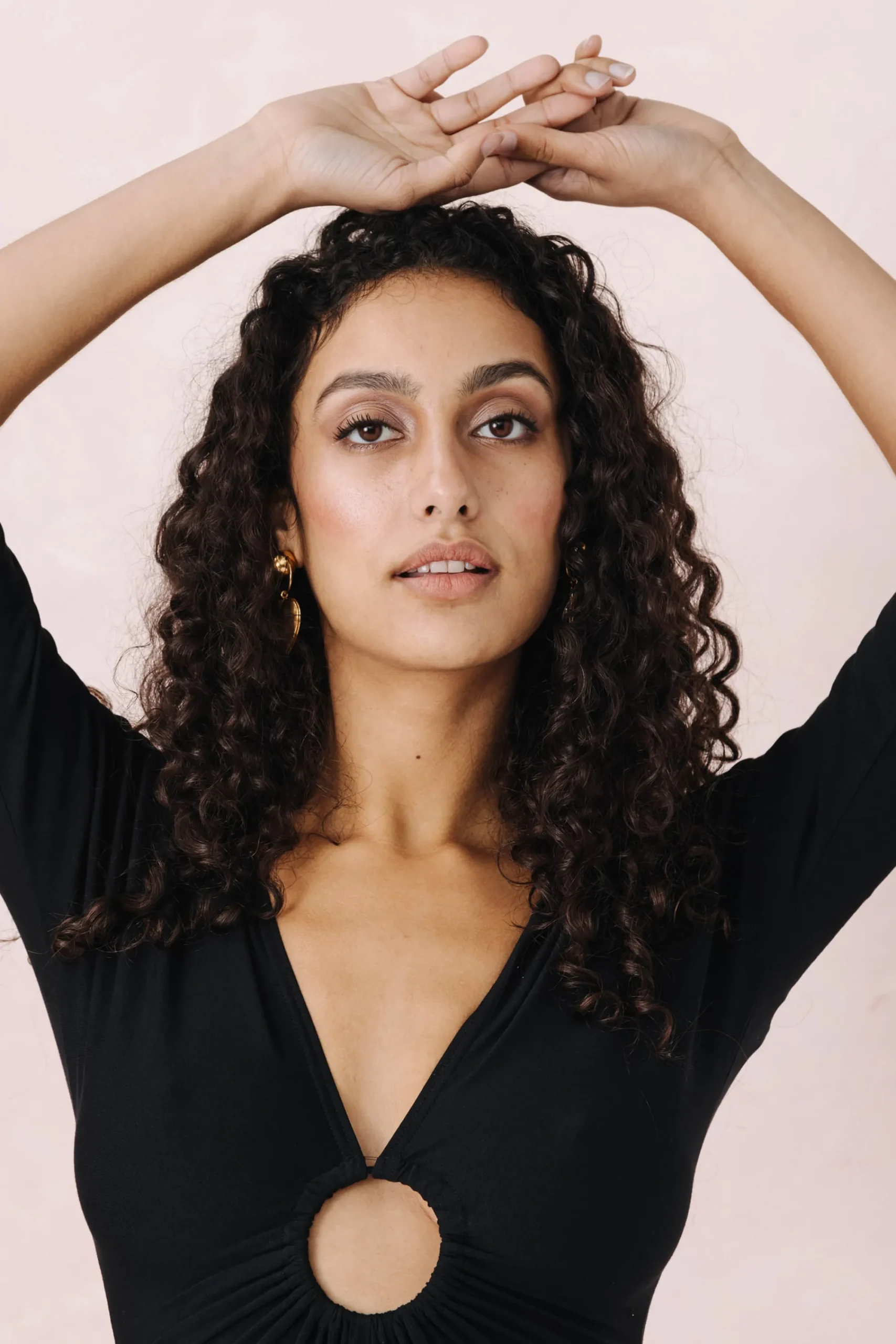 - Décolleté devant et dos orné d’un joli anneau plissé