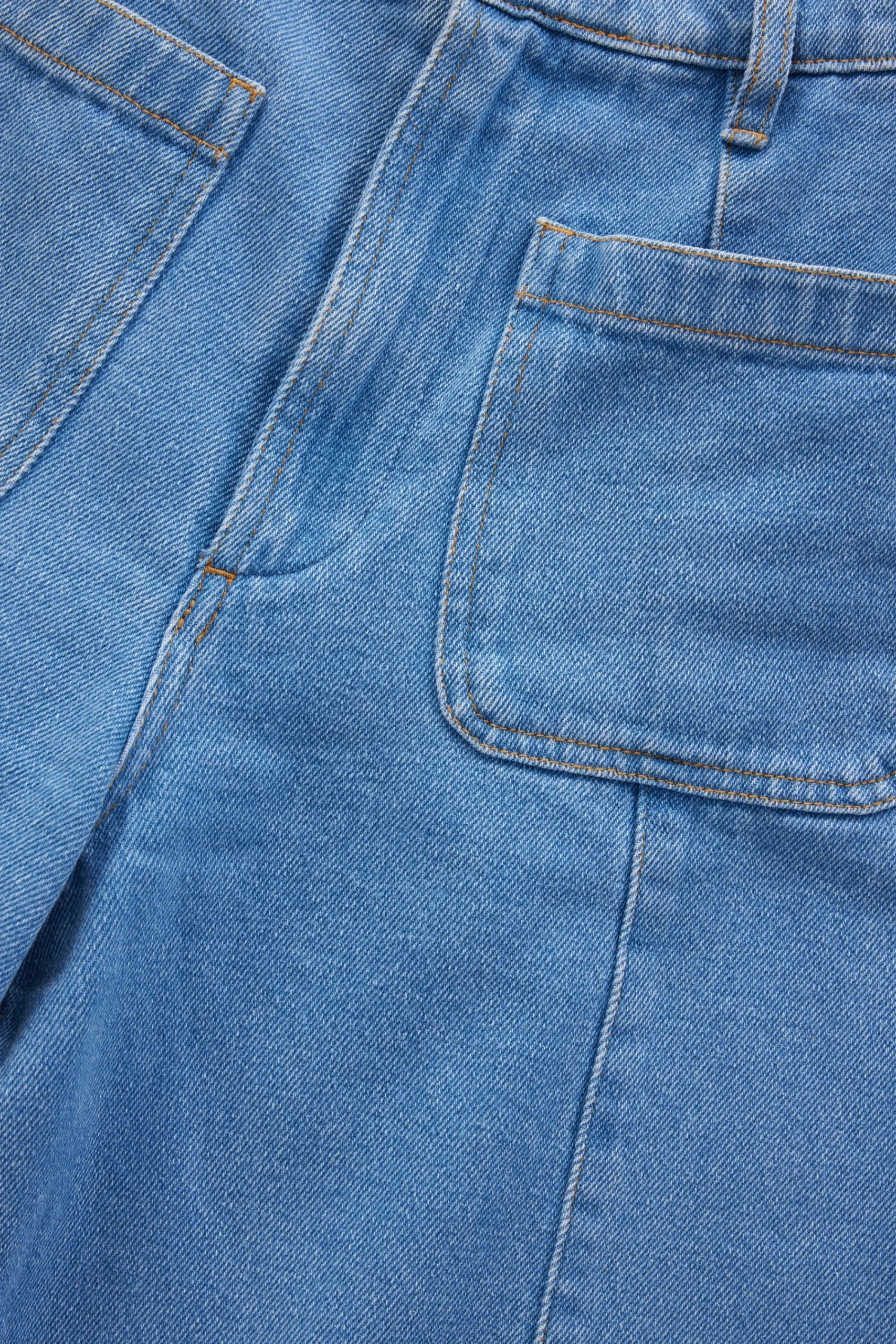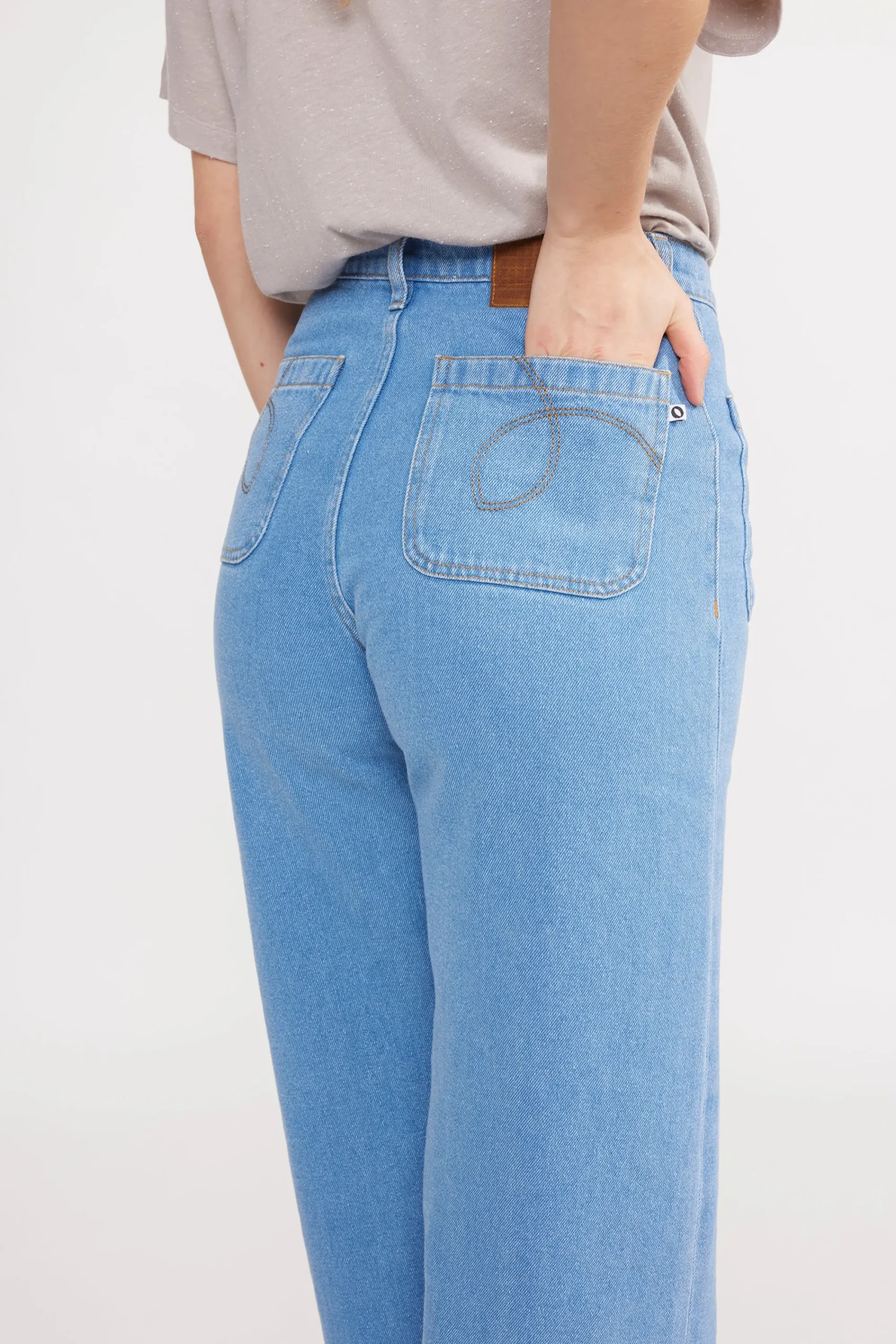 Jean taille haute, jambe évasée, longueur cheville. Deux poches plaquées sur le devant et deux poches plaquées au dos. Fermeture par un bouton jean et un zip en métal. Etiquette Jacron vegan cousue sur la ceinture dos.
