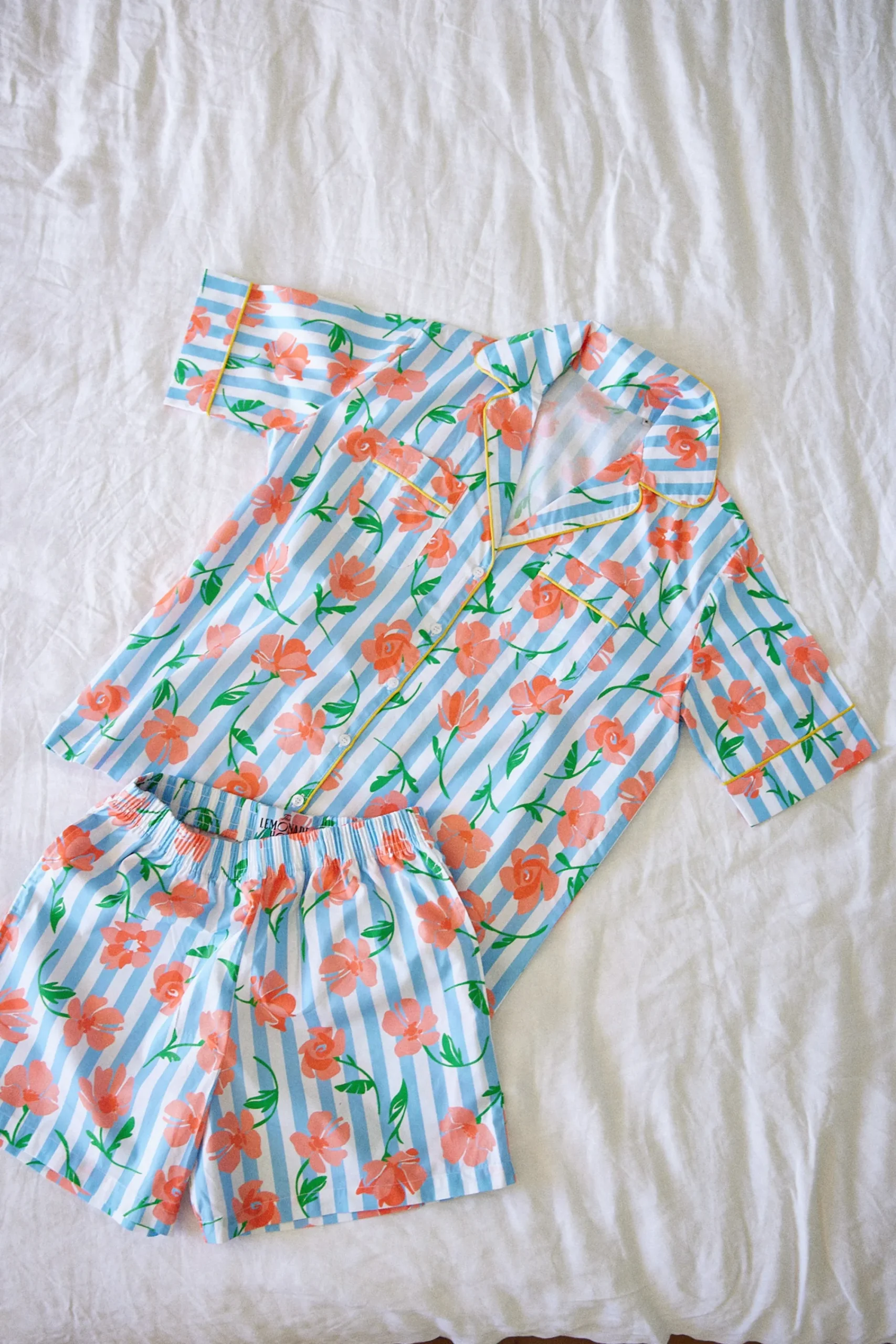 Chemisier de pyjama manche courte, col tailleur. Deux poches plaquées au niveau de la poitrine. Finitions passepoil jaune sur le col, les poignets et le haut des poches poitrine. Longueur hanche.