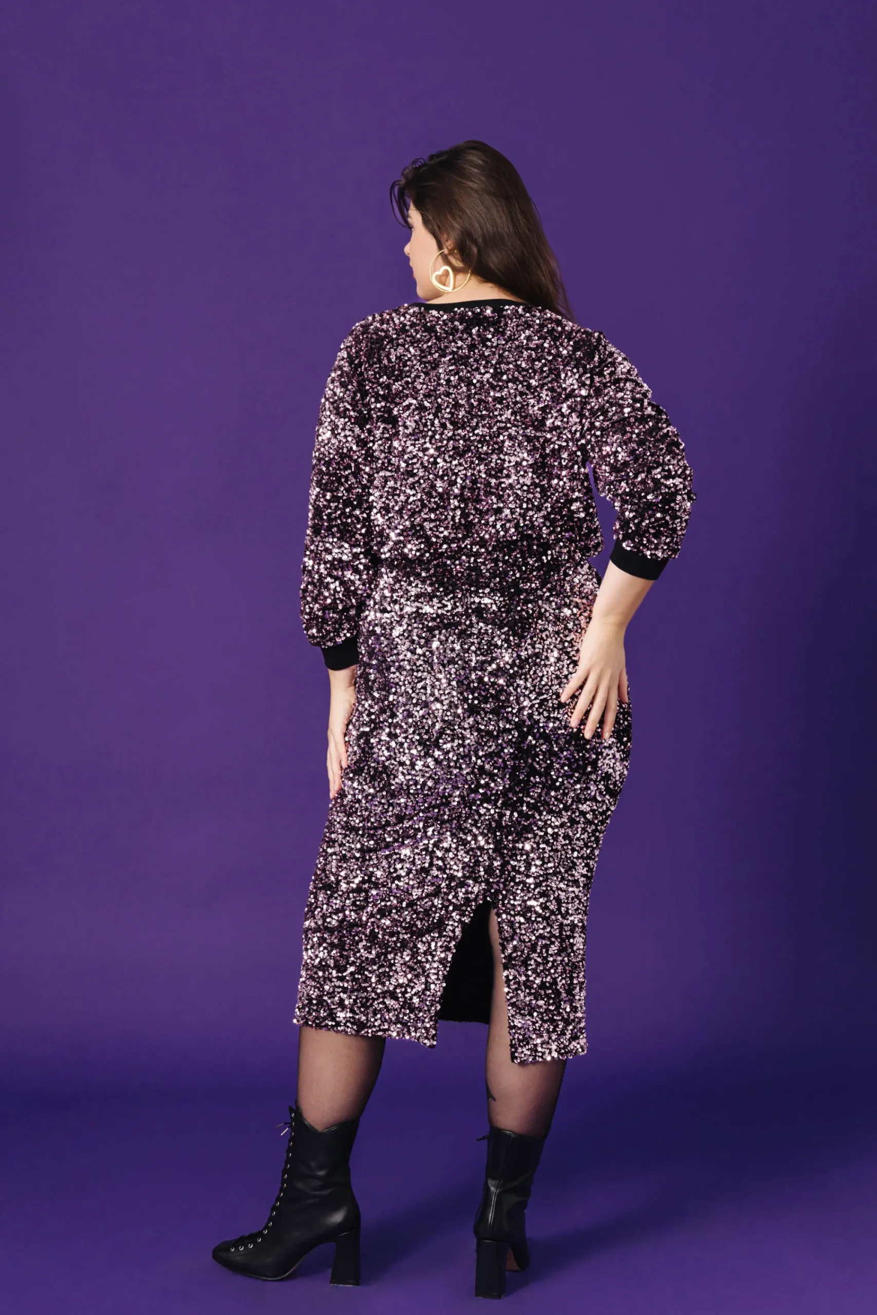 Jupe moulante en sequin stretch. Longueur midi. Ceinture intérieure en jersey doux. Fente dans le dos en bas de la jupe. Ourlet de jupe avec bande appliquée sur l’intérieur.