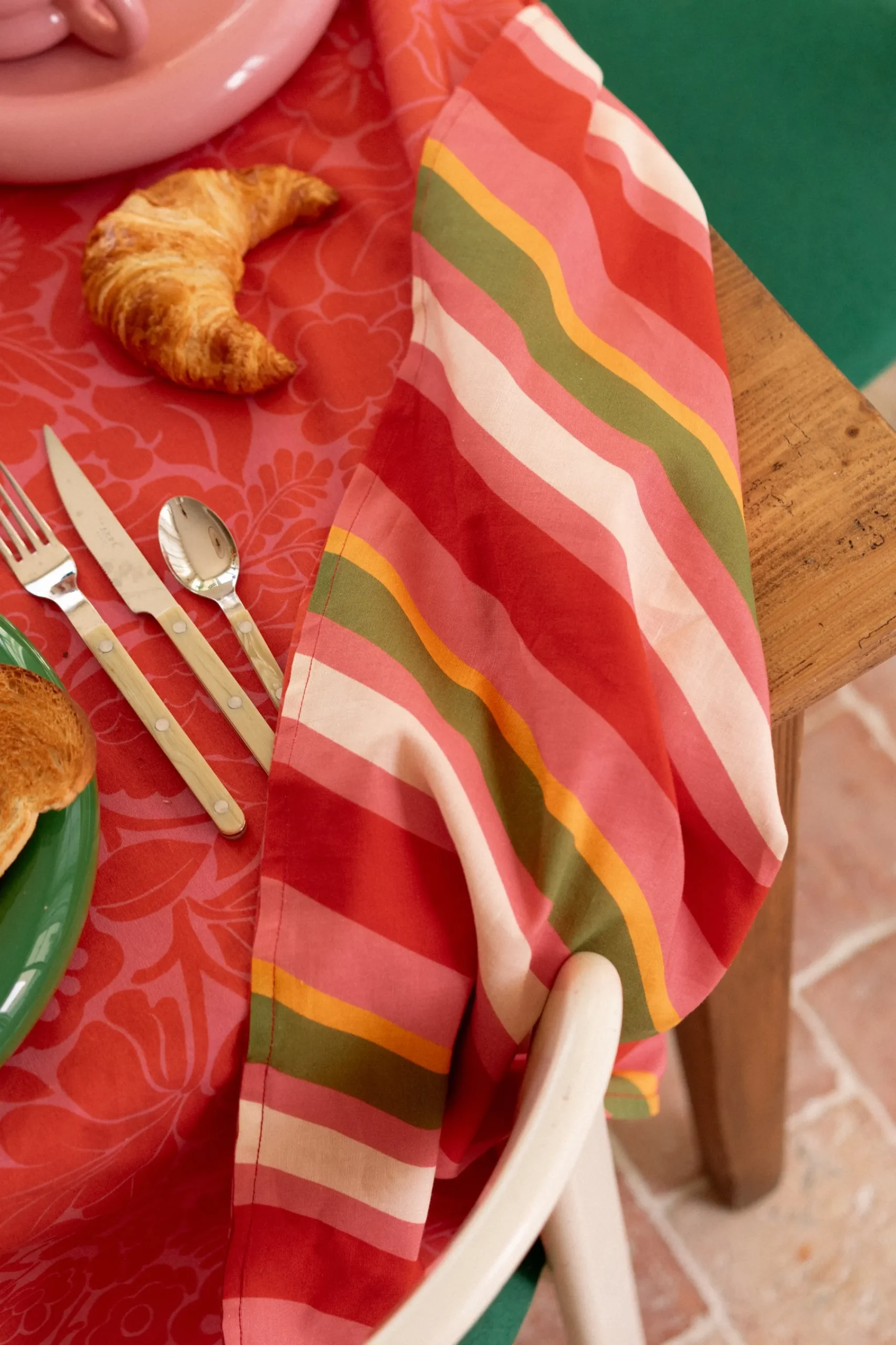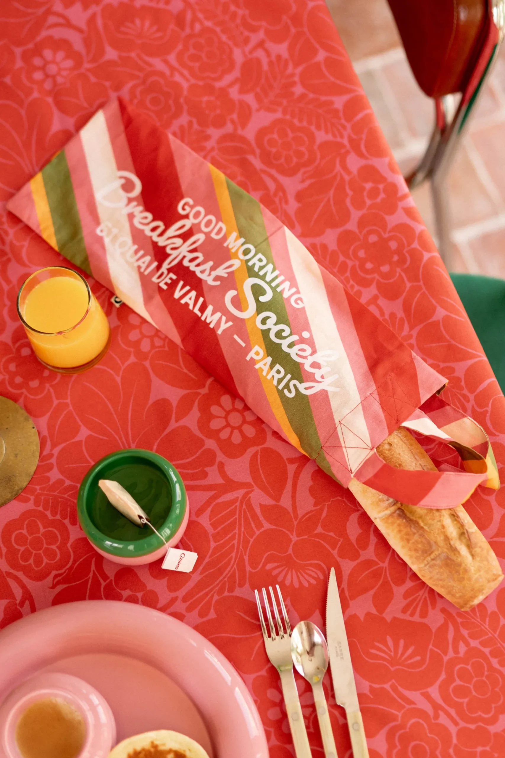 Nappe carrée réversible. Motif fleuri sur l’endroit et motif rayure multicolore en diagonale sur l’envers. Surpiqûre à 1cm sur le bord avec 1 côté ouvert pour garder la nappe à plat. Tissu fabriqué en Espagne. Nappe réversible confectionnée à Paris.