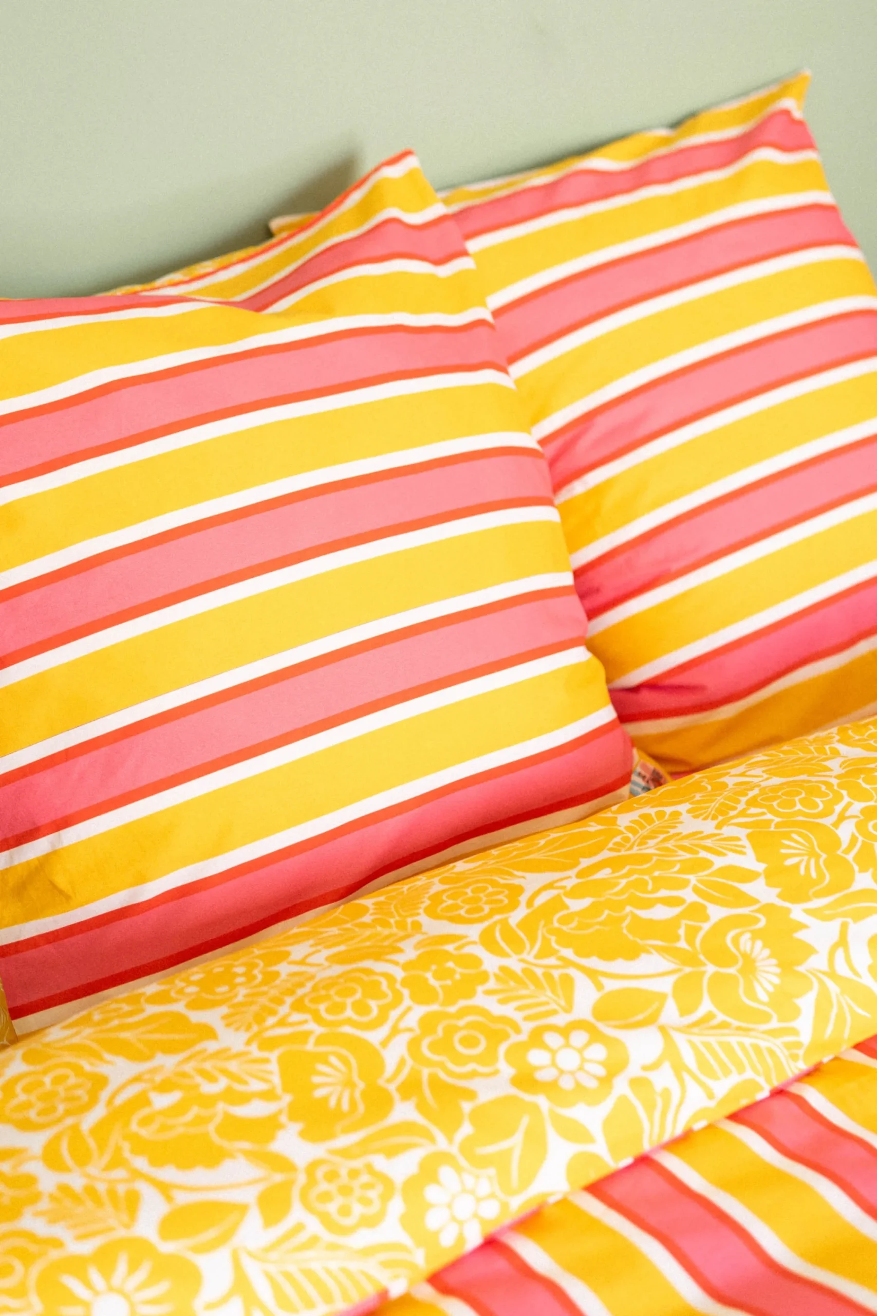Taie d’oreiller bi-motif. Motif fleuri jaune et blanc sur l’endroit, rayure rose et jaune sur l’envers.