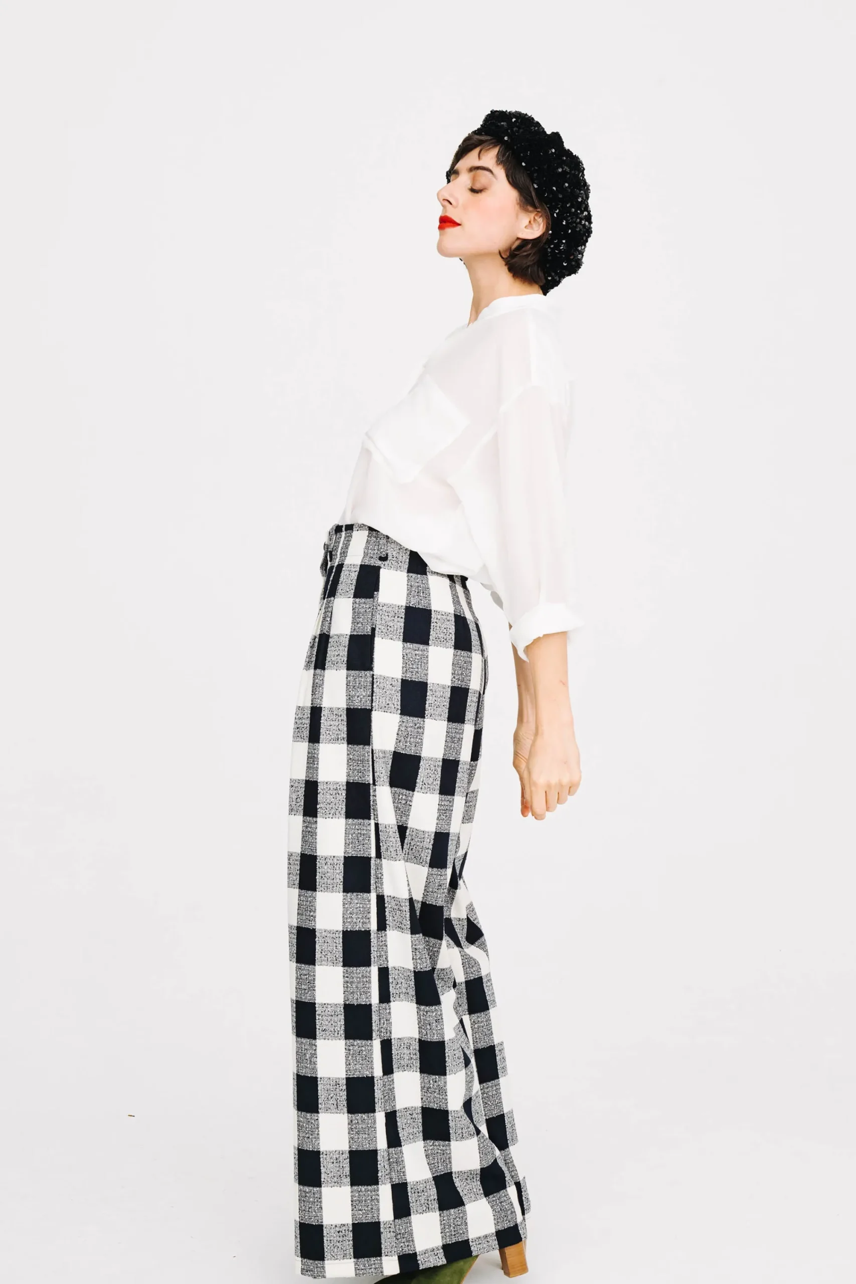Pantalon taille haute, jambes larges, avec deux grands plis piqués sur chaque jambe devant. Pinces aux dos. Passants à la taille. Enforme à l’intérieur de la ceinture finie par un biais. Fermeture devant par un zip et 1 bouton type jeans noir. Poches dans les coutures côtés.