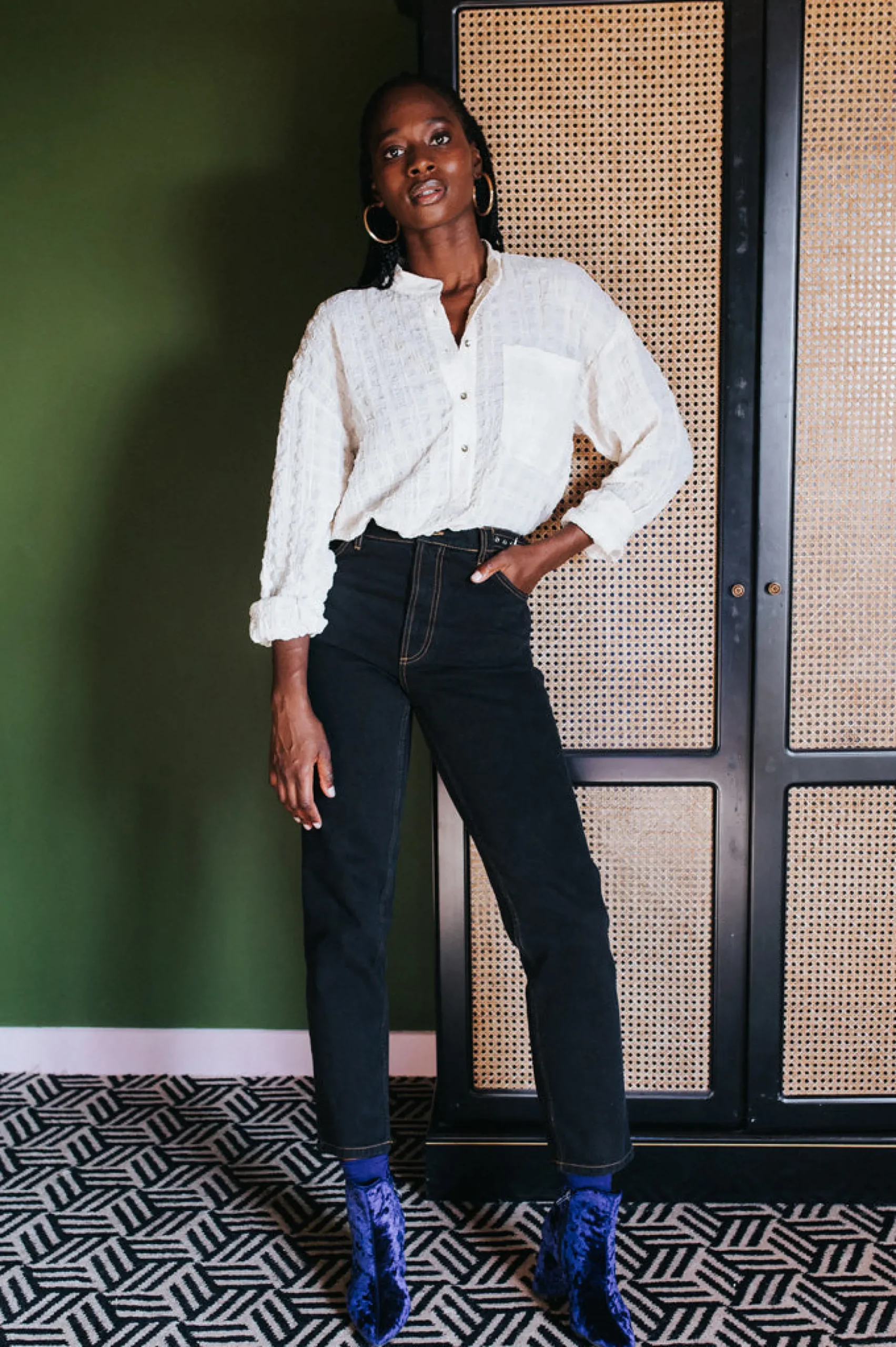 Voici Alphonse, la chemise d’atelier oversize. Avec son allure blousante et son col mao, elle réveillera l’esprit artistique qui sommeille en vous, tout en conservant un look à la fois théâtral et facile. Sa grande poche plaquée vous permettra de ranger tous vos outils, vous pouvez également retrousser ses manches lorsque l’inspiration monte. Alphonse est boutonné jusqu’au col et peut également se porter noué au nombril.