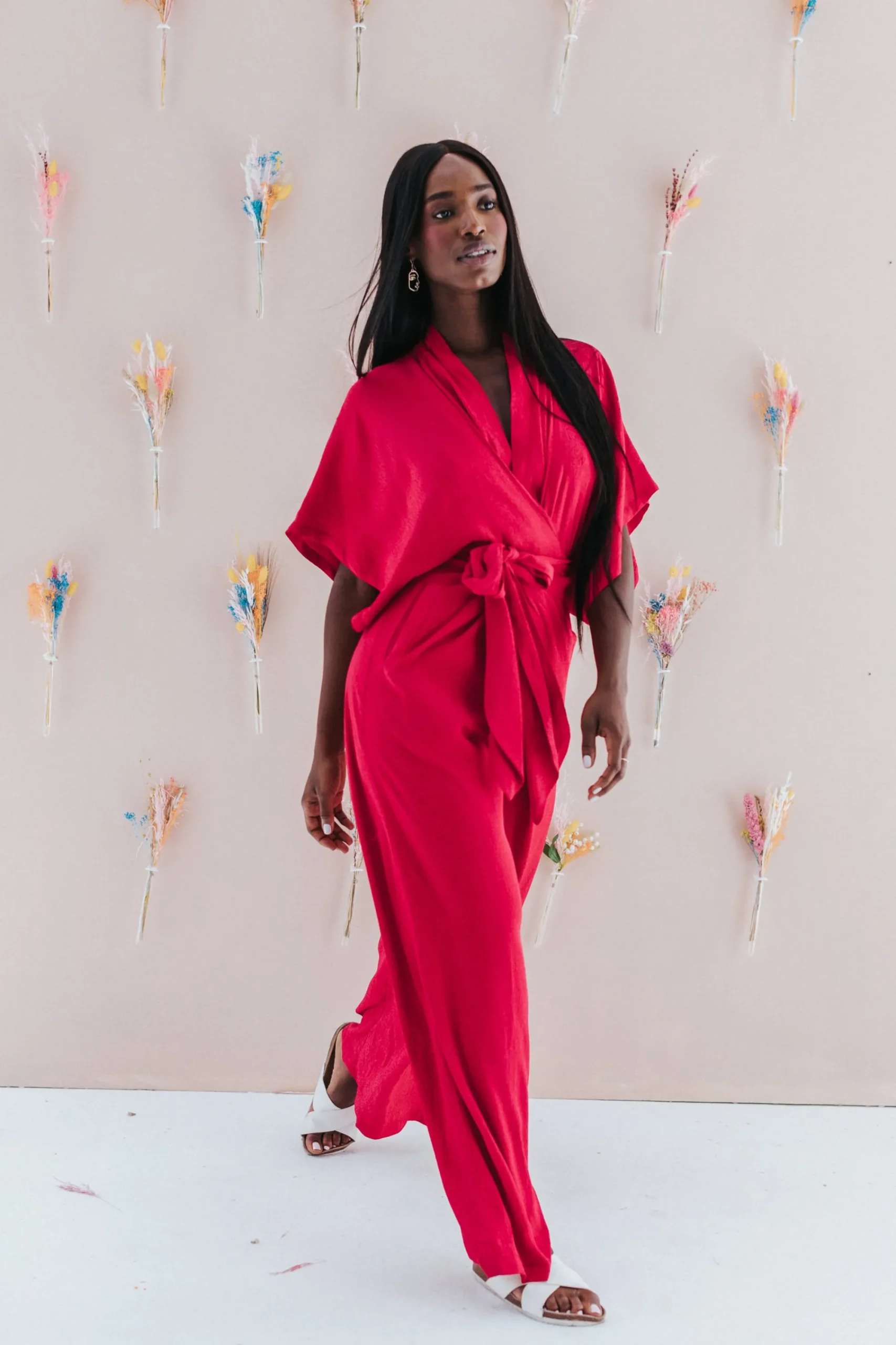 Voici Drew, l’élégance incarnée. On y retrouve le décolleté, les manches larges inspirées des kimonos, et la ceinture nouée de Bella, mélangés avec un pantalon ample, qui allonge les jambes.