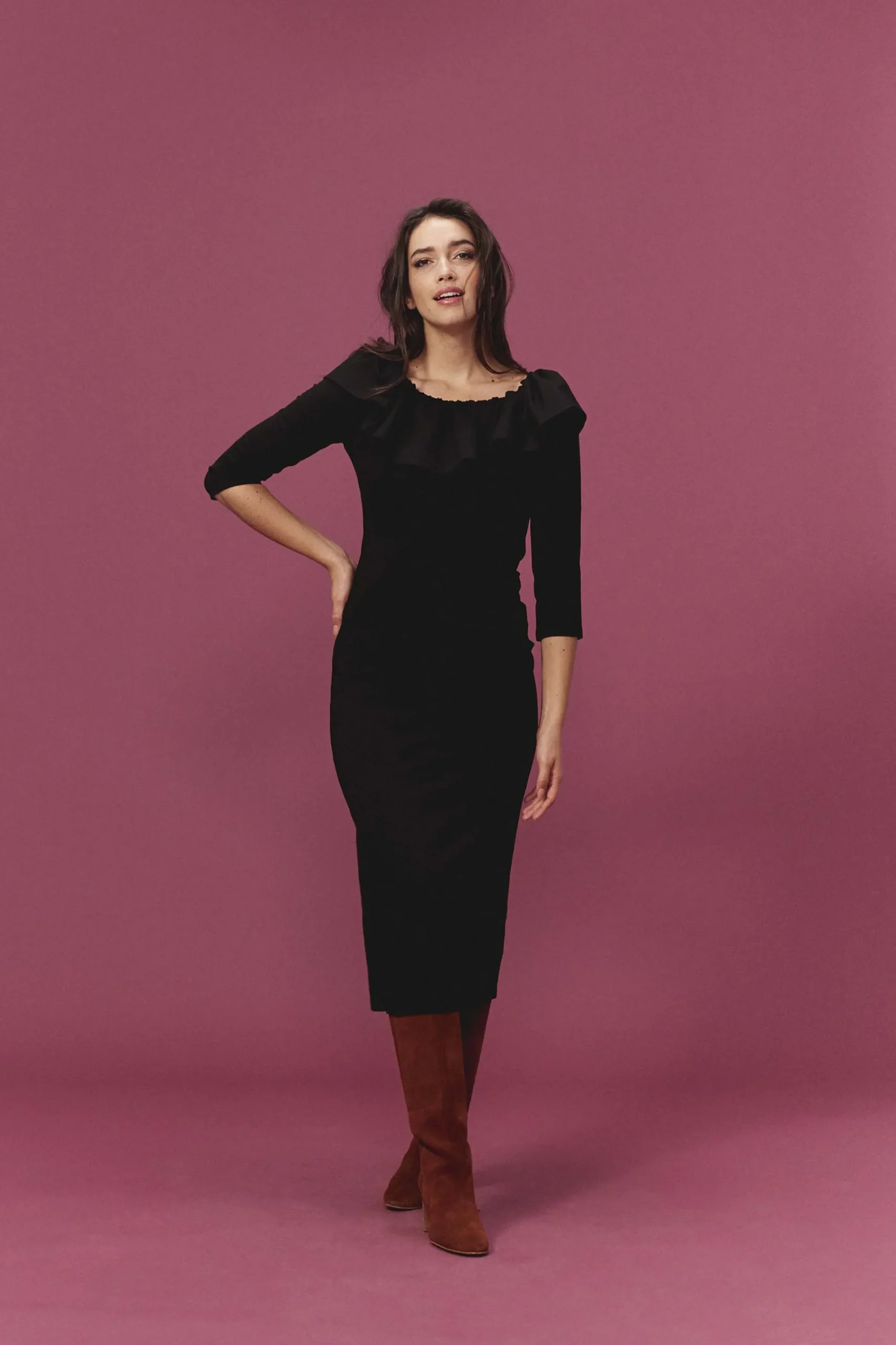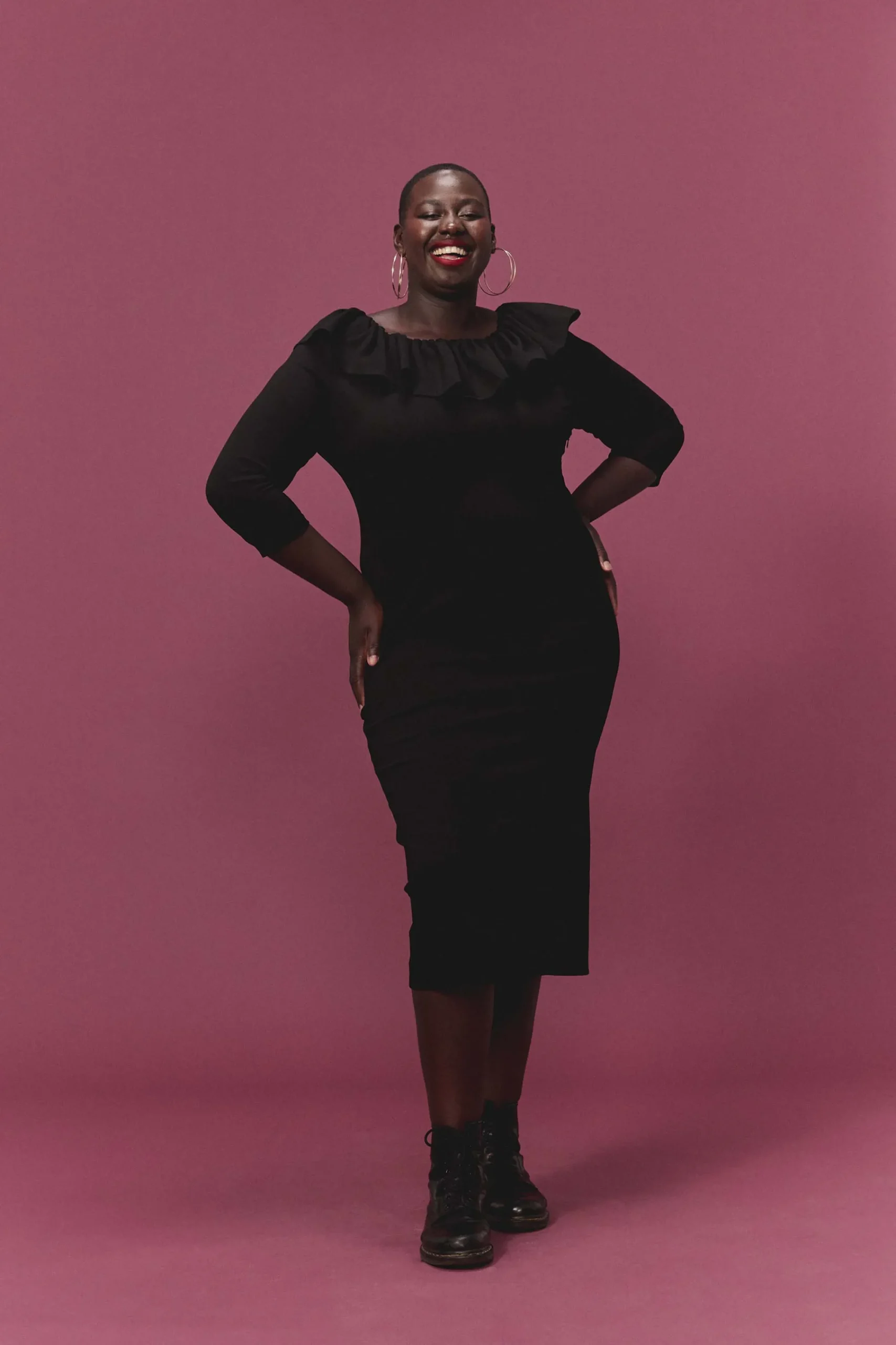 Voici Georgia, une robe près du corps, idéale pour les petites ou grandes occasions. Longue mais fendue au dos pour permettre de marcher sans soucis, elle contrebalance sa silhouette simple avec un col Pierrot XXL. Rapide à faire, même si elle cache un zip invisible sur la couture côté, il faudra un peu de patience pour les finitions de bas de col pour faire un bel ourlet invisible.