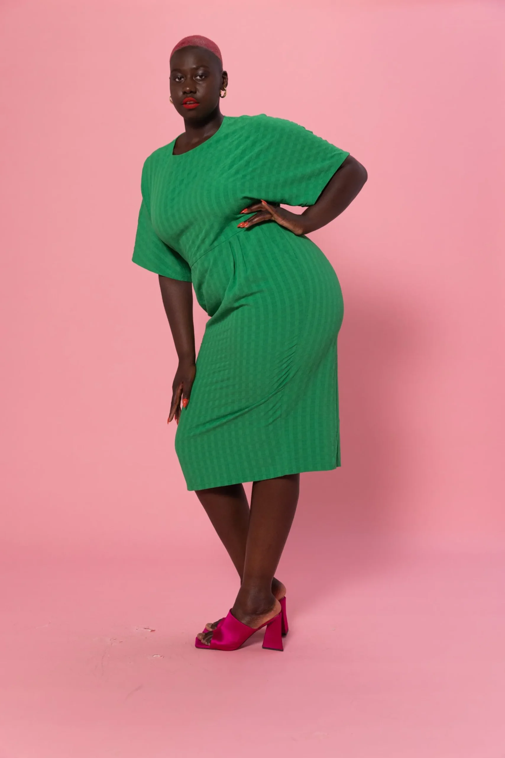 Voici Hayet, la touche élégante de votre été, avec ses lignes simples et ses manches chauve-souris. Du bureau à la garden party, elle saura se prêter à toutes les occasions. Légèrement près du corps au niveau de la jupe, elle n’en reste pas moins confortable avec ses plis qui aident à avoir de l’aisance, sa fente en bas de jupe pour la démarche et ses grandes poches, toujours indispensables.