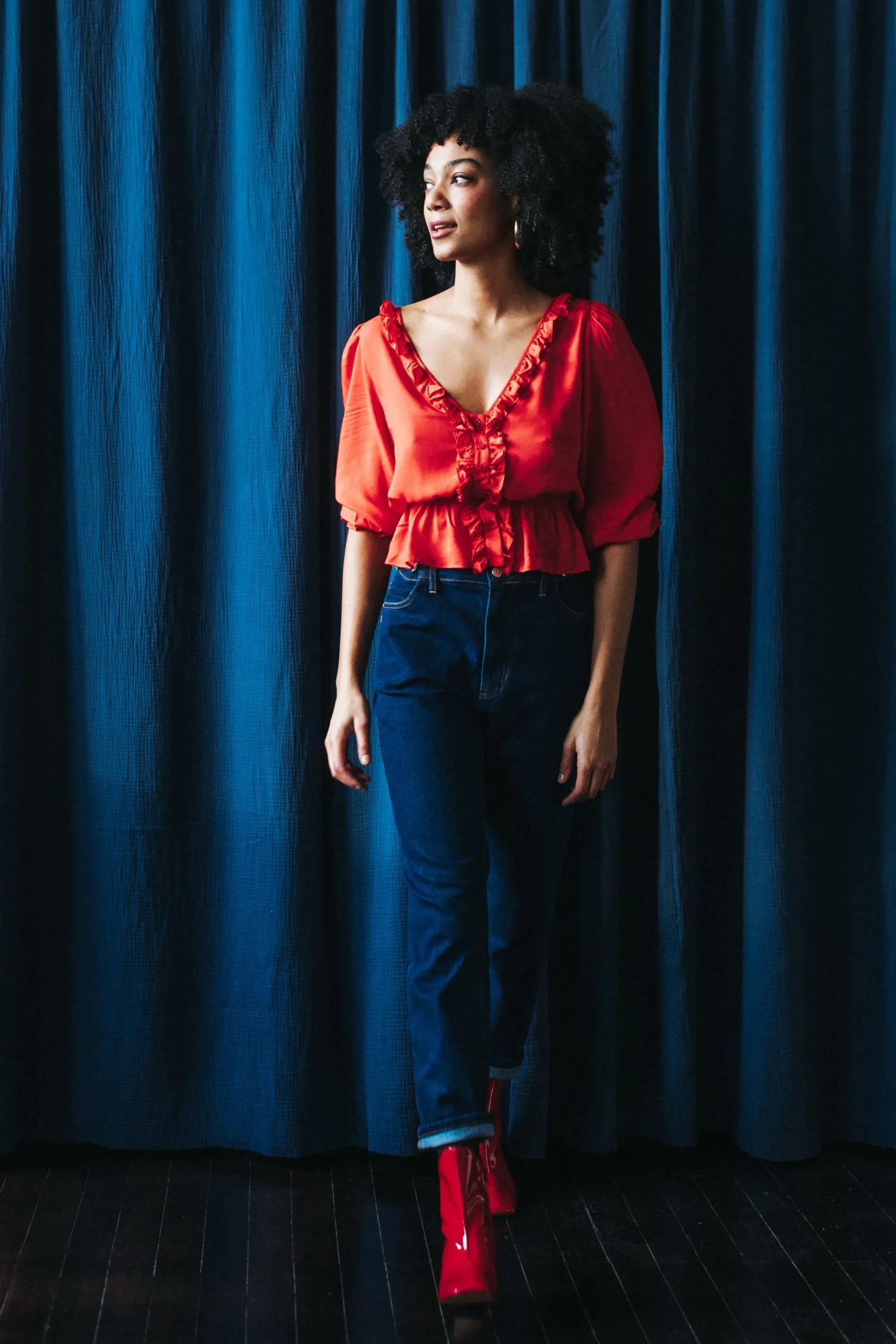 Voici Romy, la blouse un peu fleur bleue mais pas trop, avec son joli décolleté plongeant. Ses détails de volants à l’encolure mettent en valeur, et les fronces aux manches ajoutent une touche délicate.