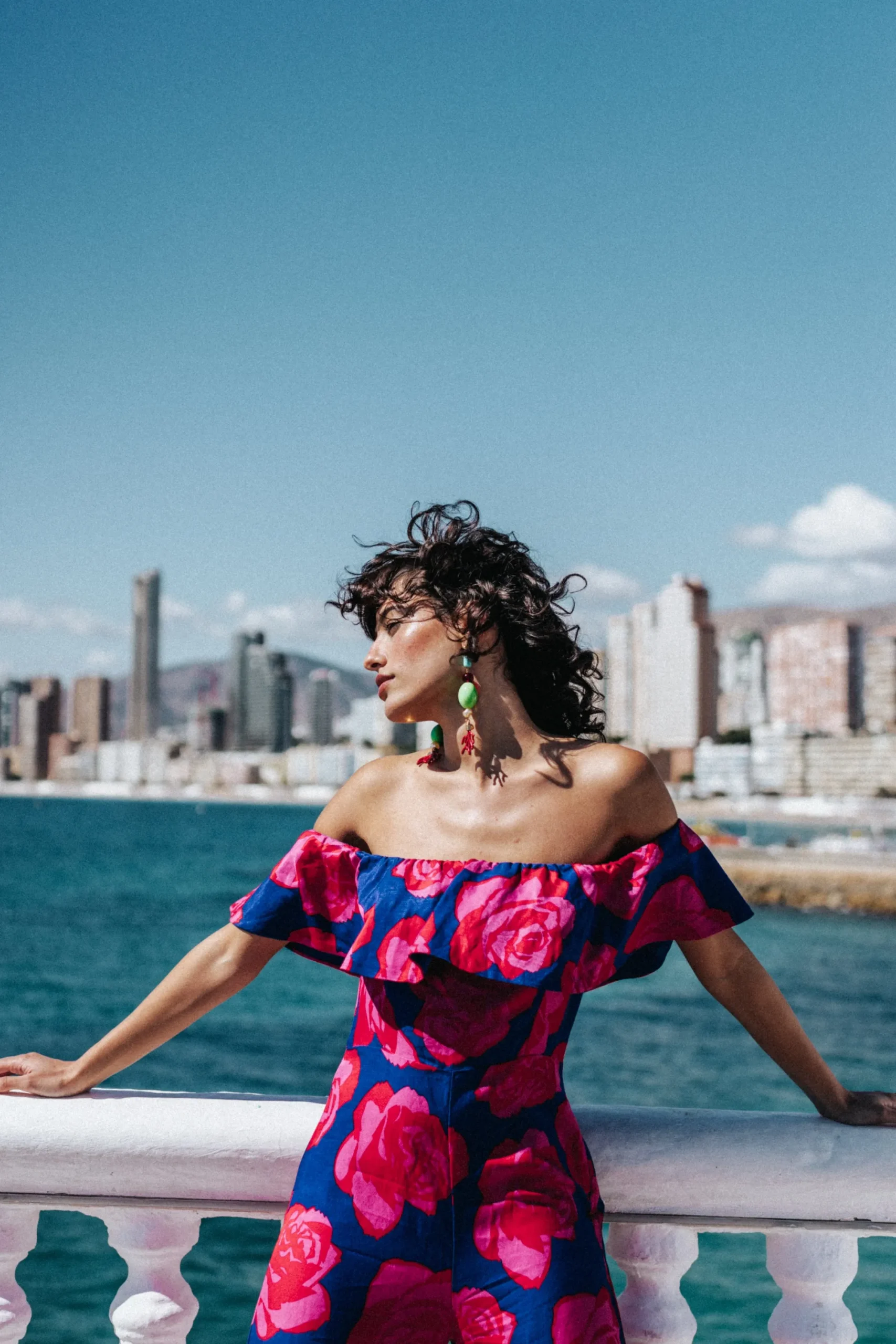Combinaison avec épaules dénudées. Grand volant couvrant le haut des bras avec un élastique caché et une doublure ton sur ton. Coupe près du corps au niveau du buste et jambes larges. Matière avec léger relief. Zip invisible sur le côté. Deux poches plaquées sur les fesses.