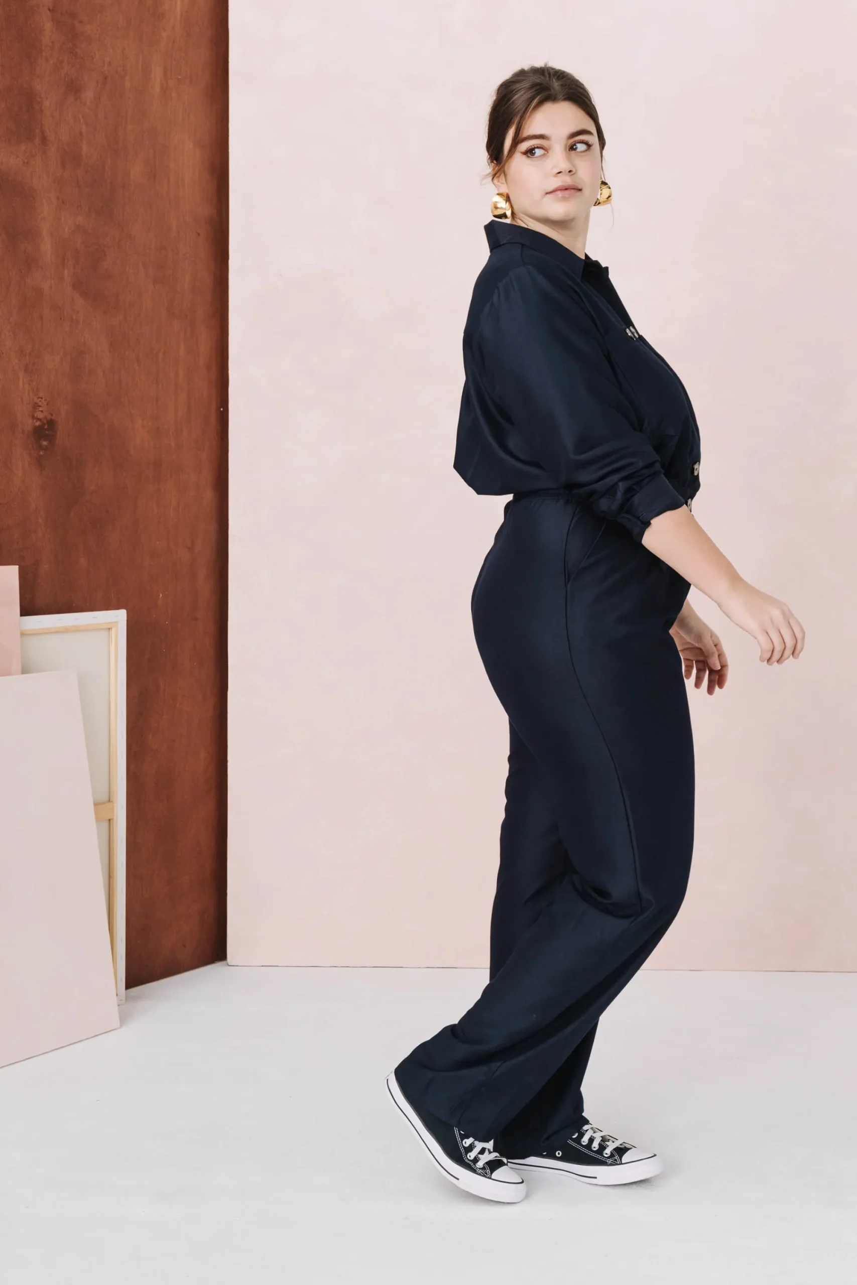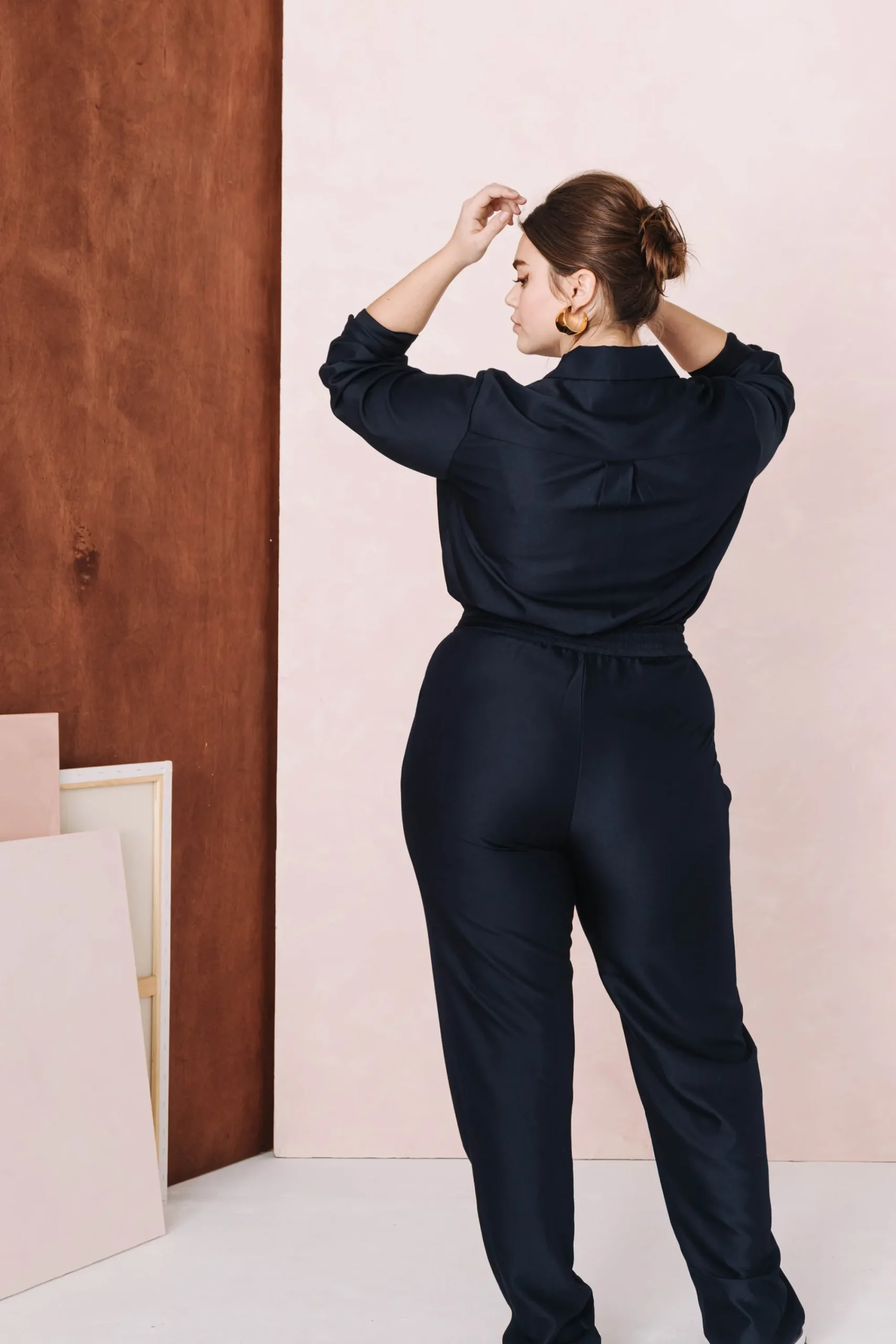 Combinaison pantalon, manches longues, col cavalier. Fermeture devant par une série de boutons jusqu’à la taille. Deux grandes poches poitrine plaquées, fermées par un bouton.