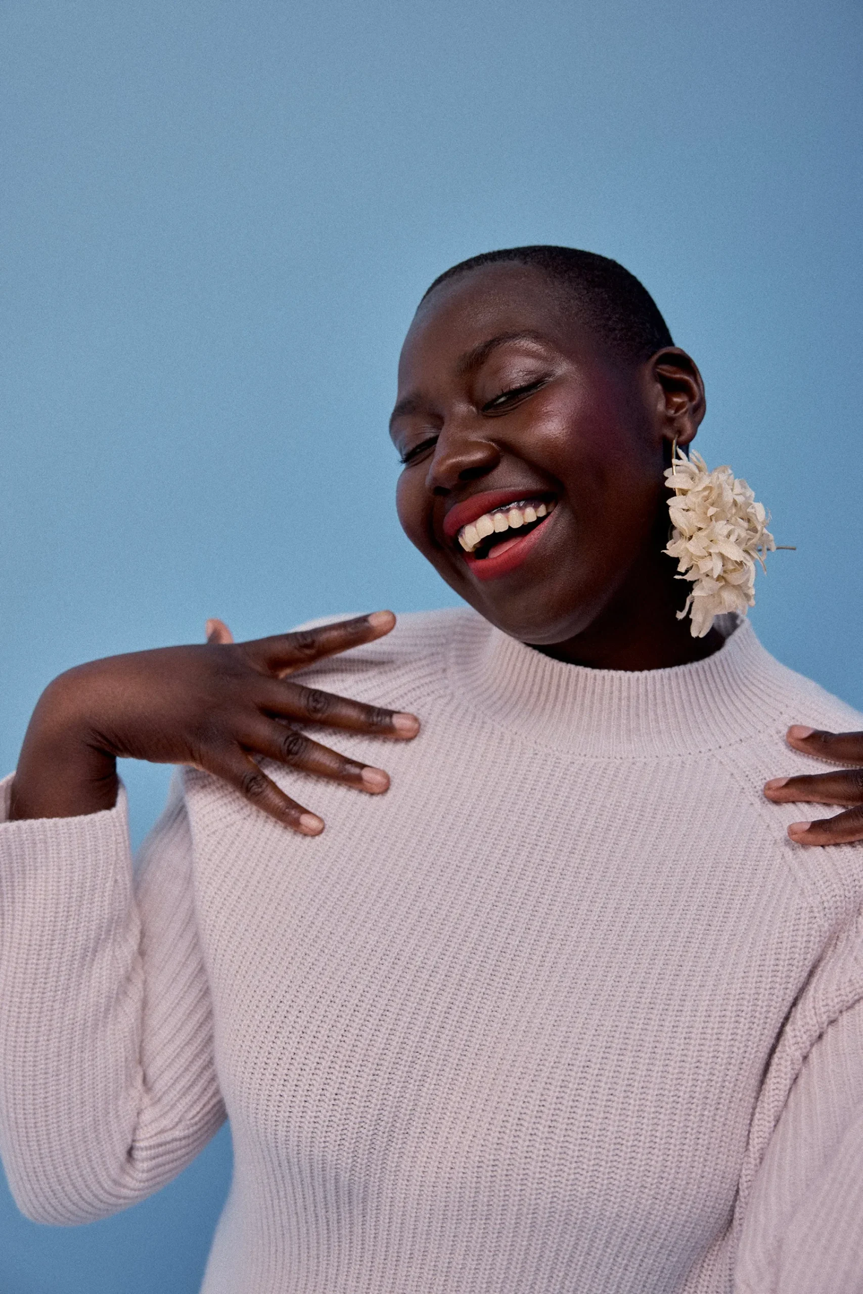 Robe pull coupe large, longueur cheville. Col cheminée. Manche raglan. Deux fentes sur les côtés.