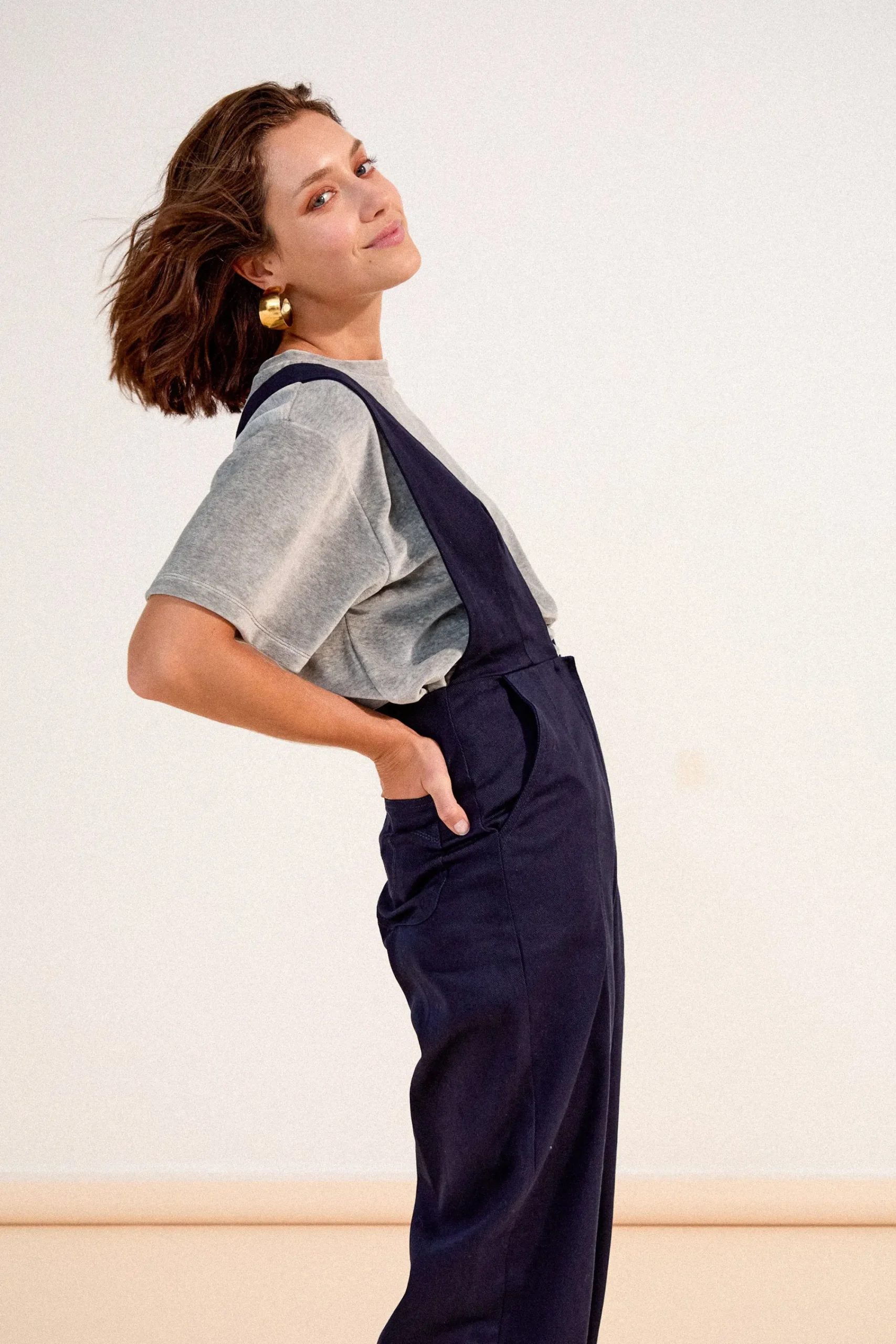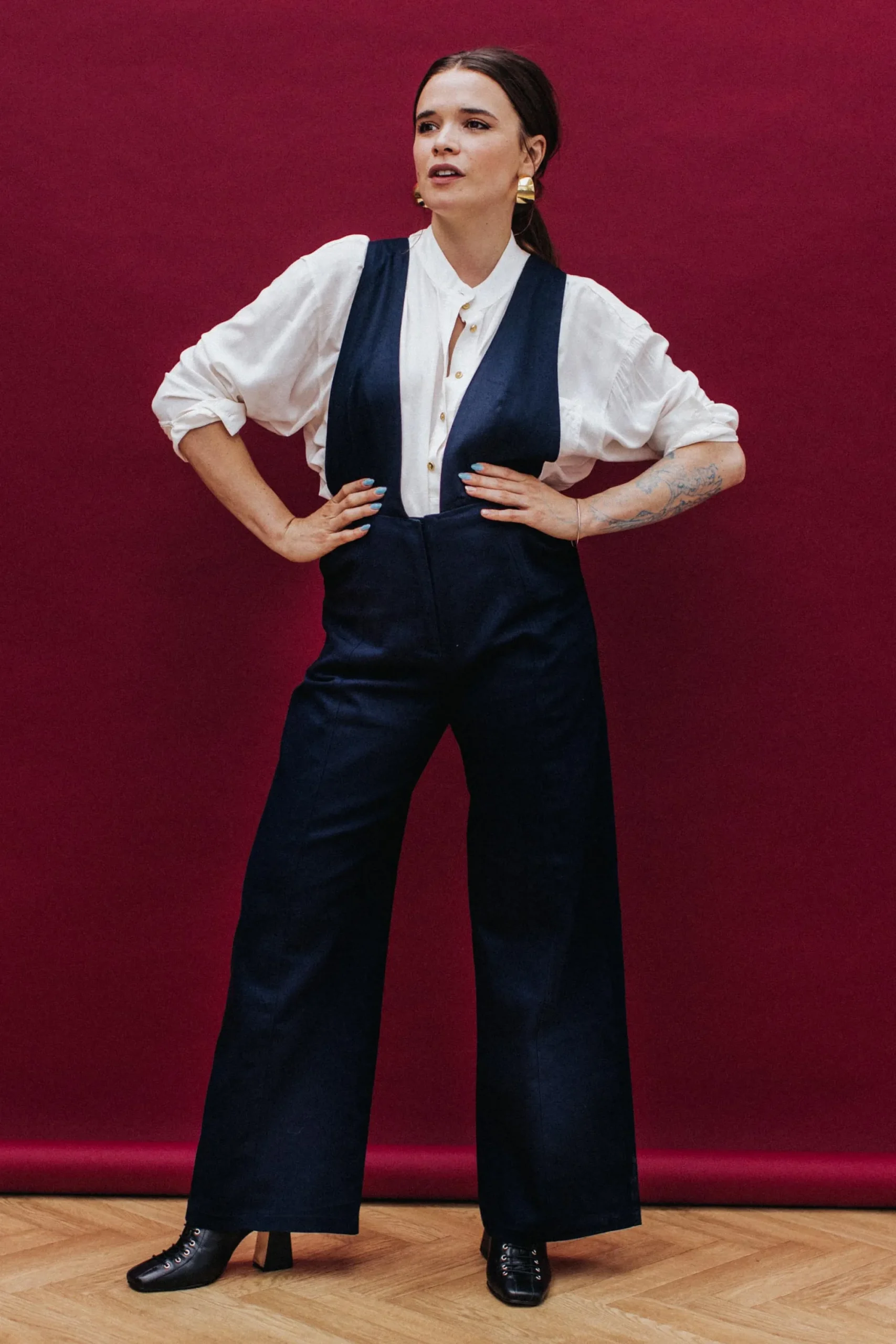 Salopette à deux grandes bretelles ajustables couvrant la poitrine. Taille haute, fermeture sur le devant à l’aide d’un zip et de deux crochets plats. Jambes longues et légèrement évasées.