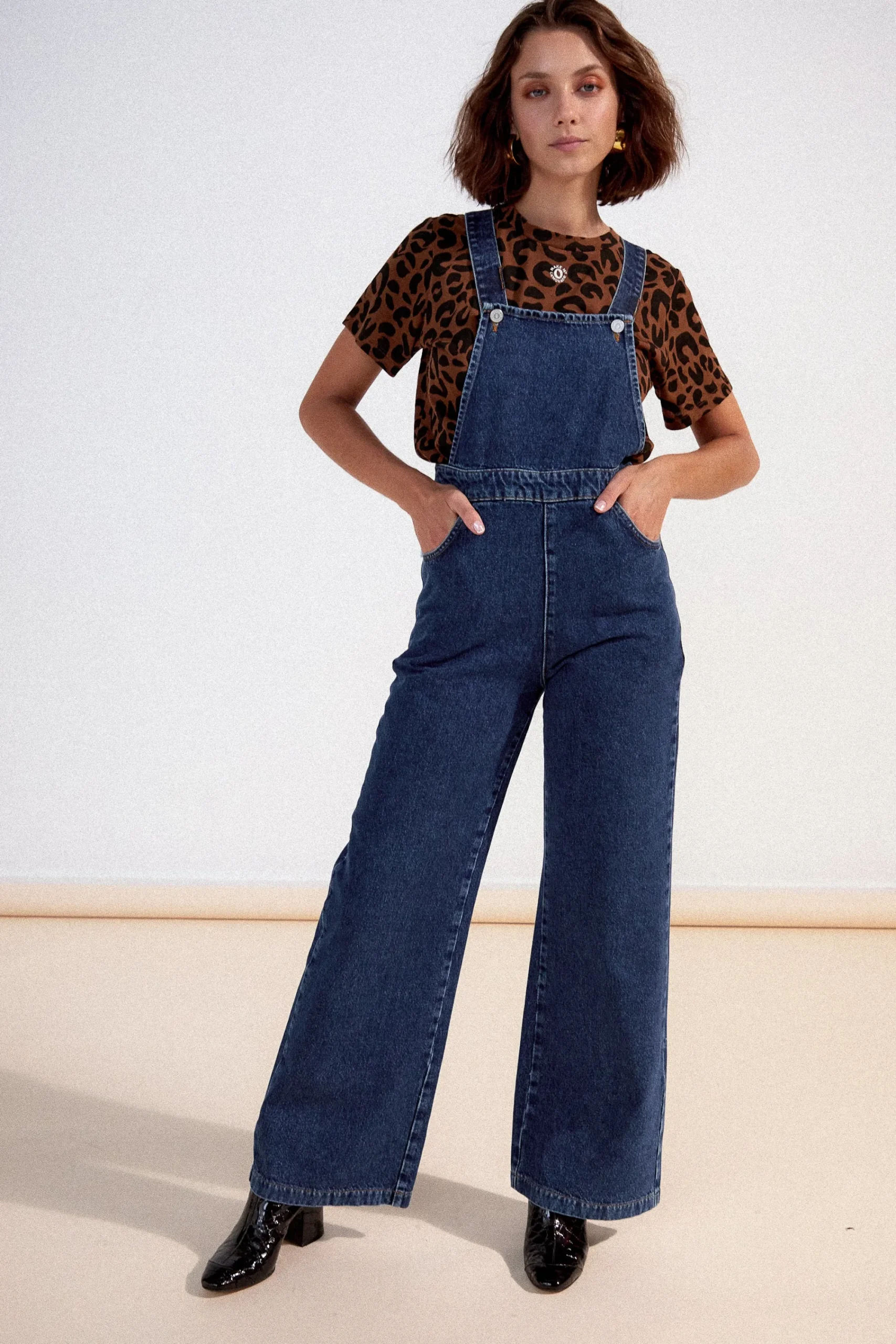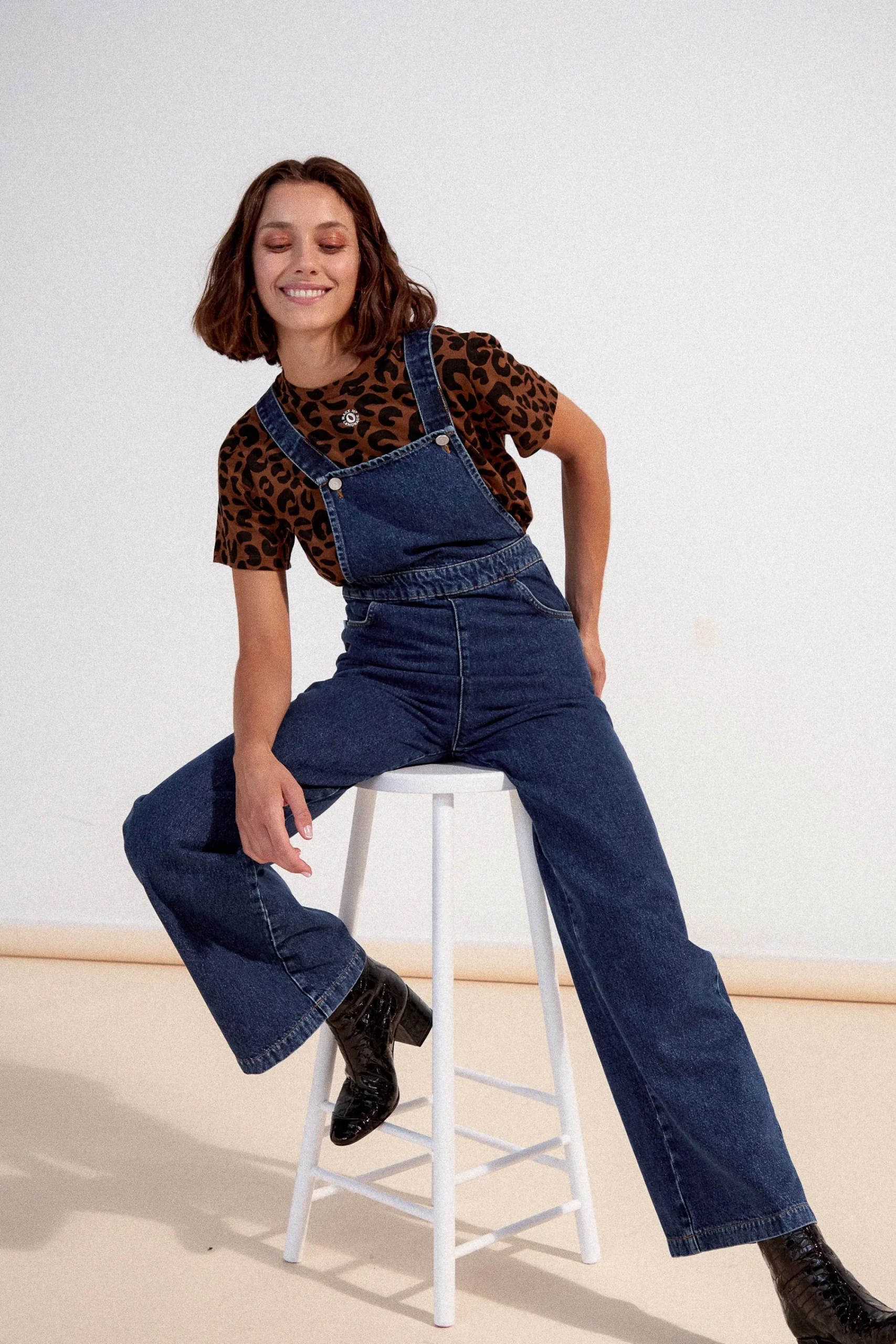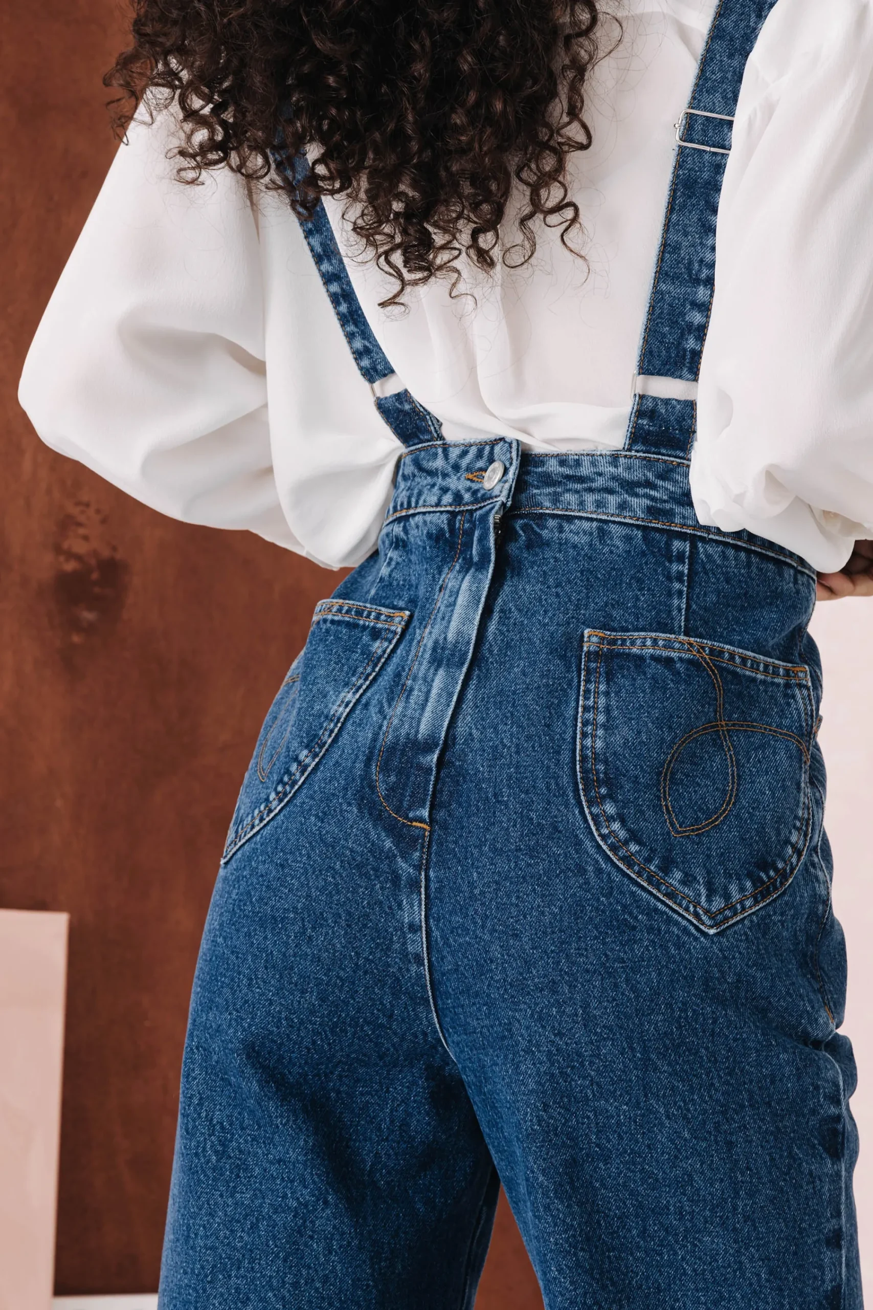 Salopette taille haute, petite bavette devant, jambes légèrement évasées. Deux pinces au dos afin de galber les fesses. Poches quart de rond sur le devant et poches plaquées au dos. Fermeture par un zip et un bouton au dos. Bretelles ajustables, maintenues par un bouton au niveau de la bavette.