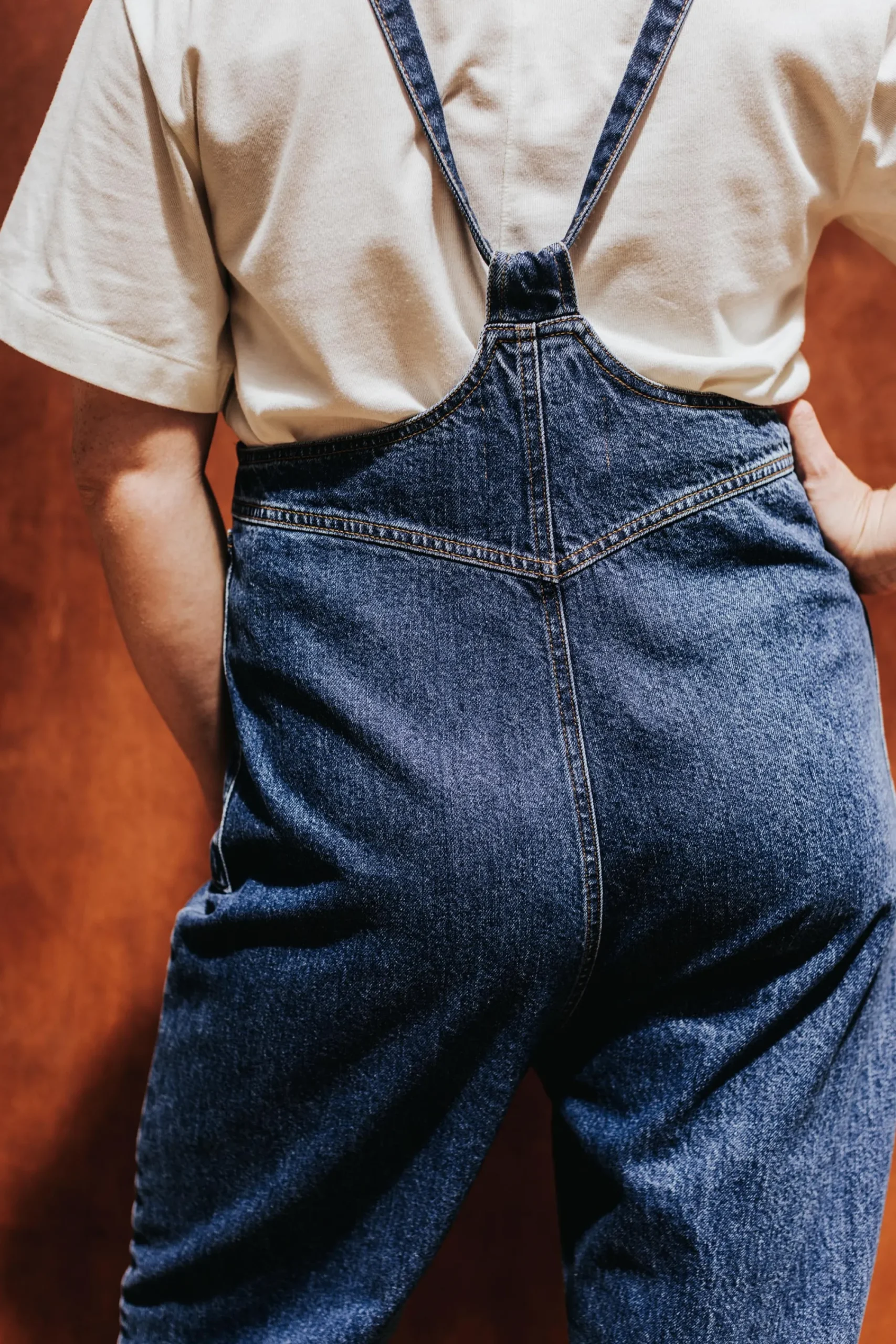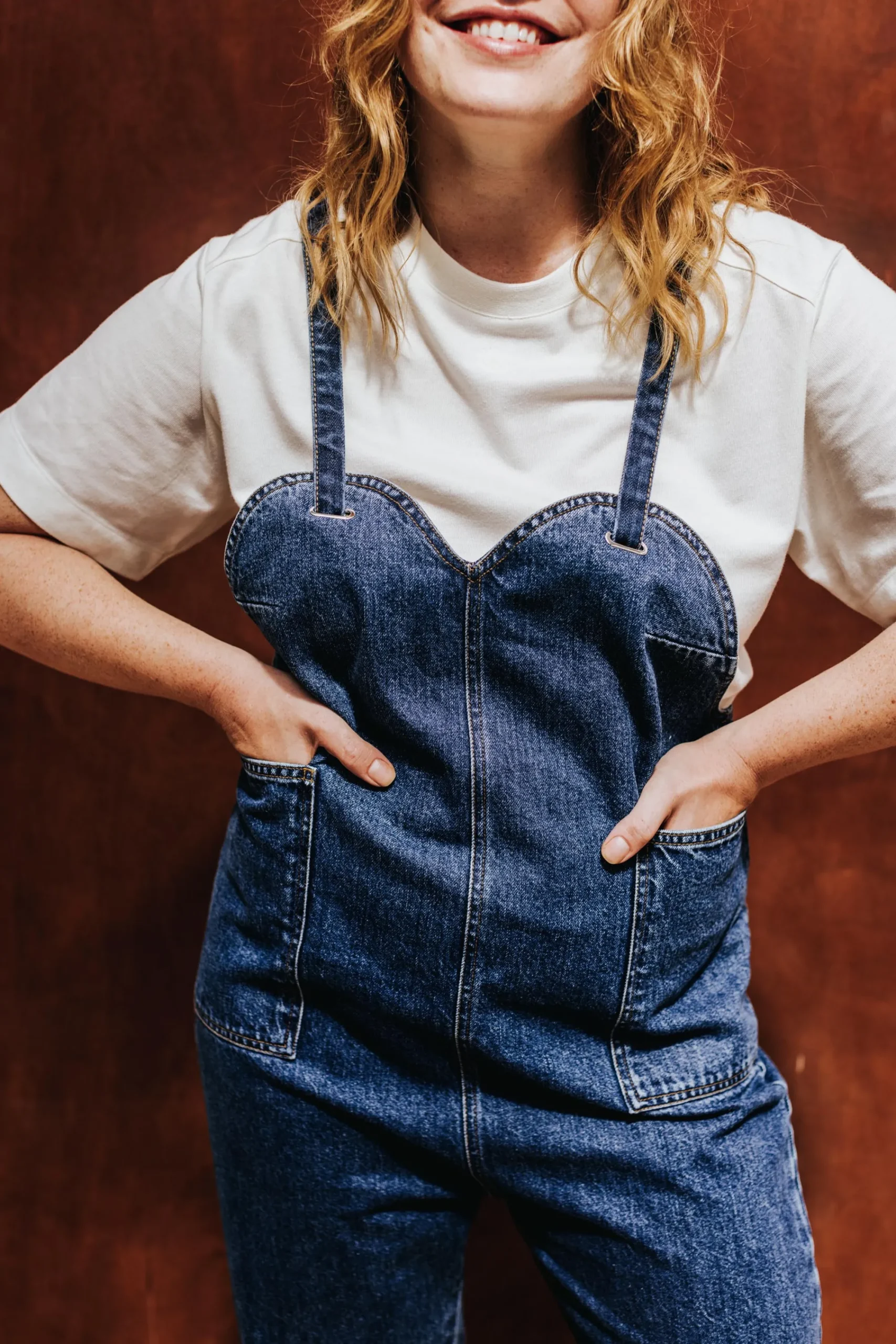 Salopette large, avec bavette devant en forme de coeur. Deux poches plaquées sur les côtés devant. Bretelles ajustables à nouer qui passent à travers un anneau ovale. Longueur jambe cheville.