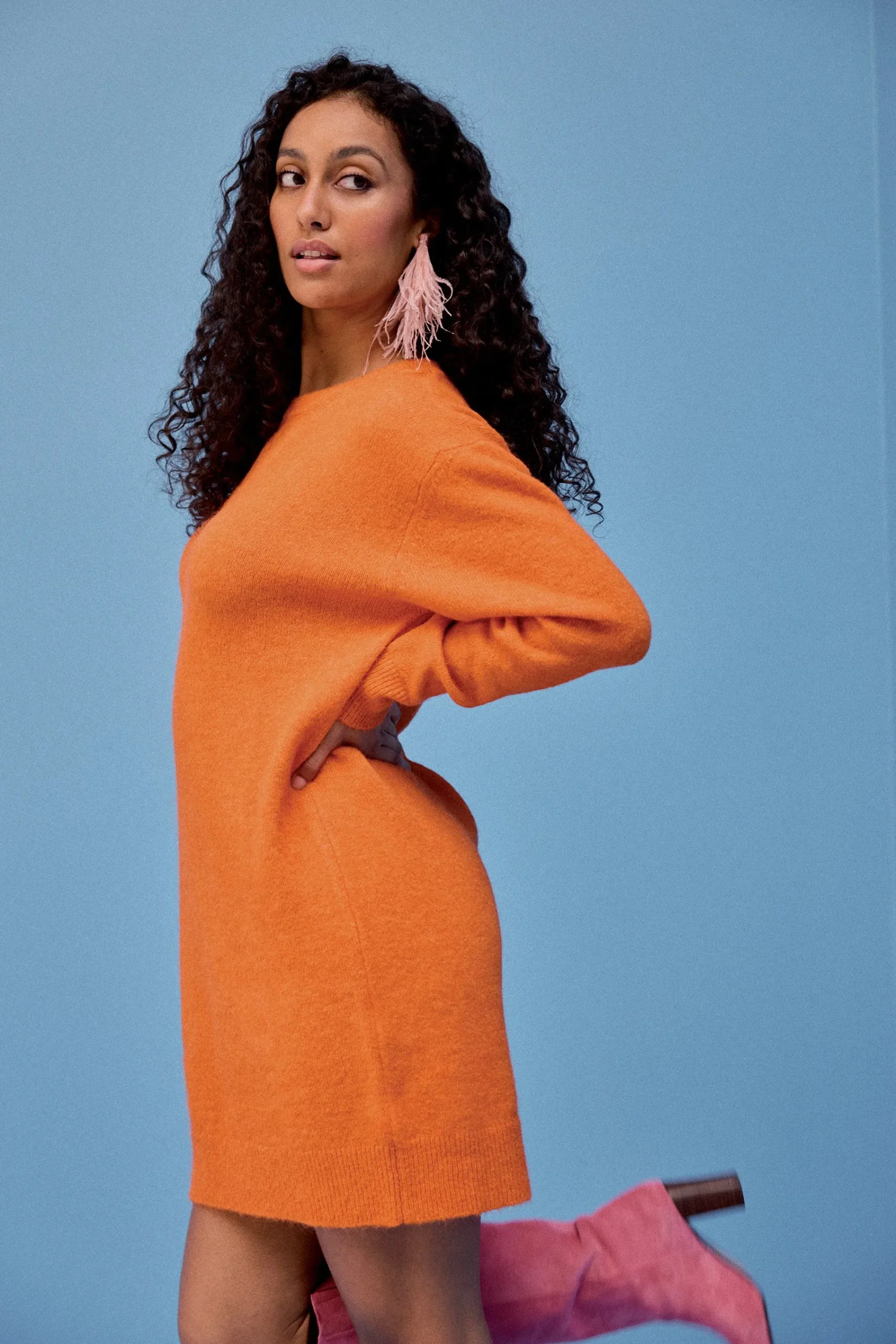 Robe pull ample longueur au dessus du genou. Manches longues. Encolure ronde. Bord-côte au niveau du col, des poignets et du bas.