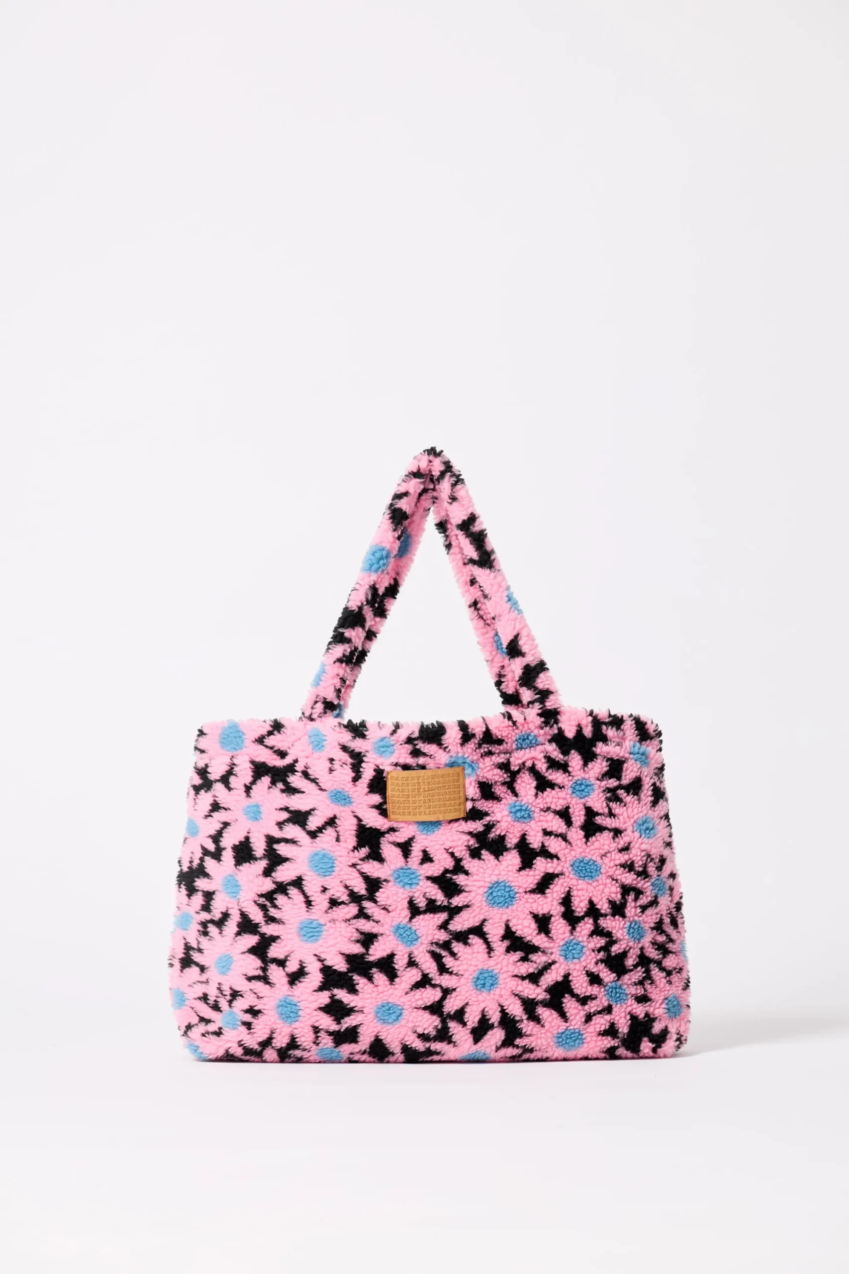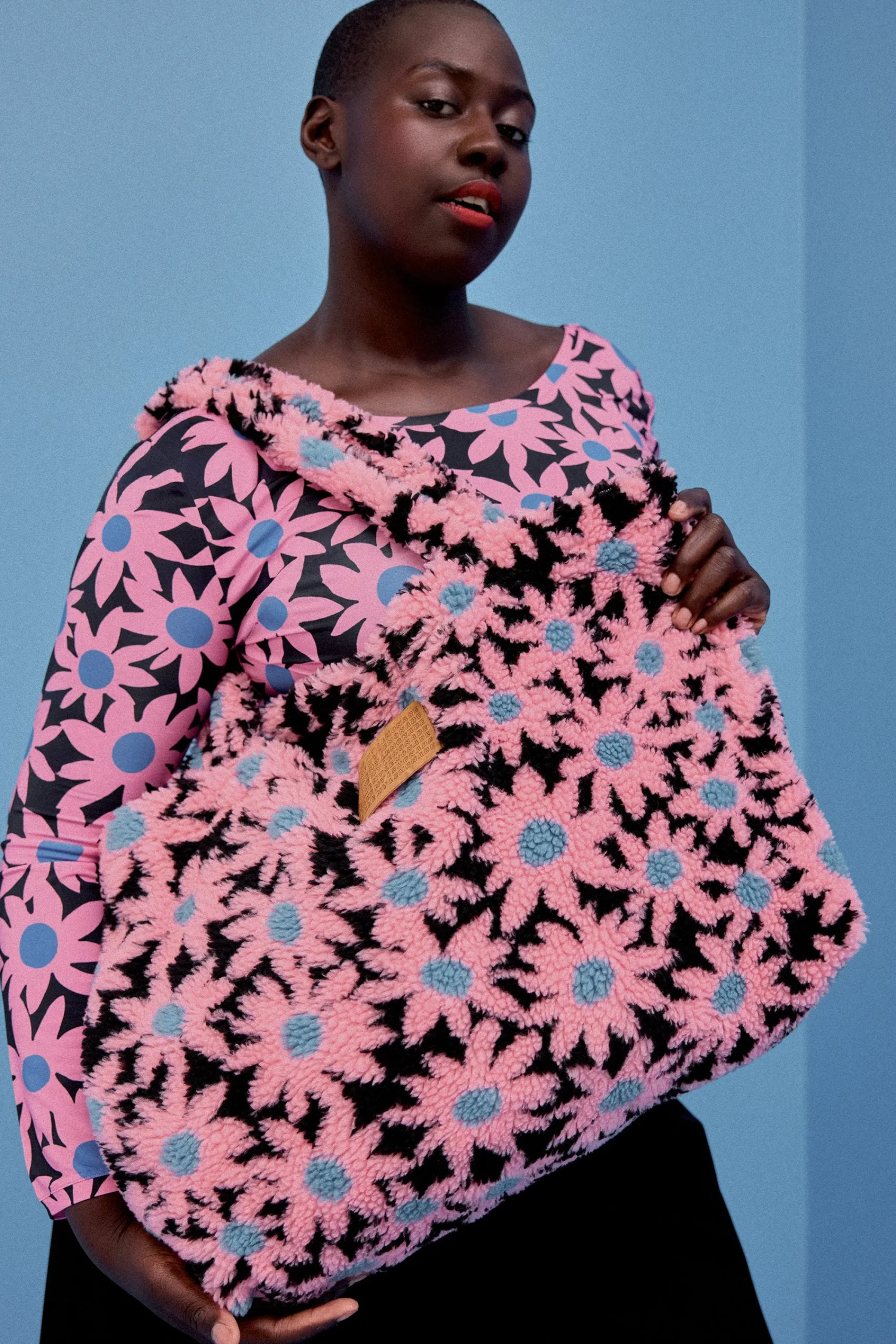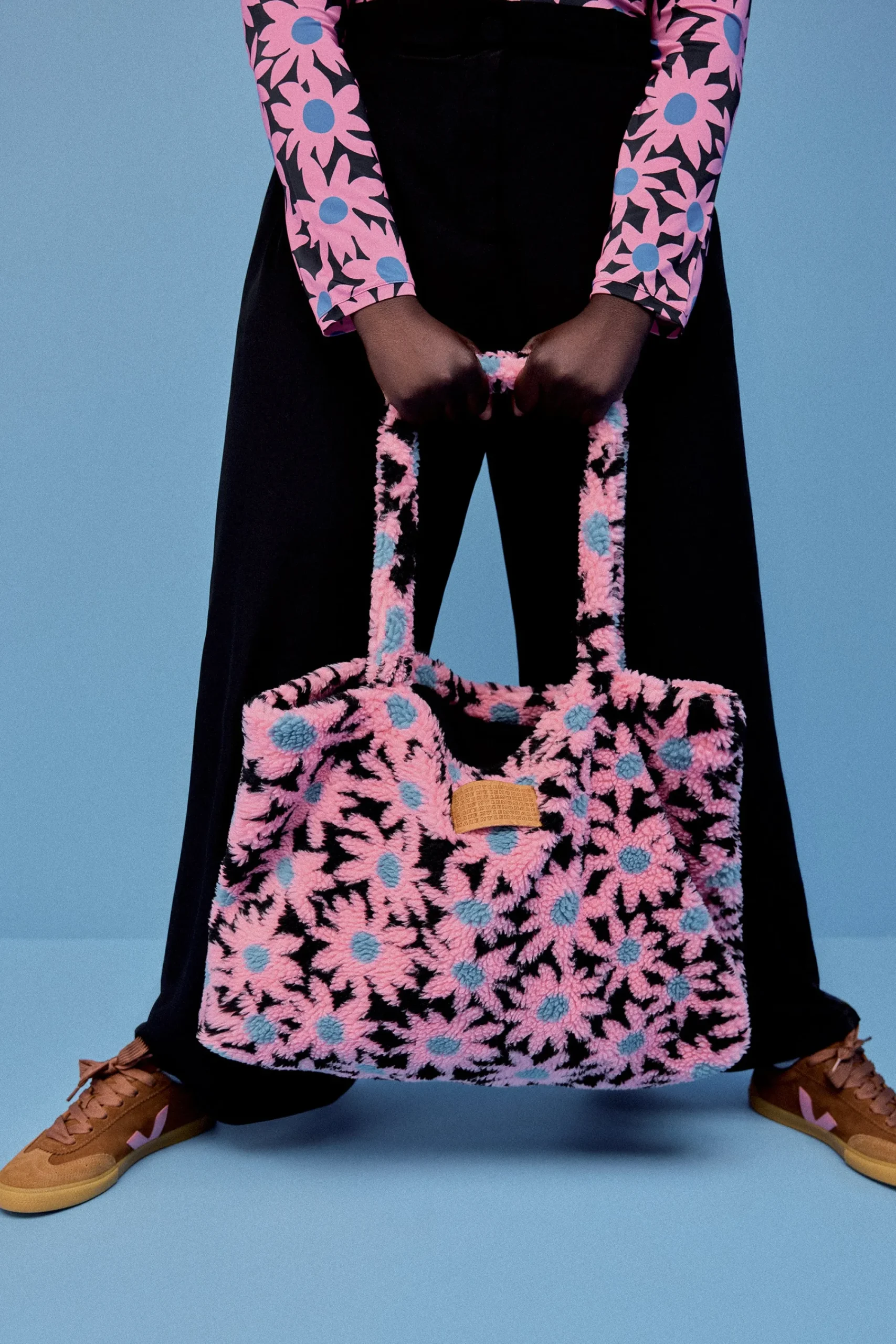Grand cabas rectangulaire à porter épaule. 2 anses. Intérieur doublé. « Jacron » Vegan sur le devant en haut du sac. Matière type cotonnade sur l’intérieur et matière moumoute sur l’extérieur.