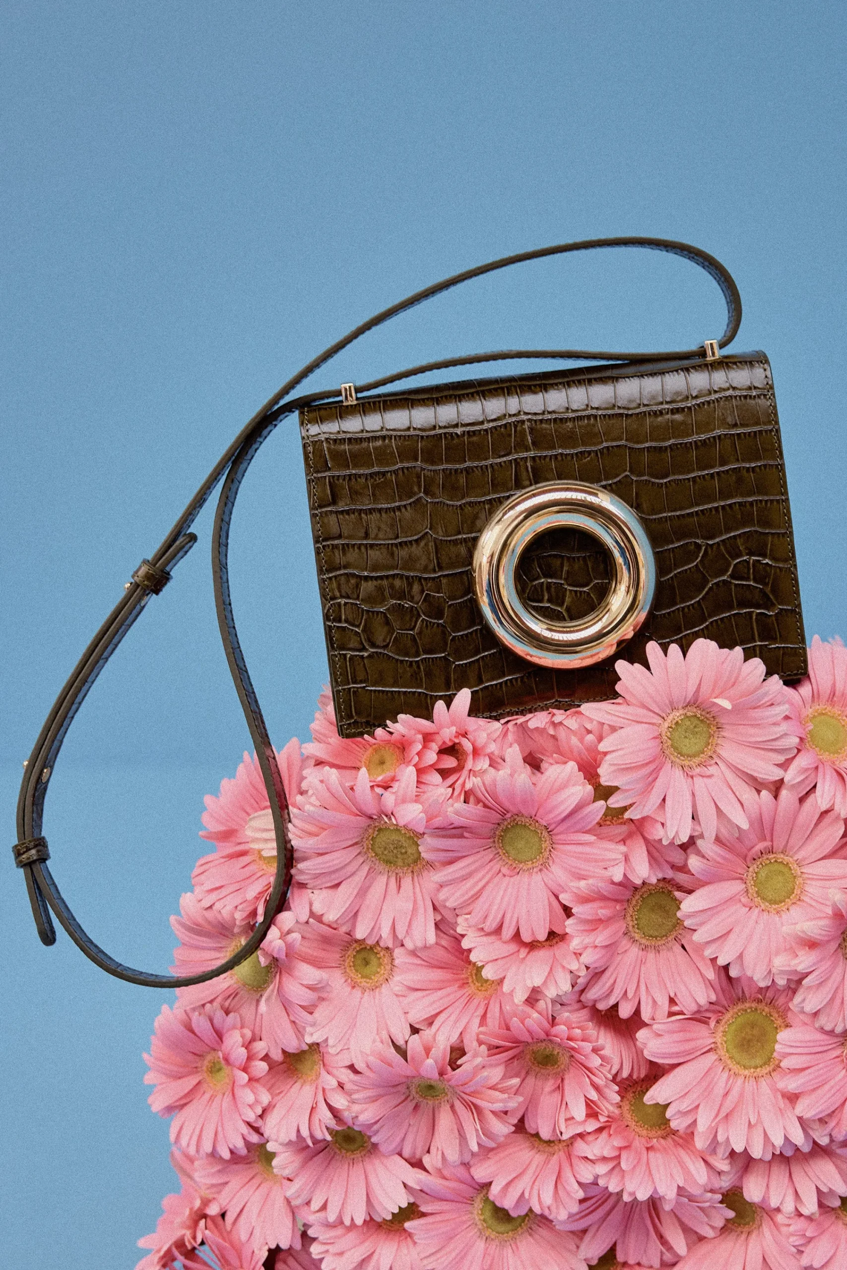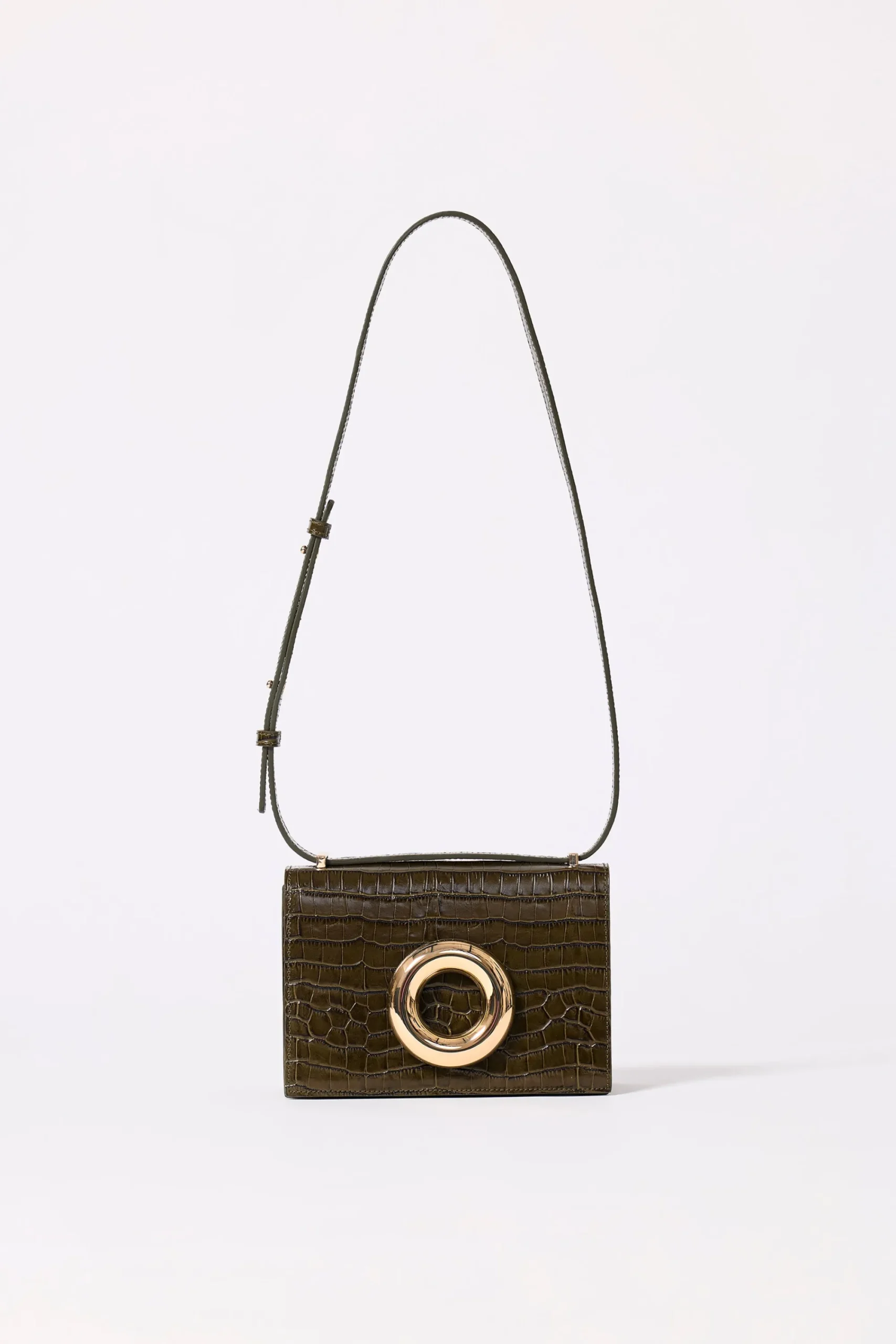 Sac de 21,5 cm de large par 15 cm de haut. Donut doré signature sur le rabat devant du sac. Le sac s’ouvre et se ferme à l’aide d’un bouton aimanté doré de 4 cm de diamètre. La sac contient une poche extérieure à l’arrière du sac ainsi qu’une poche intérieure. La anse s’ajuste selon le style que vous souhaitez adopter : cross body ou porté à l’épaule.