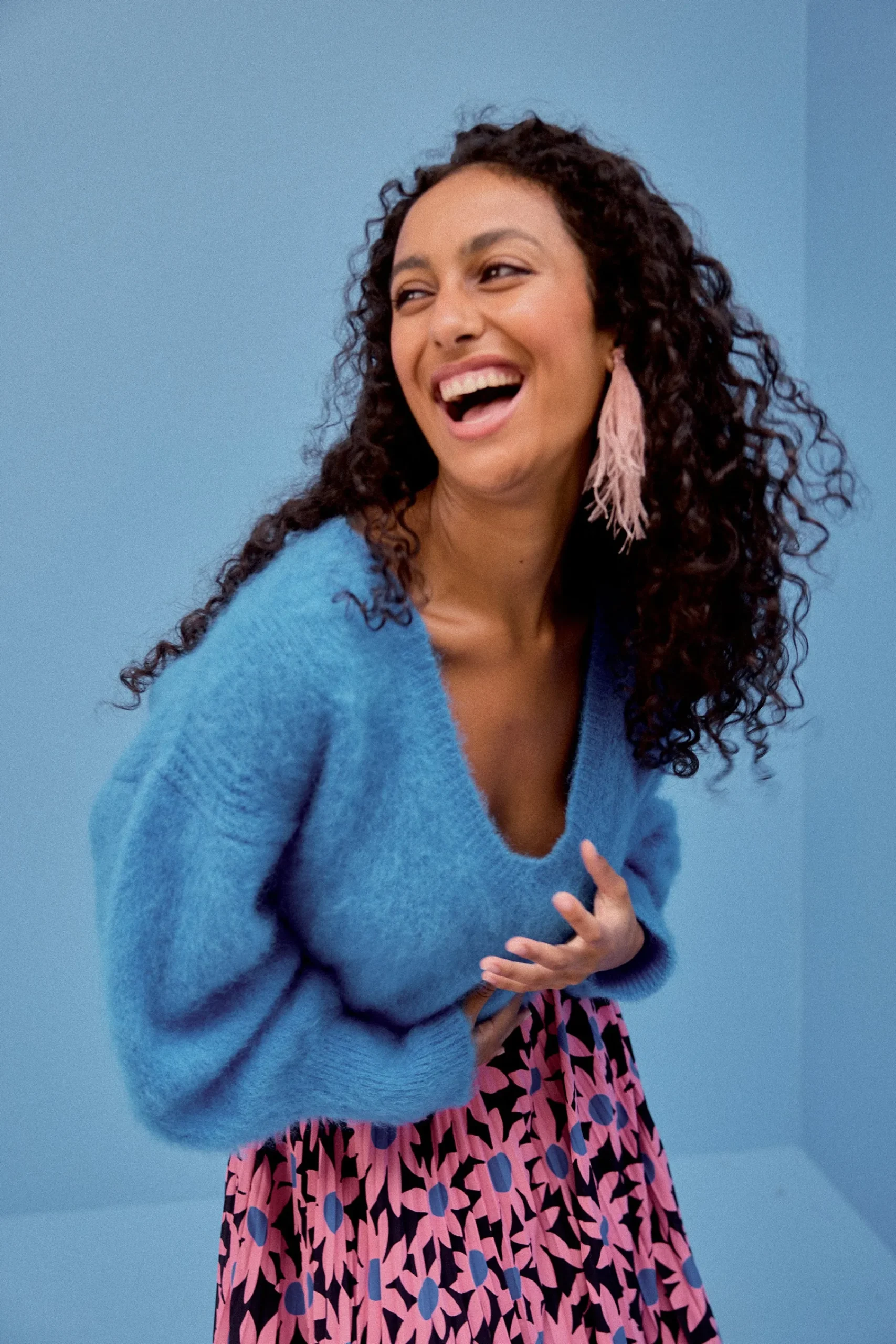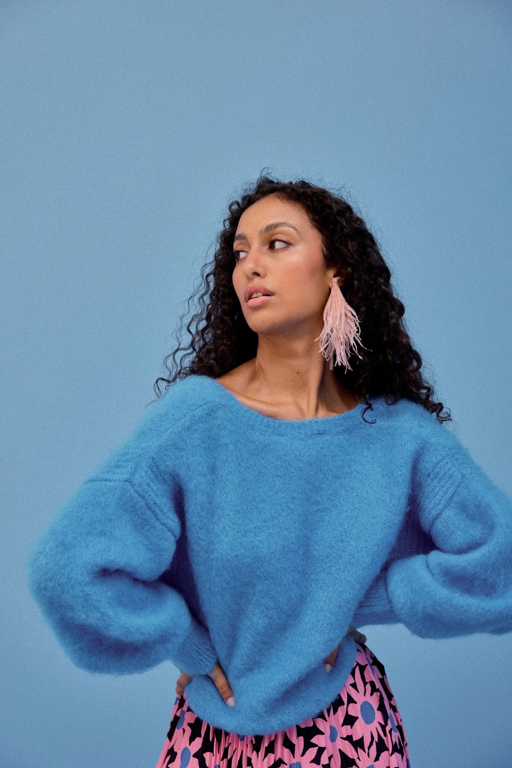 Pull duveteux à col « V » profond, manches bouffantes avec poignets resserrés. Coupe plutôt droite. Fil mohair.