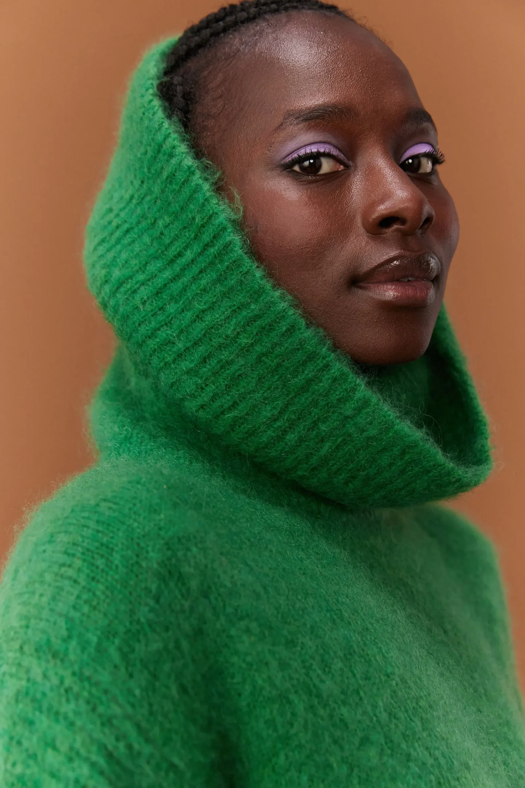 Pull duveteux à col boule, manches bouffantes avec poignets resserrés. Coupe plutôt droite. Fil mohair.