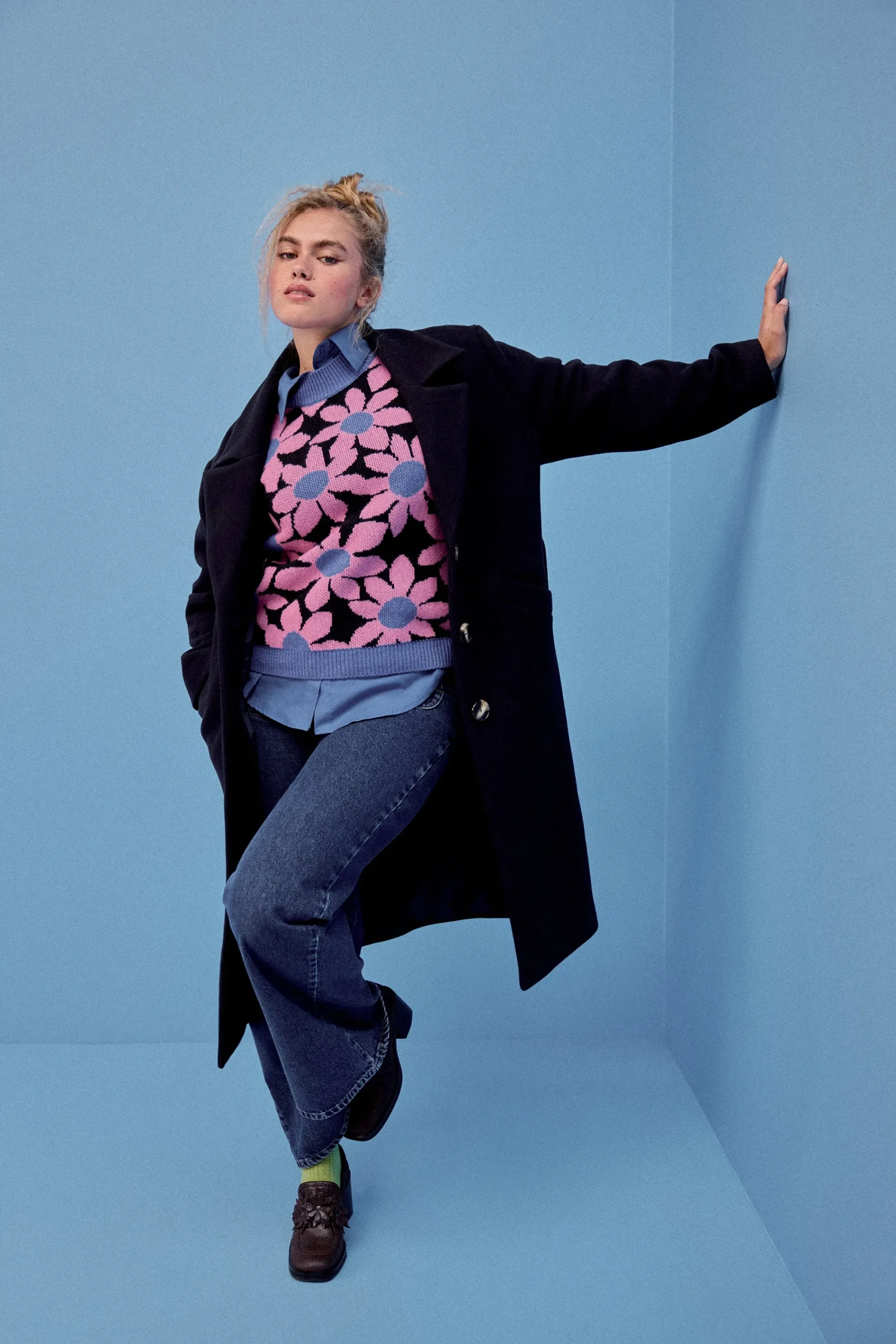 Gilet sans manche, encolure ronde. Motif de fleurs tricoté en jacquard sur le devant et le dos. Bord-côte à l’encolure, aux emmanchures et à la taille. Longueur au dessus des hanches.