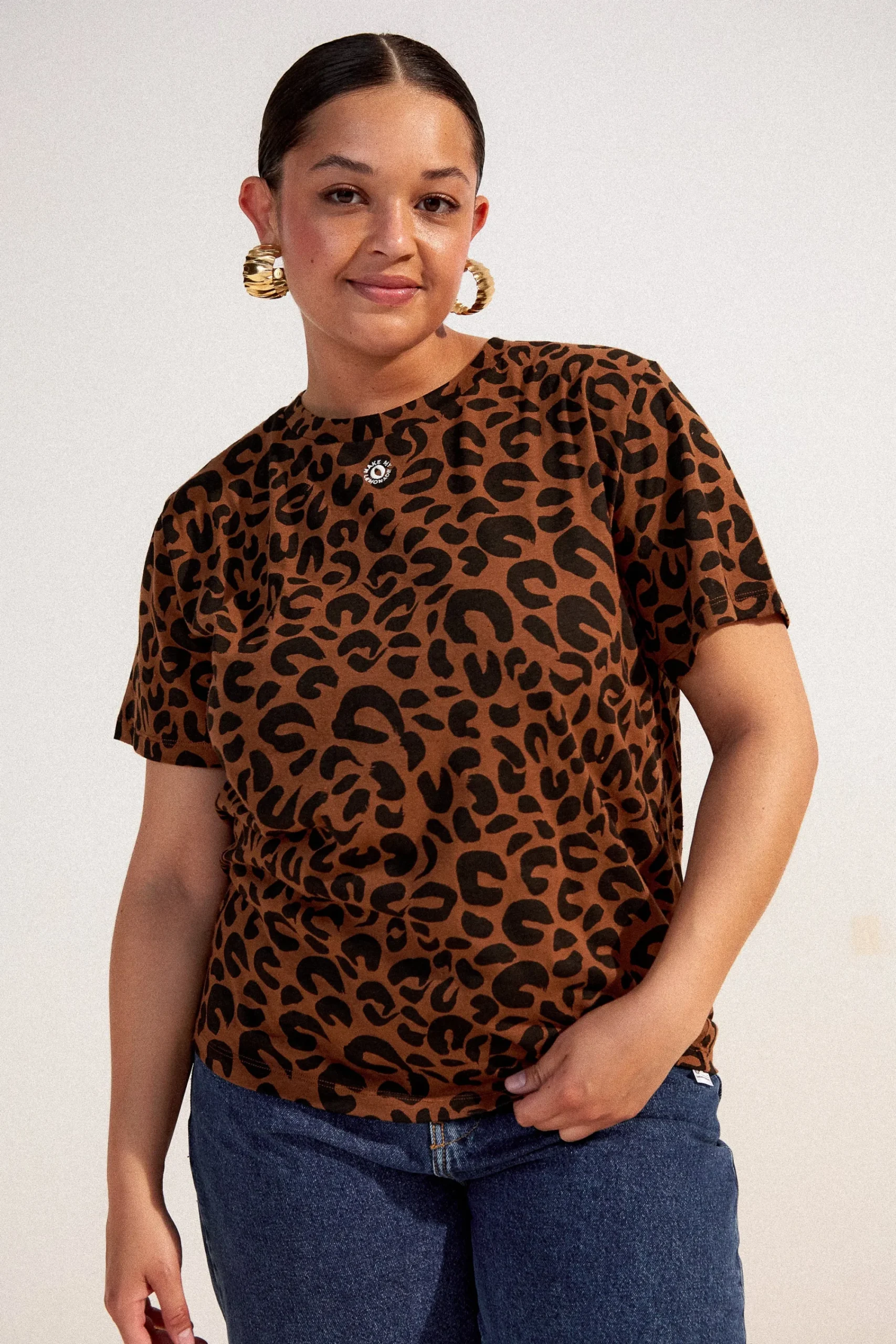 T-shirt classique, coupe ample à encolure ronde et manches courtes. Imprimé Léopard. Petit logo brodé au fil blanc sur le devant, en dessous du cou. Longueur petites hanches.