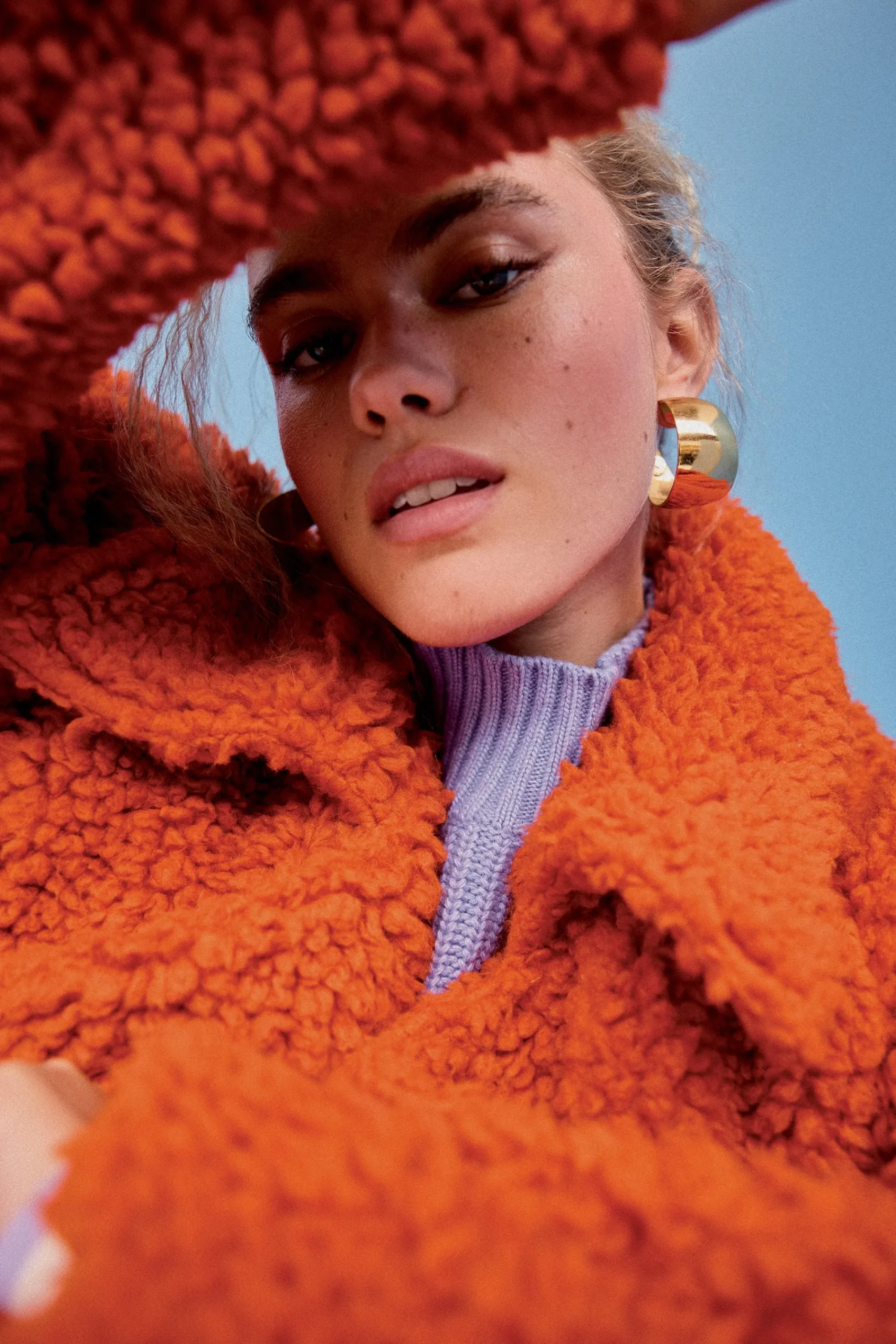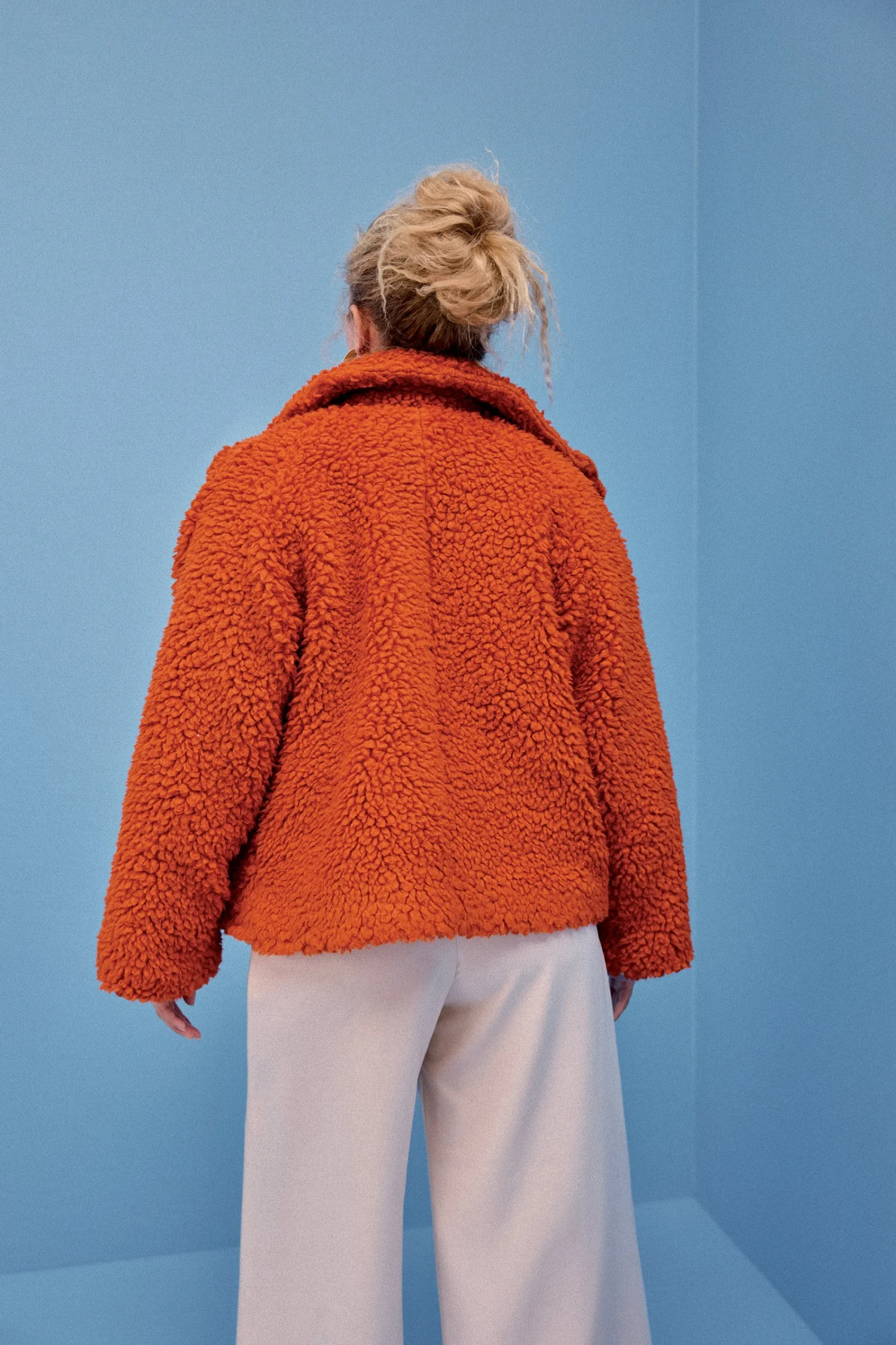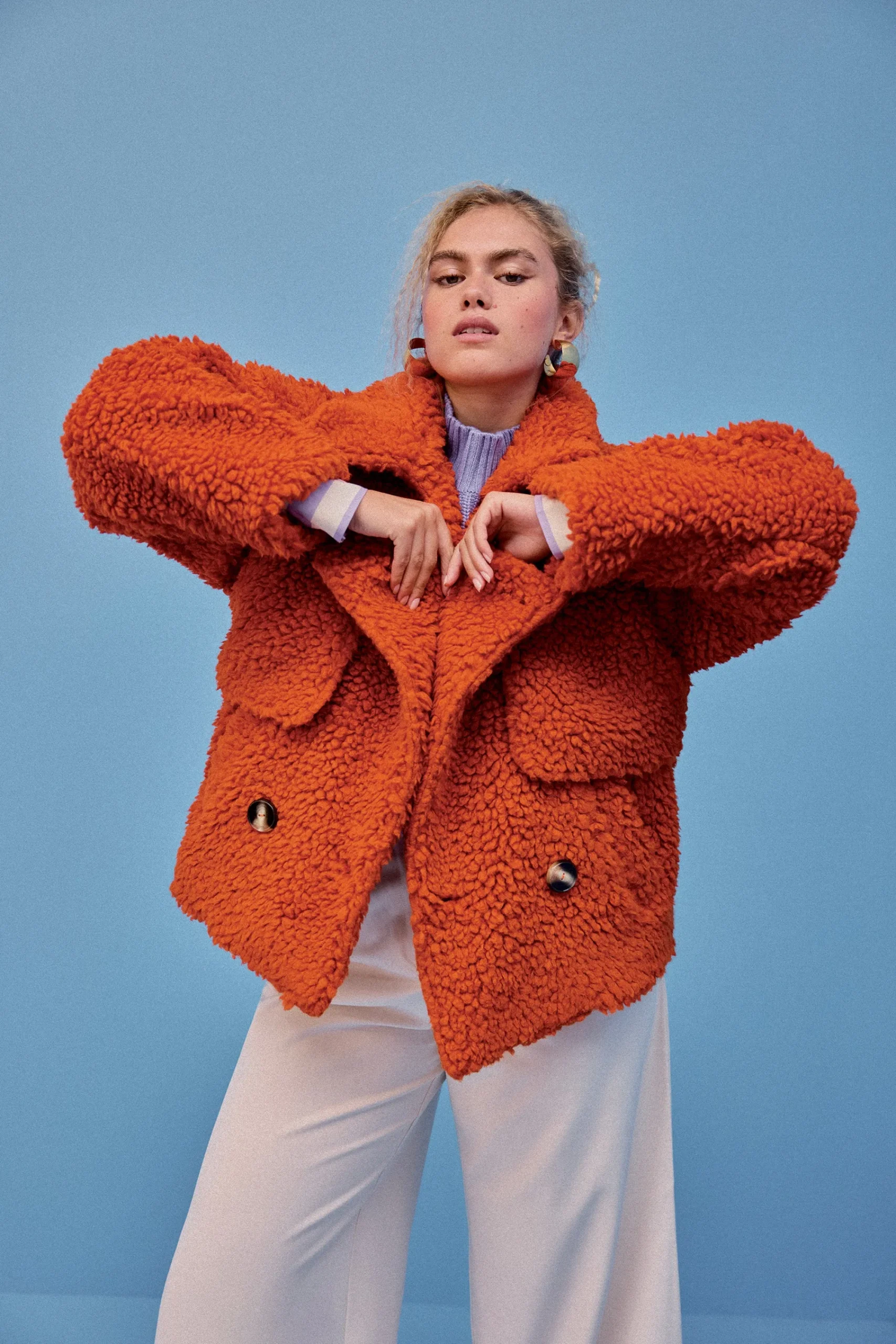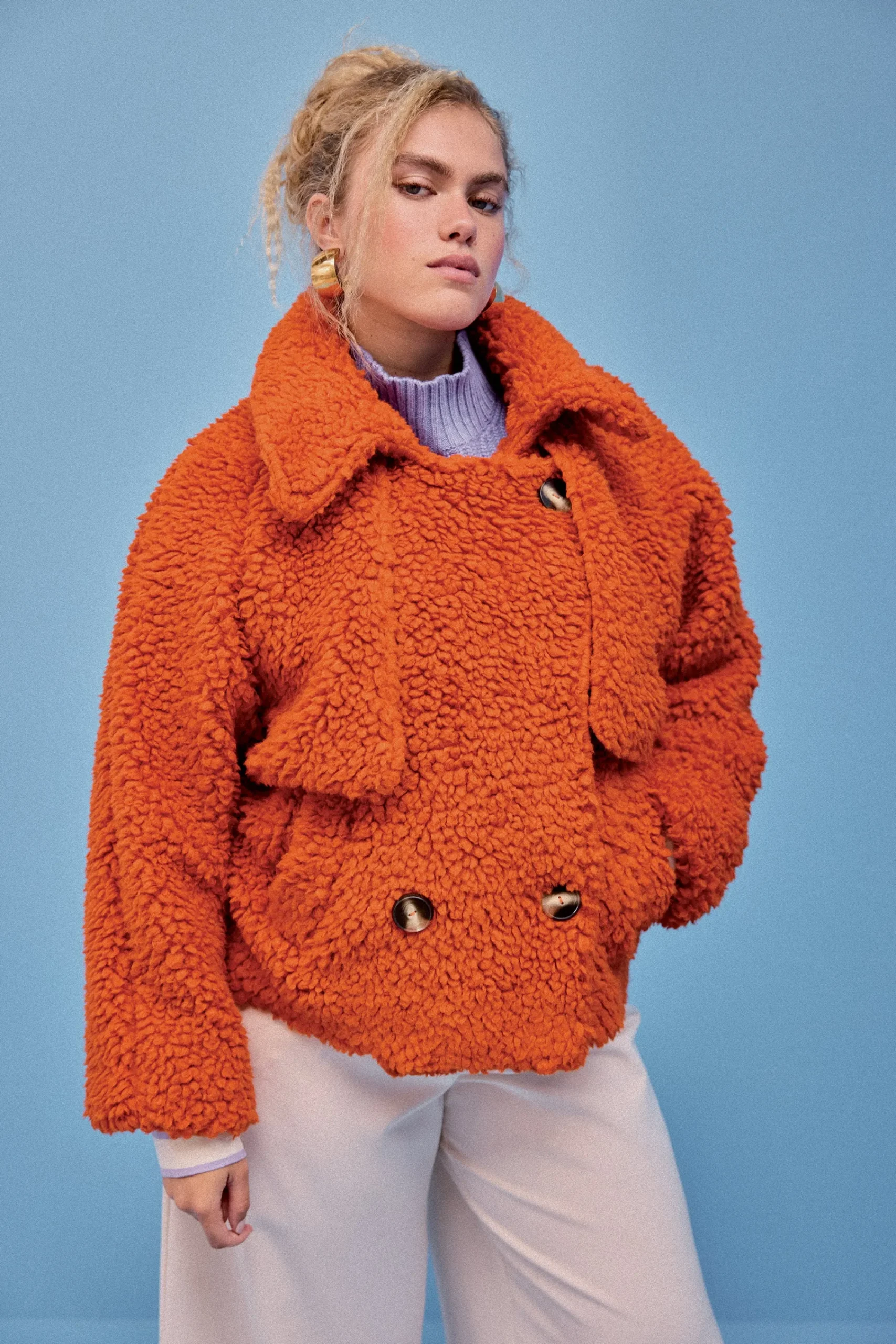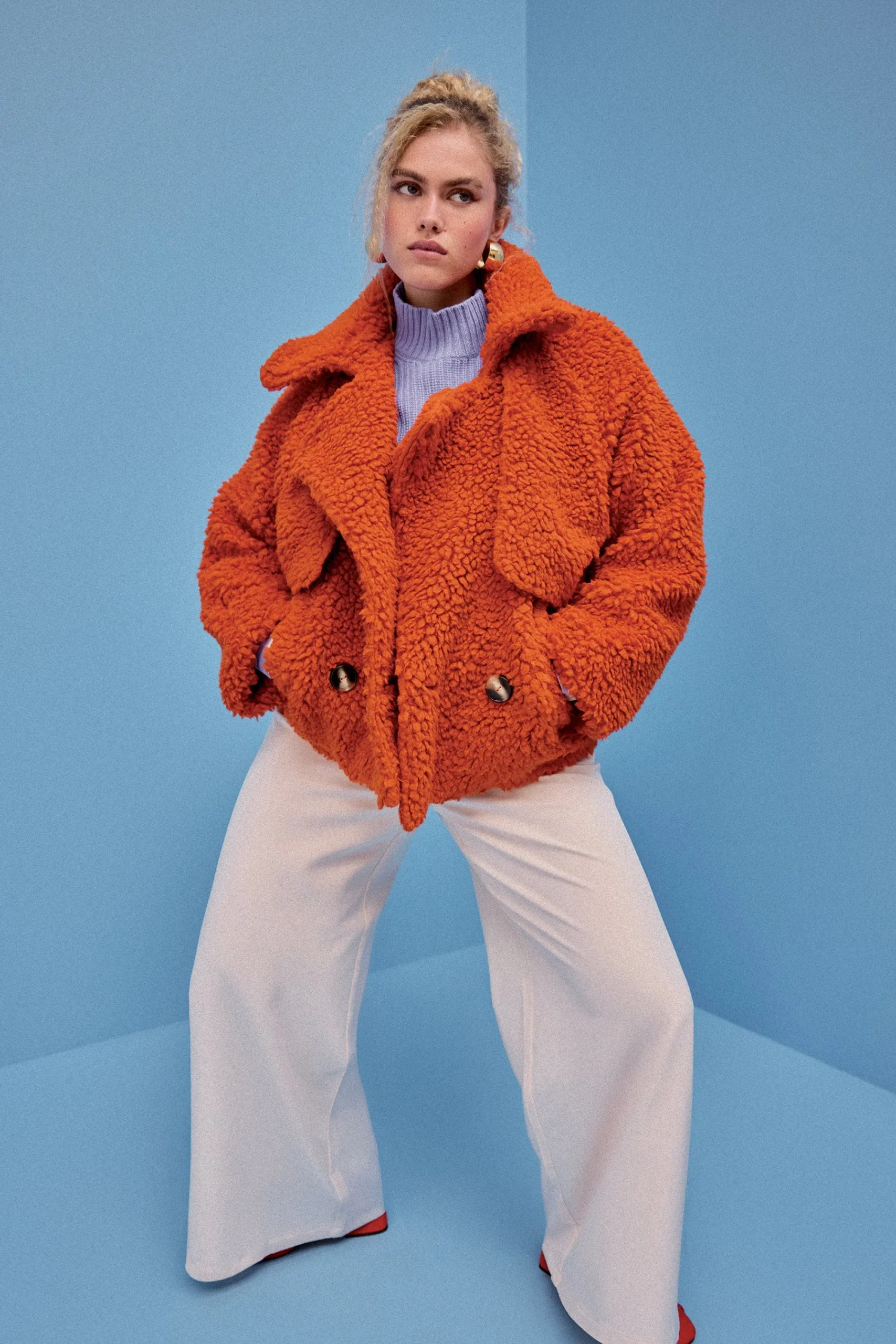 Manteau court type caban en tissu texturé type moumoute. Col à revers avec double boutonnage sur le devant. Boutons jaspés. Bas volets sur les devants, et poches passepoilées. Manches raglan longues et droites avec deux coutures. Entièrement doublé.