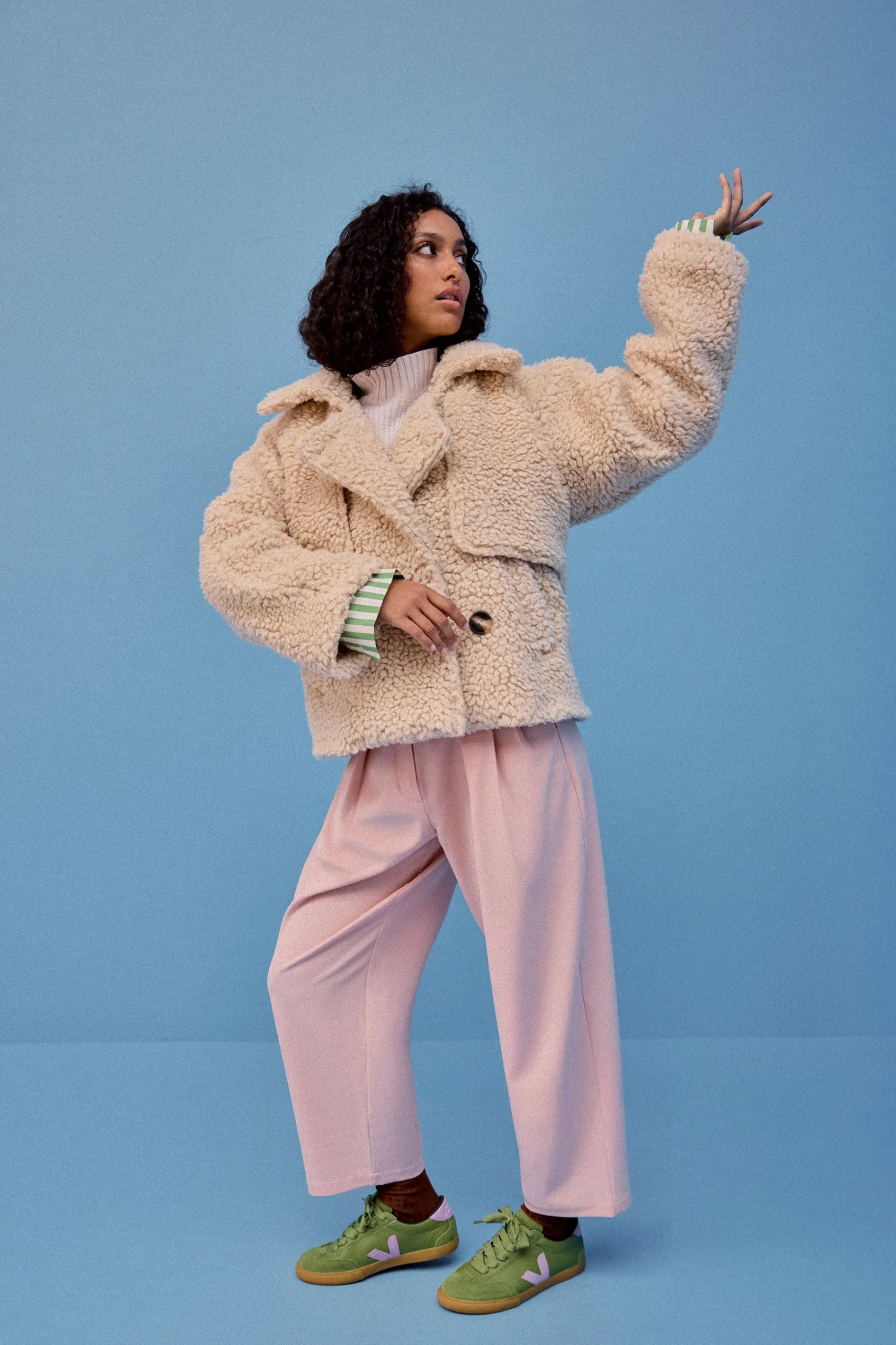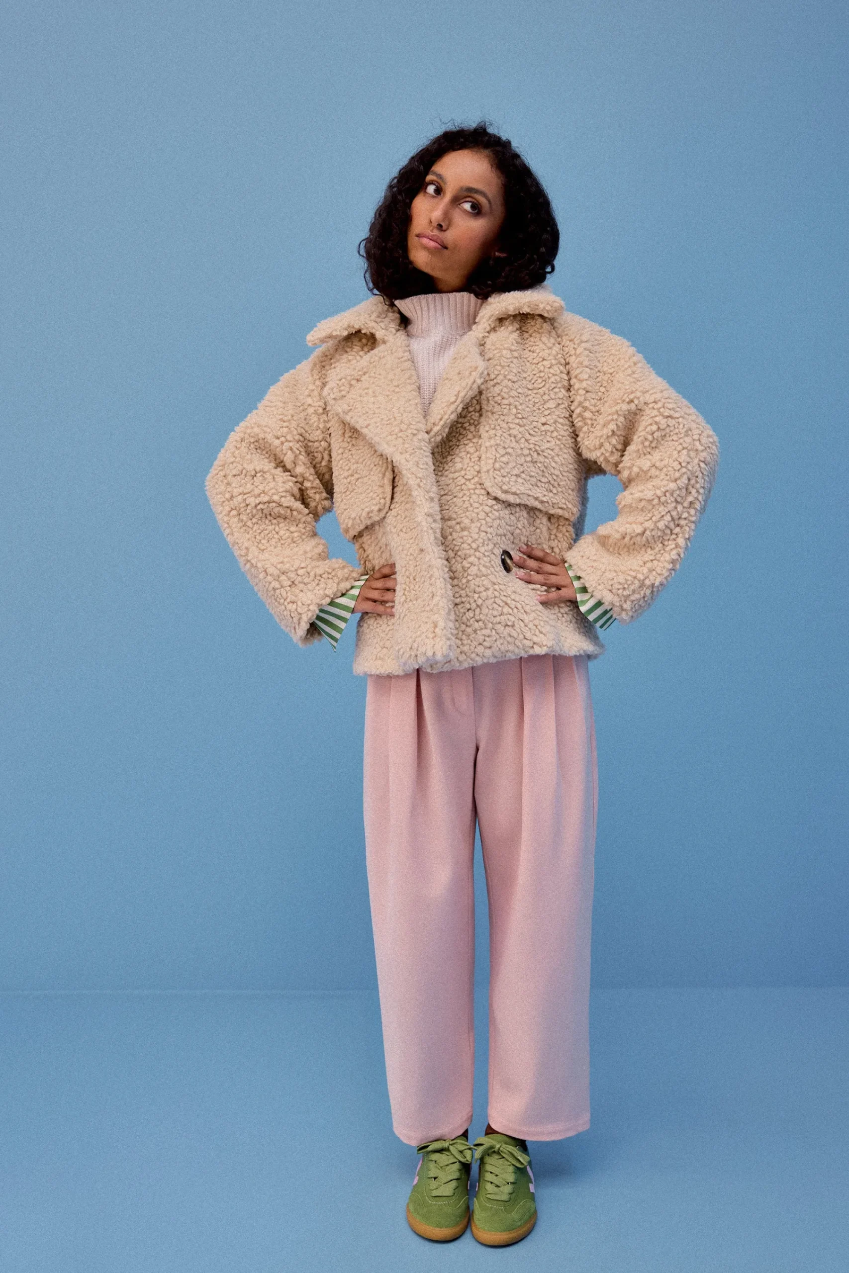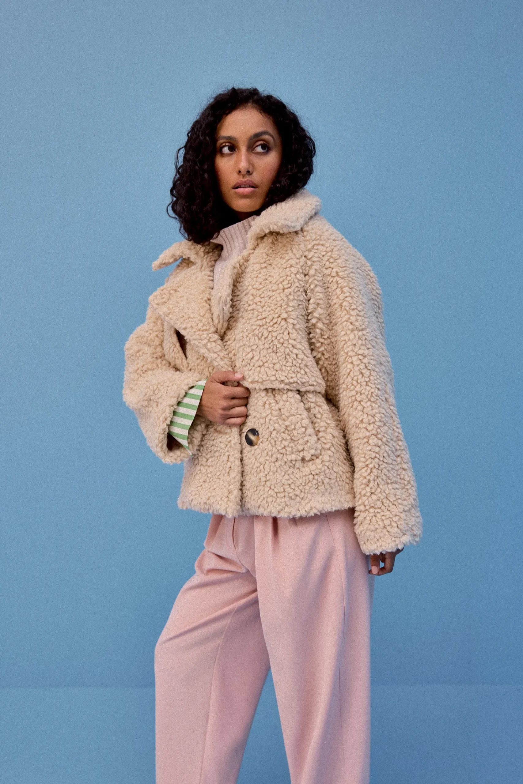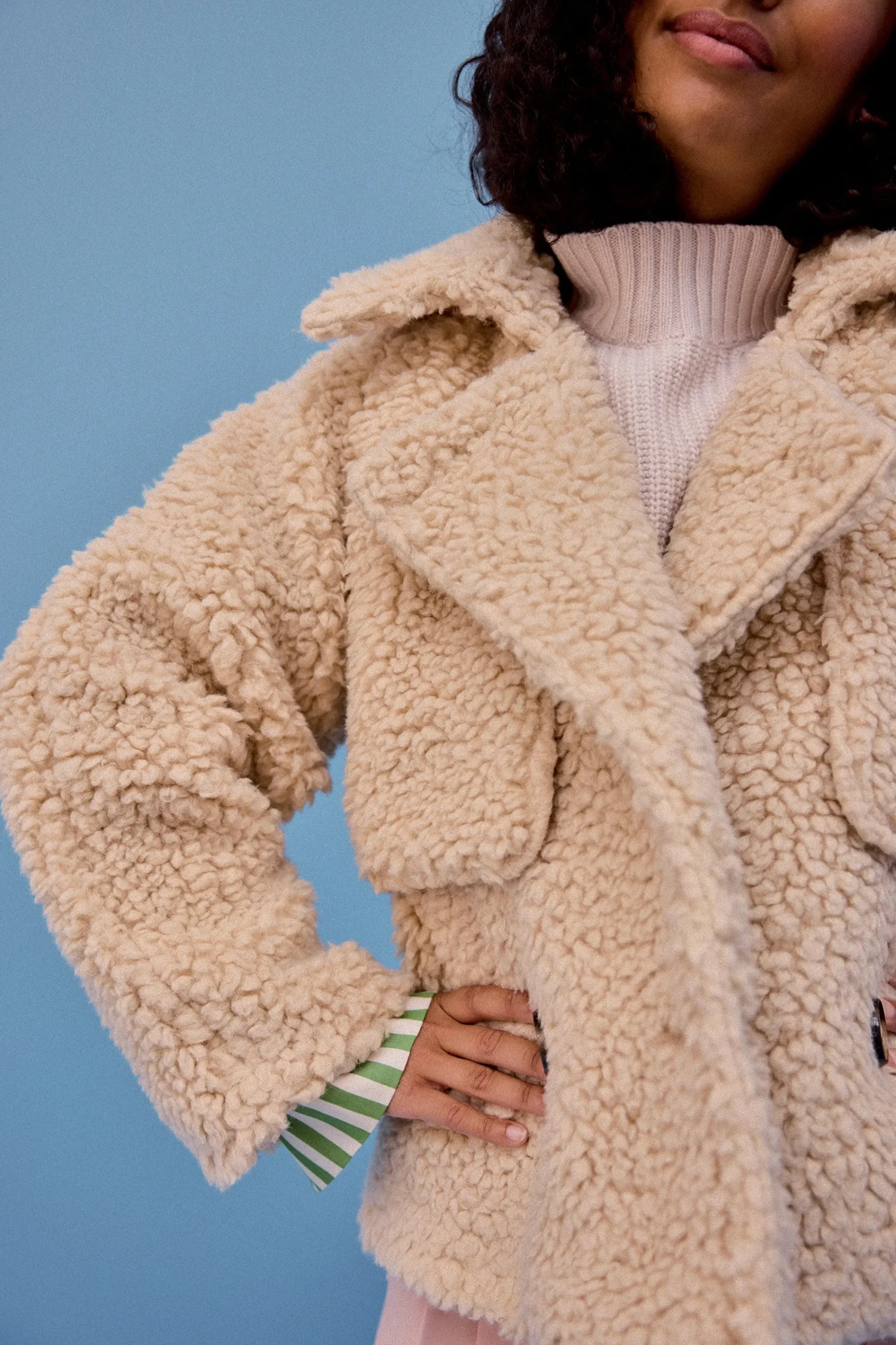 Manteau court type caban en tissu texturé type moumoute. Col à revers avec double boutonnage sur le devant. Boutons recouverts. Bas volets sur les devants, et poches passepoilées. Manches raglan longues et droites avec deux coutures. Entièrement doublé.