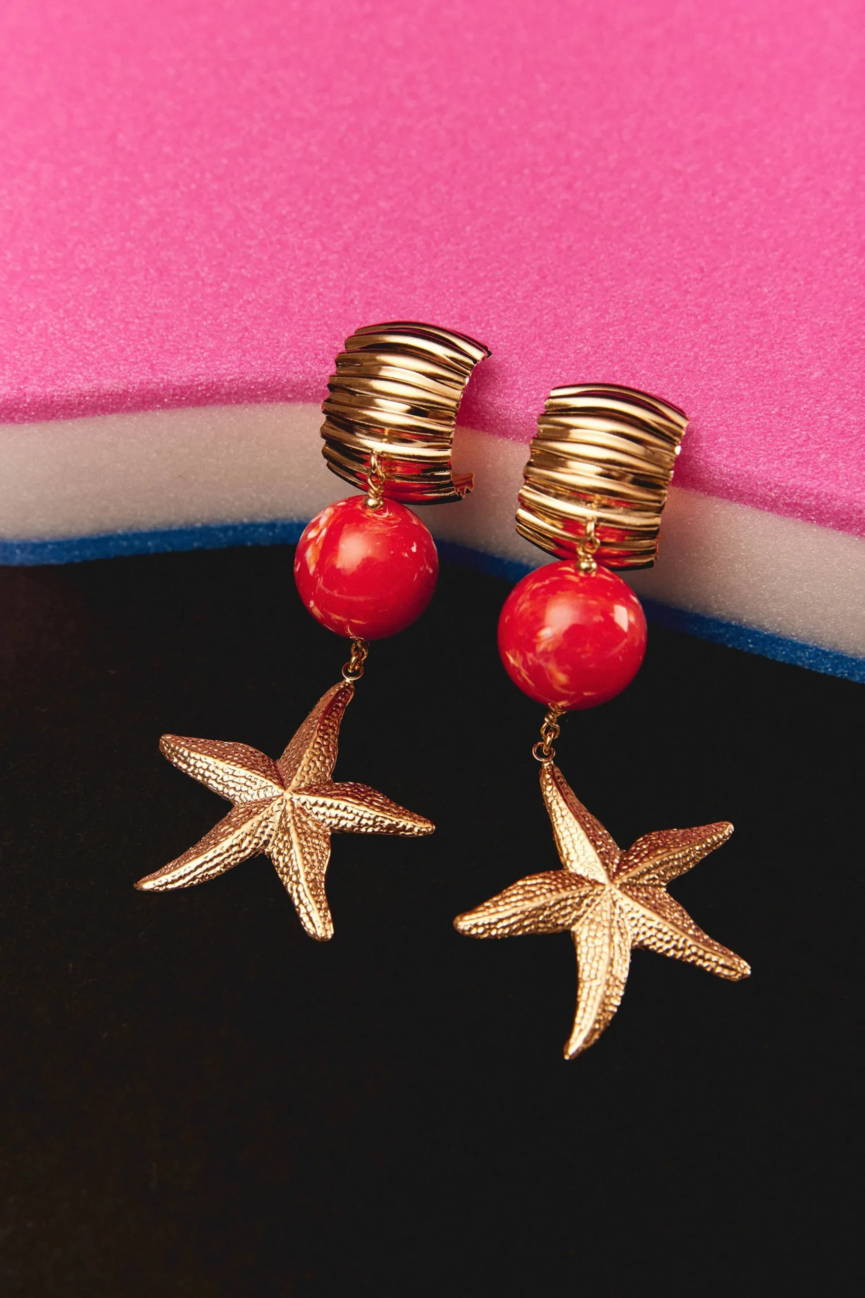 Créoles en laiton doré à l’or fin. Perles en plastique marbré et estampes d’étoiles de mer en laiton doré à l’or fin.