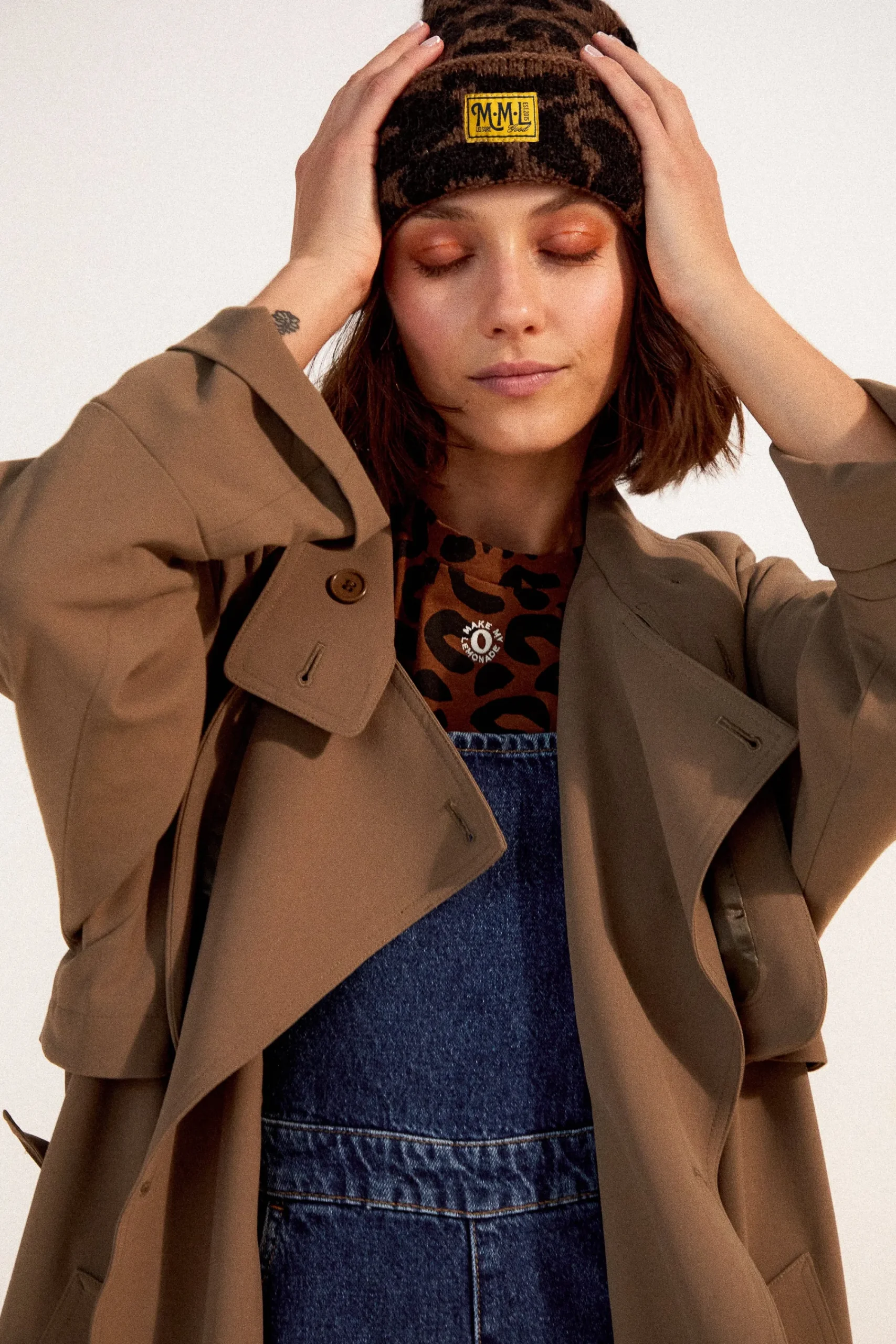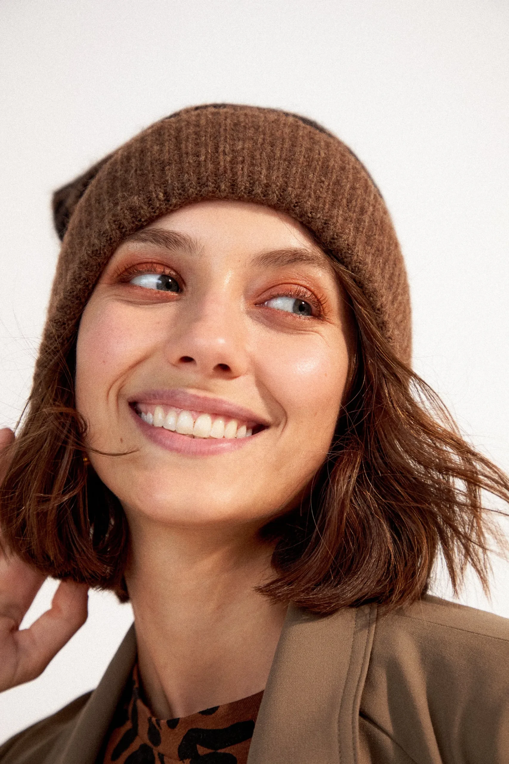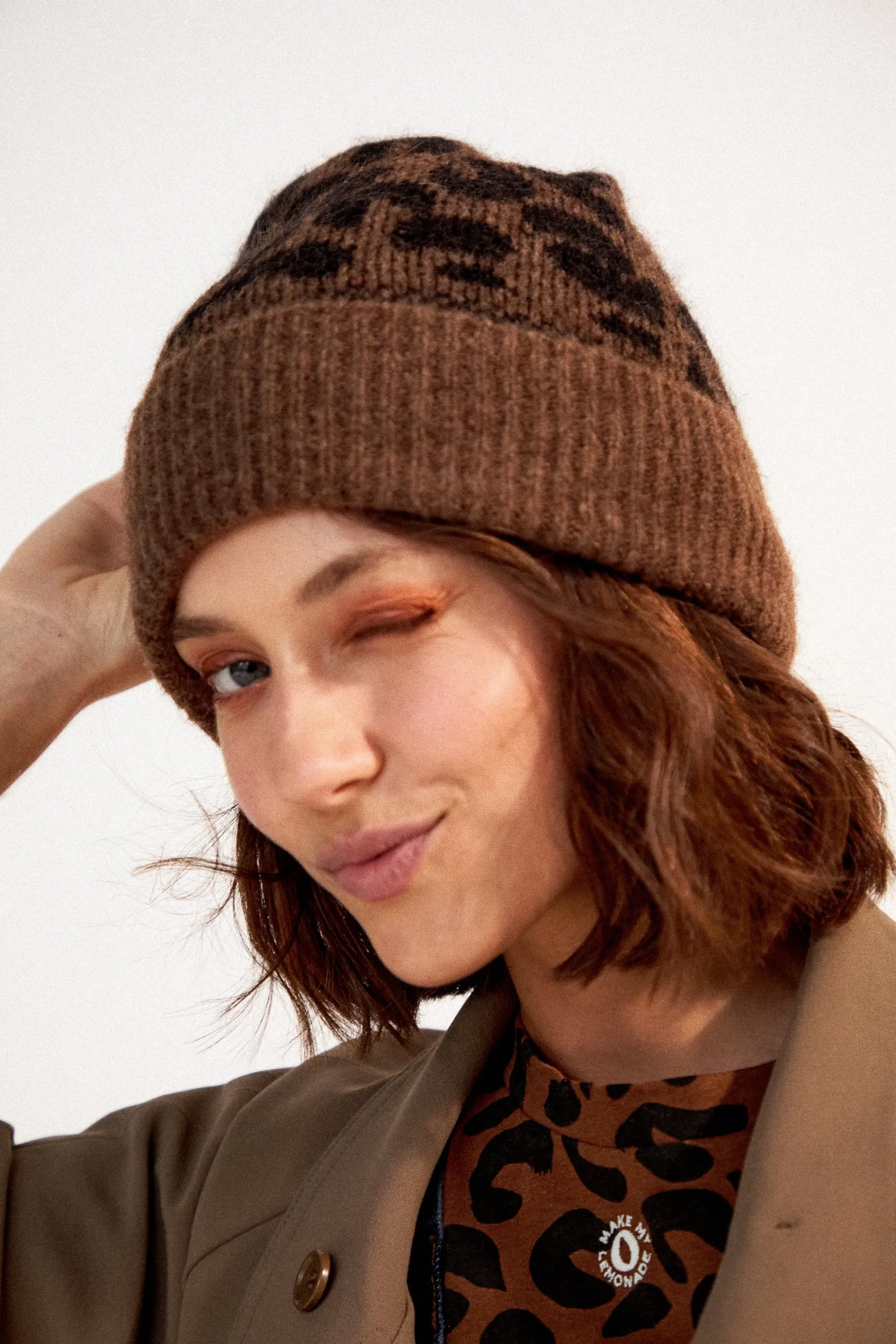 Bonnet avec revers. Fils mohair finition brossée. Taille unique. Motif léopard tricoté en jacquard.
