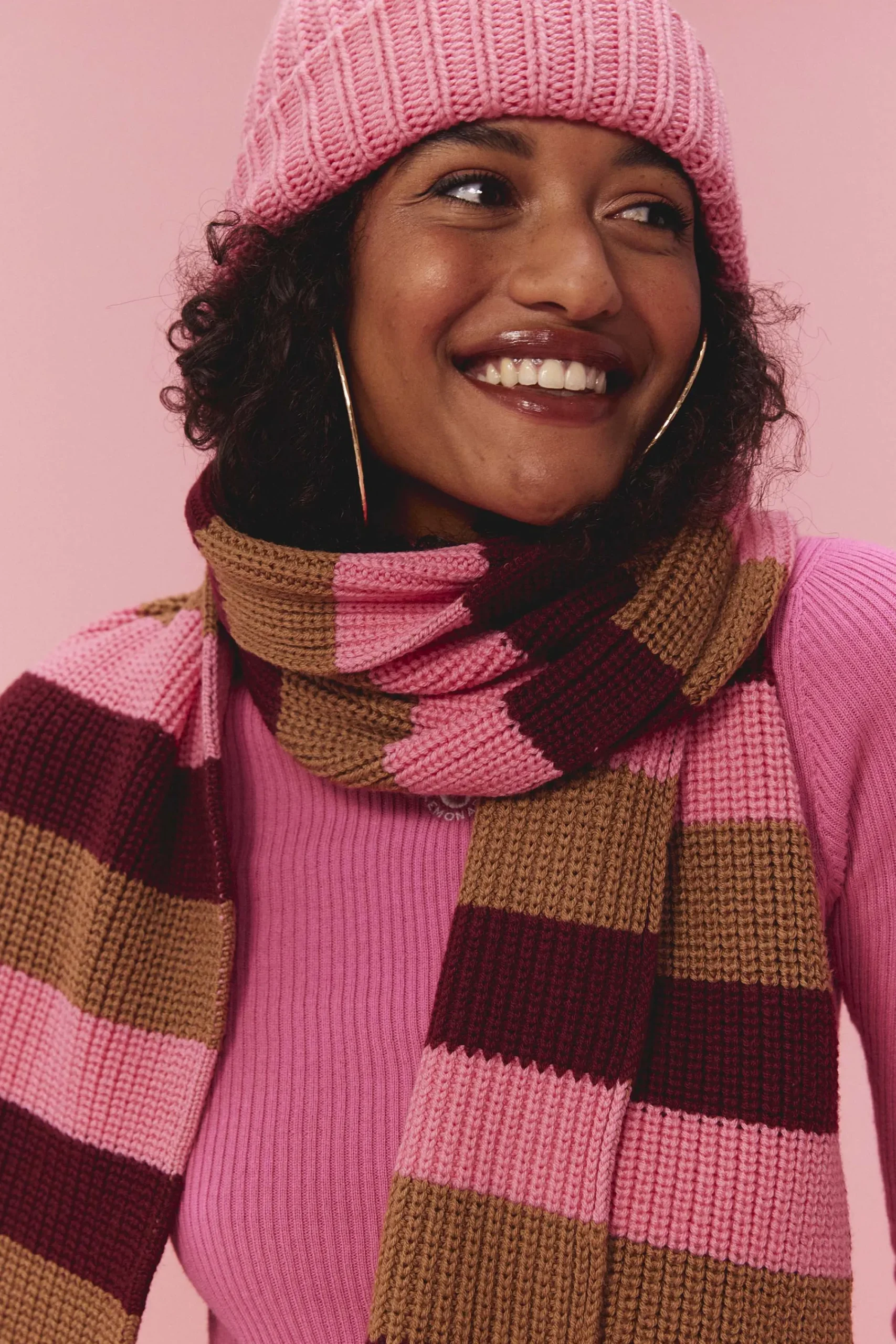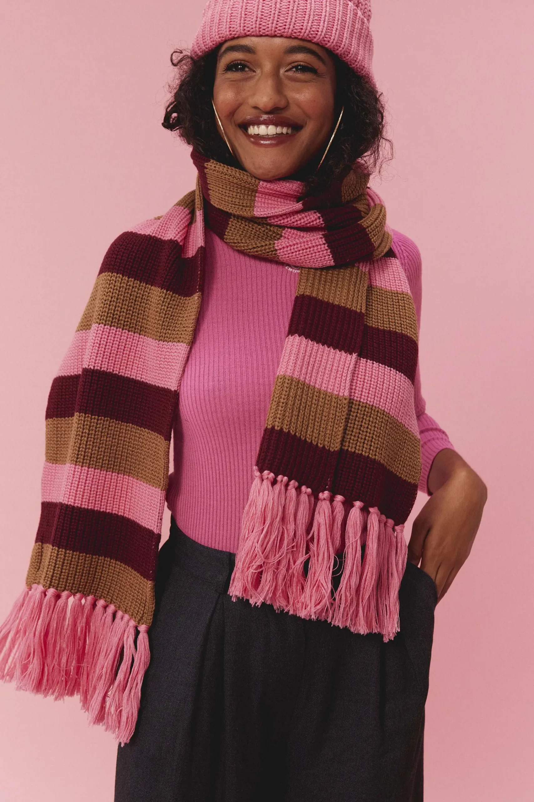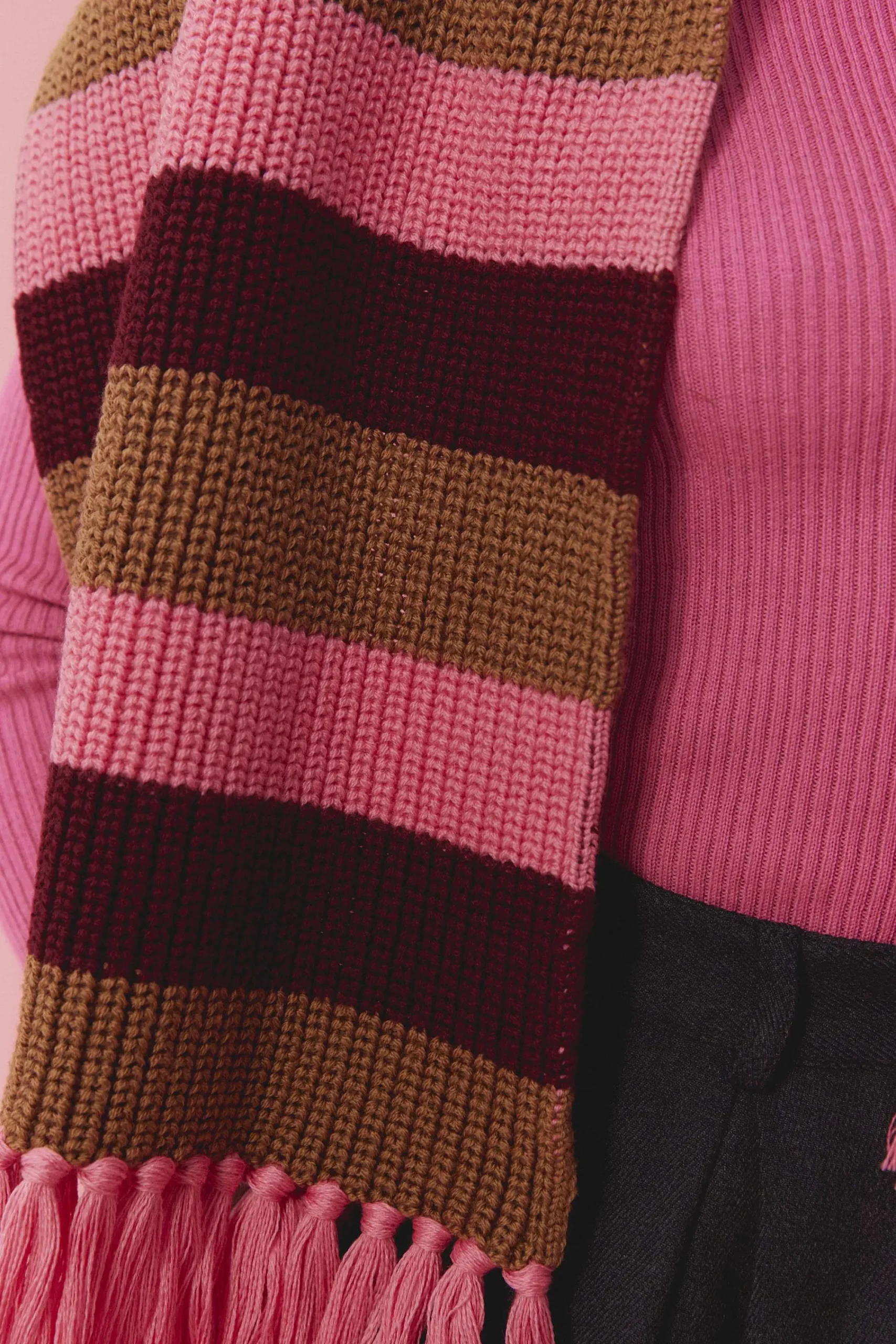 Echarpe rayée en maille perlée de 3 couleurs. Franges aux extrémités. Longueur sans les franges : 168cm Largeur : 30cm longueur franges : 12cm