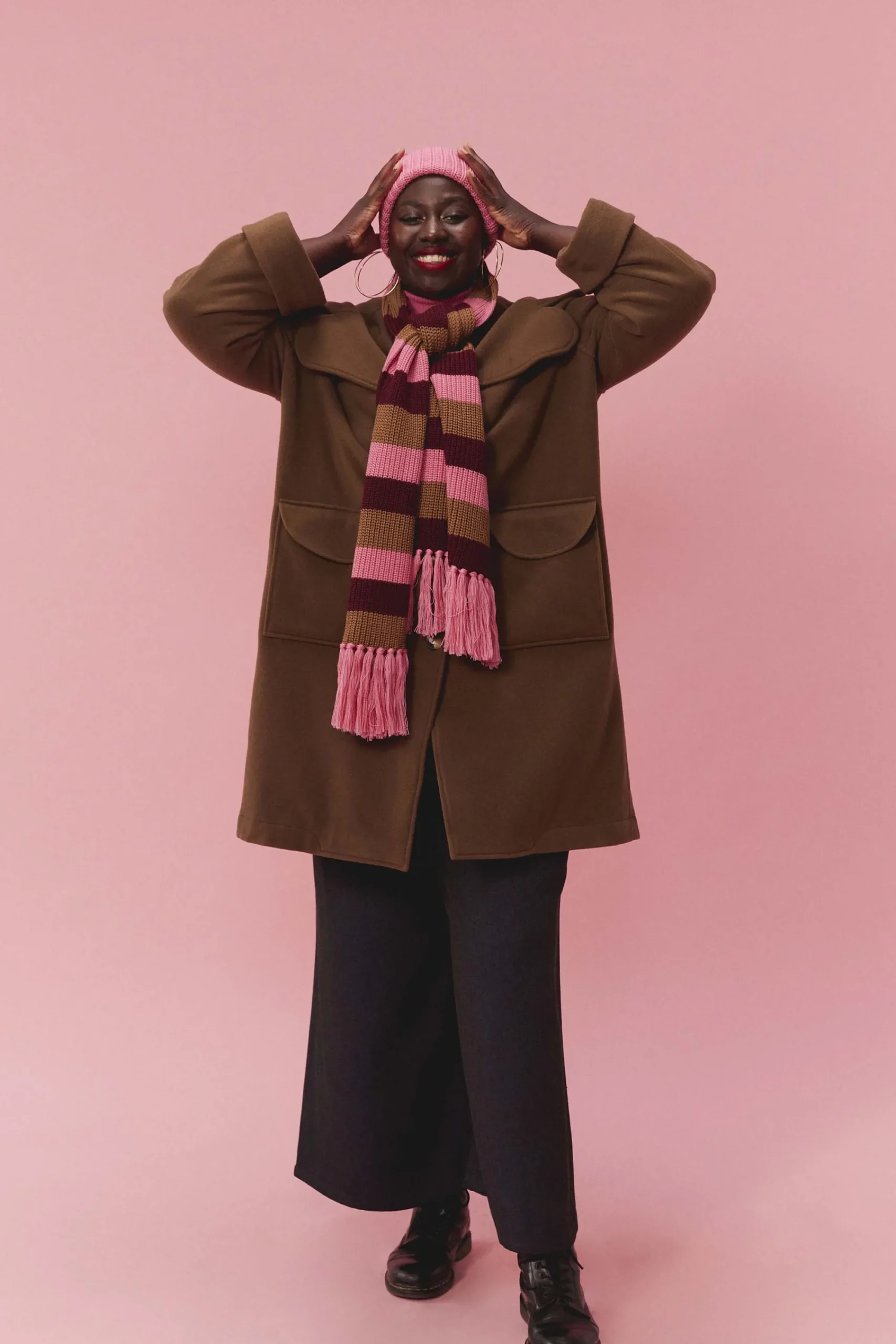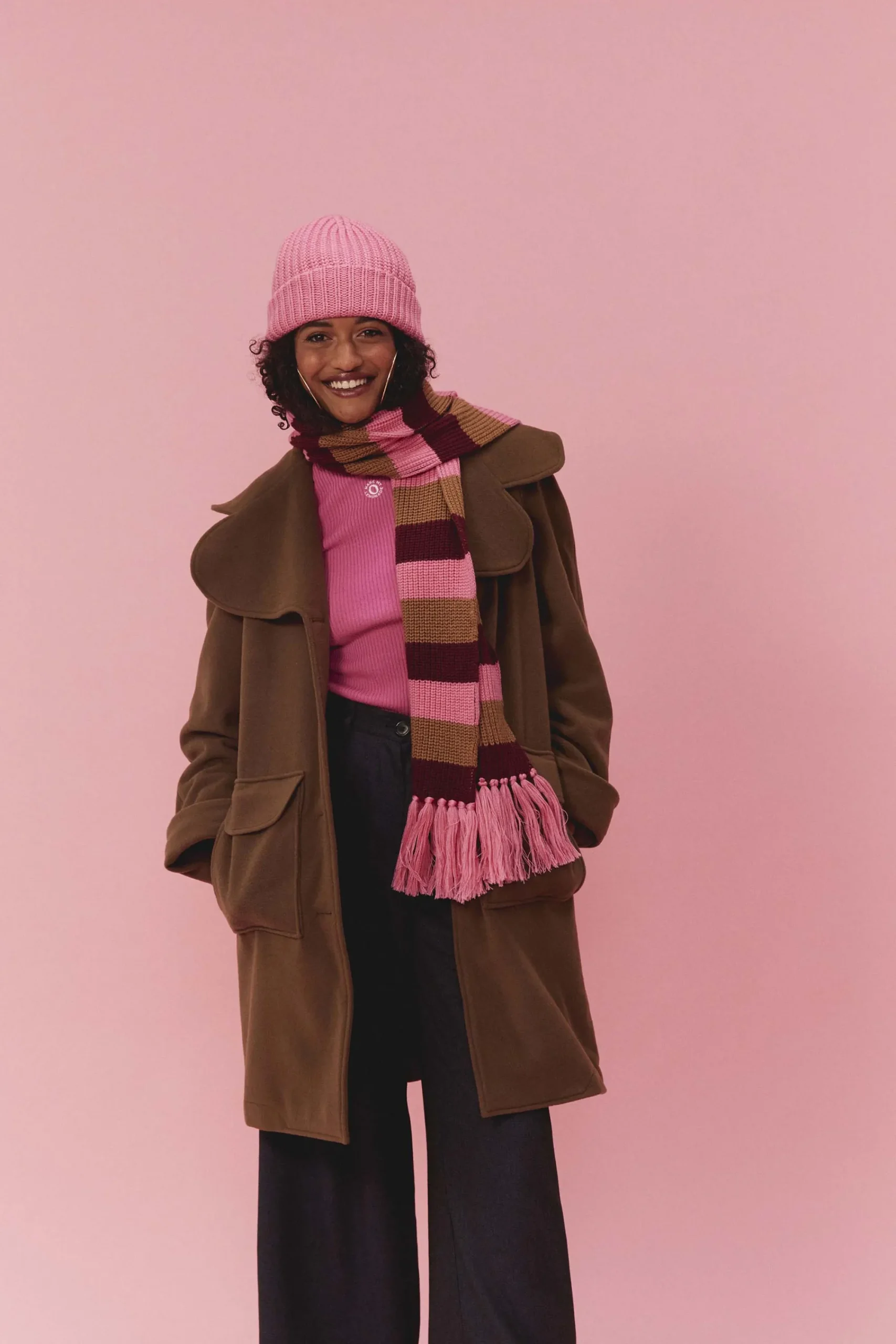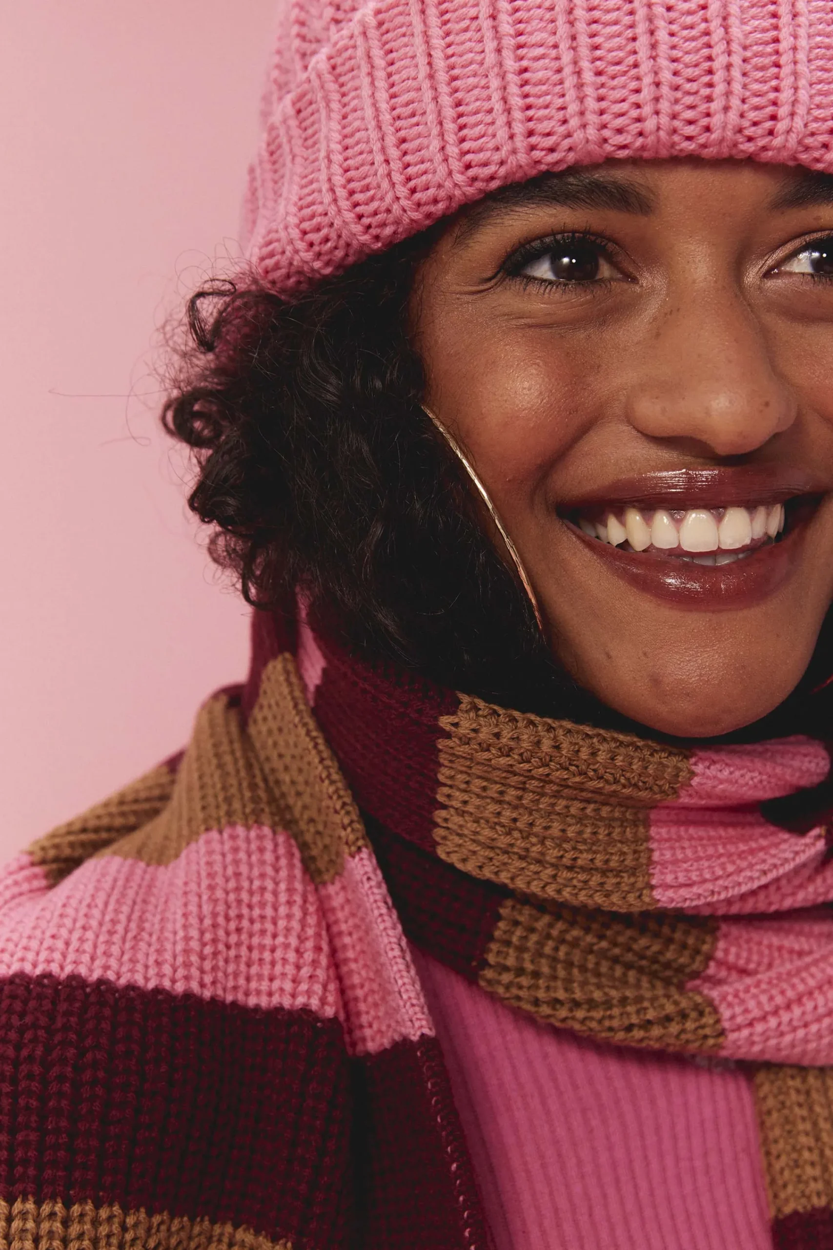 Echarpe rayée en maille perlée de 3 couleurs. Franges aux extrémités. Longueur sans les franges : 168cm Largeur : 30cm longueur franges : 12cm