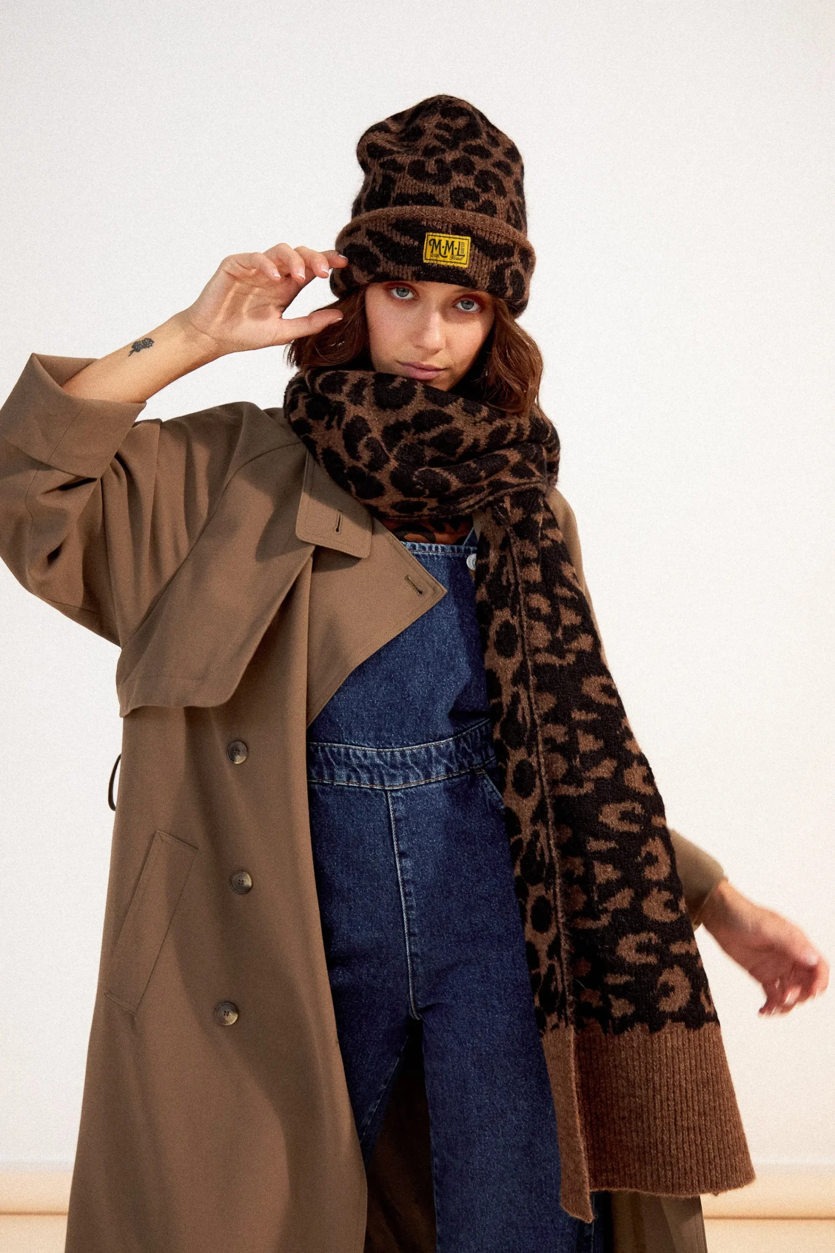 Echarpe rectangulaire. Fil mohair finition brossée. Motif léopard tricoté en jacquard.