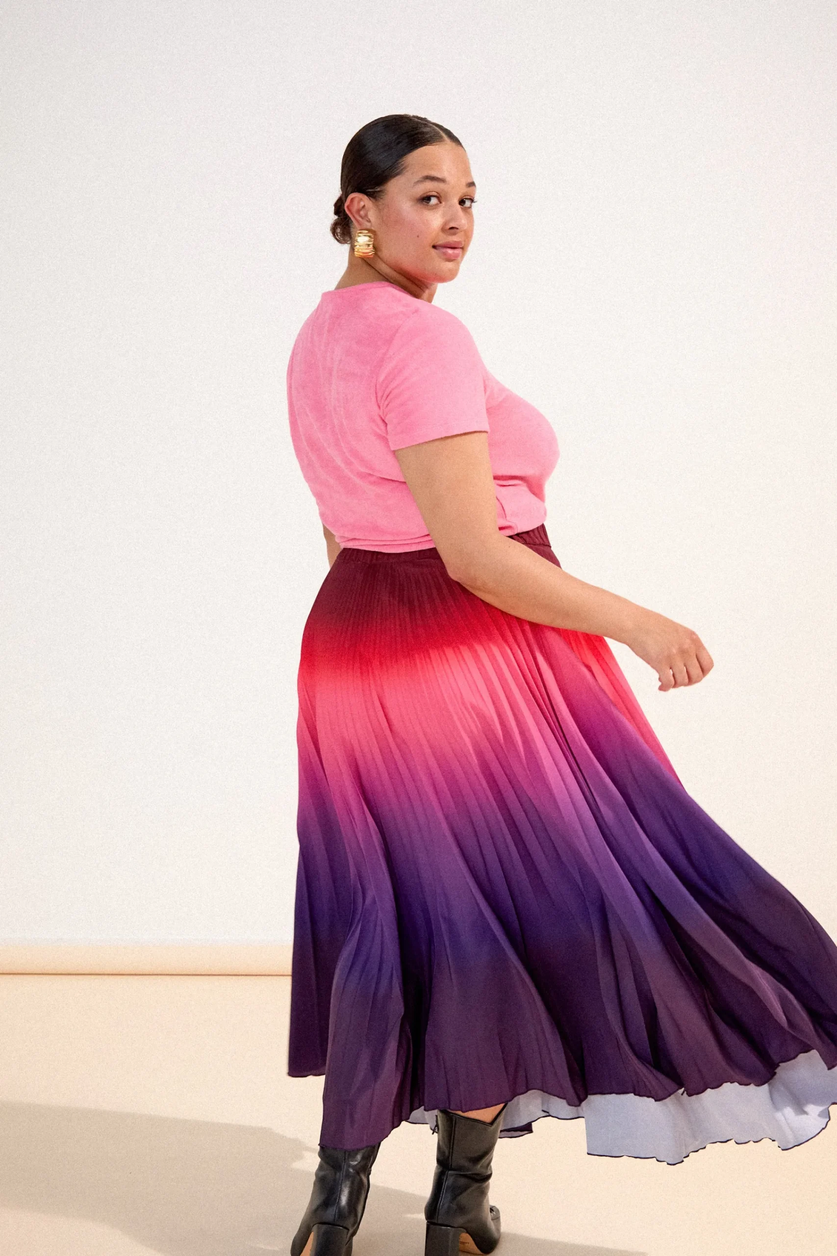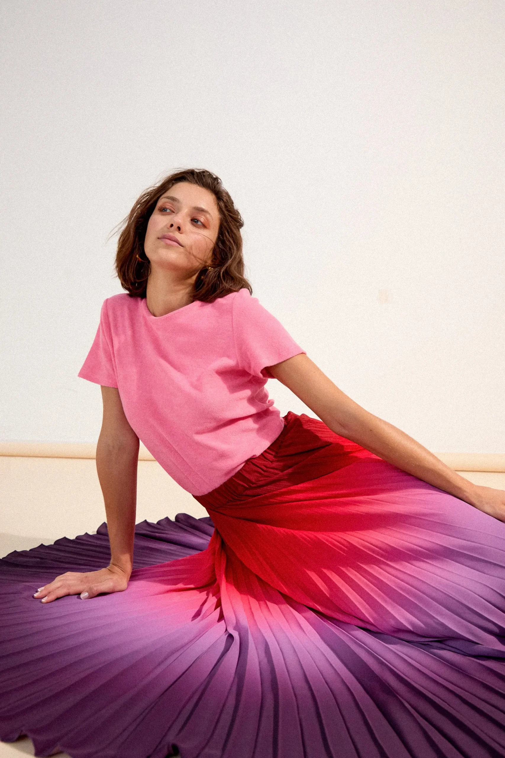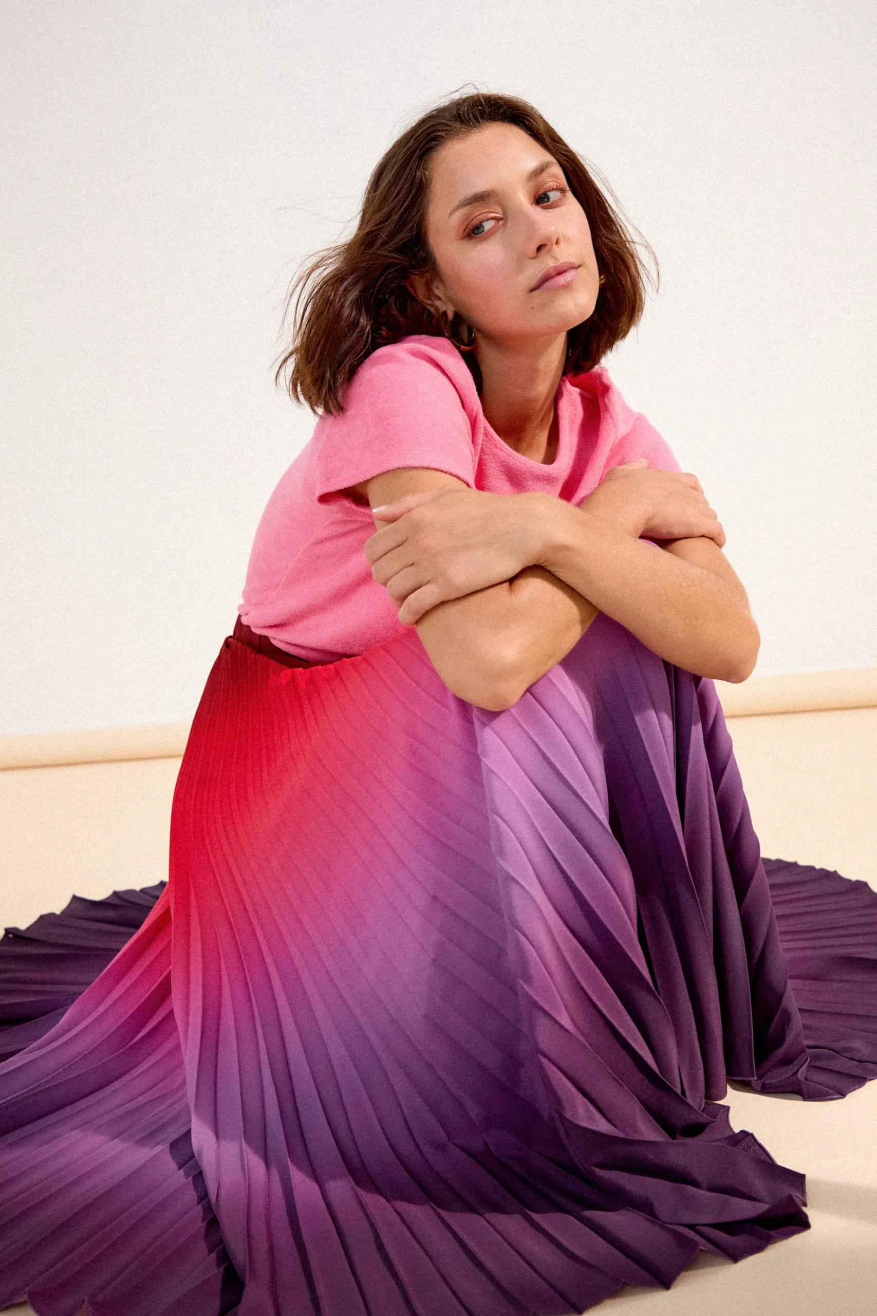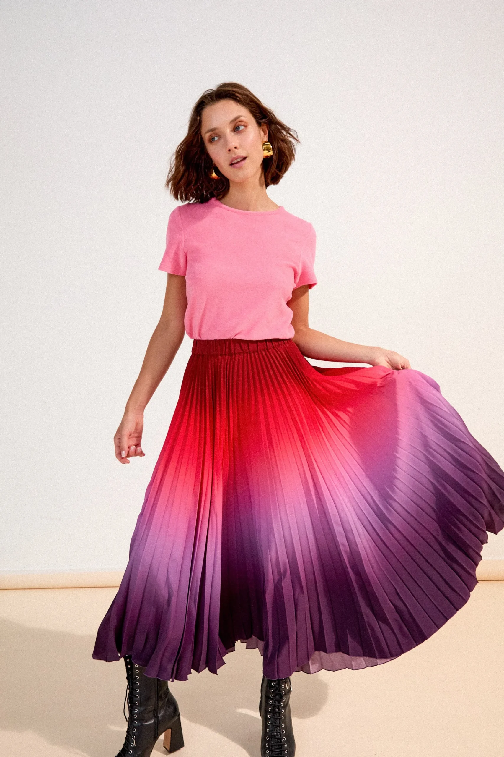 Jupe longue, plissée soleil. Taille élastiquée. Finition bourdon au bord.