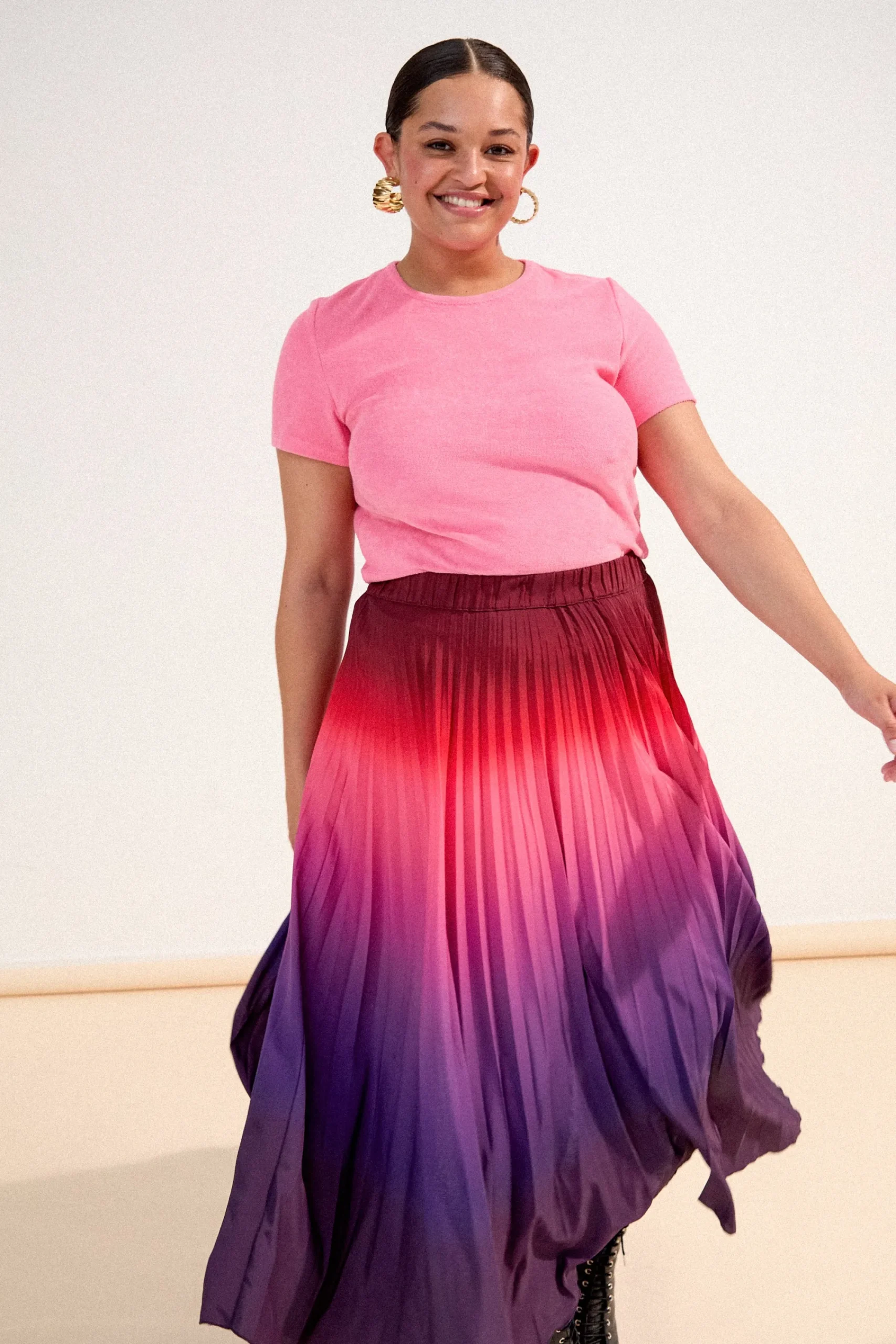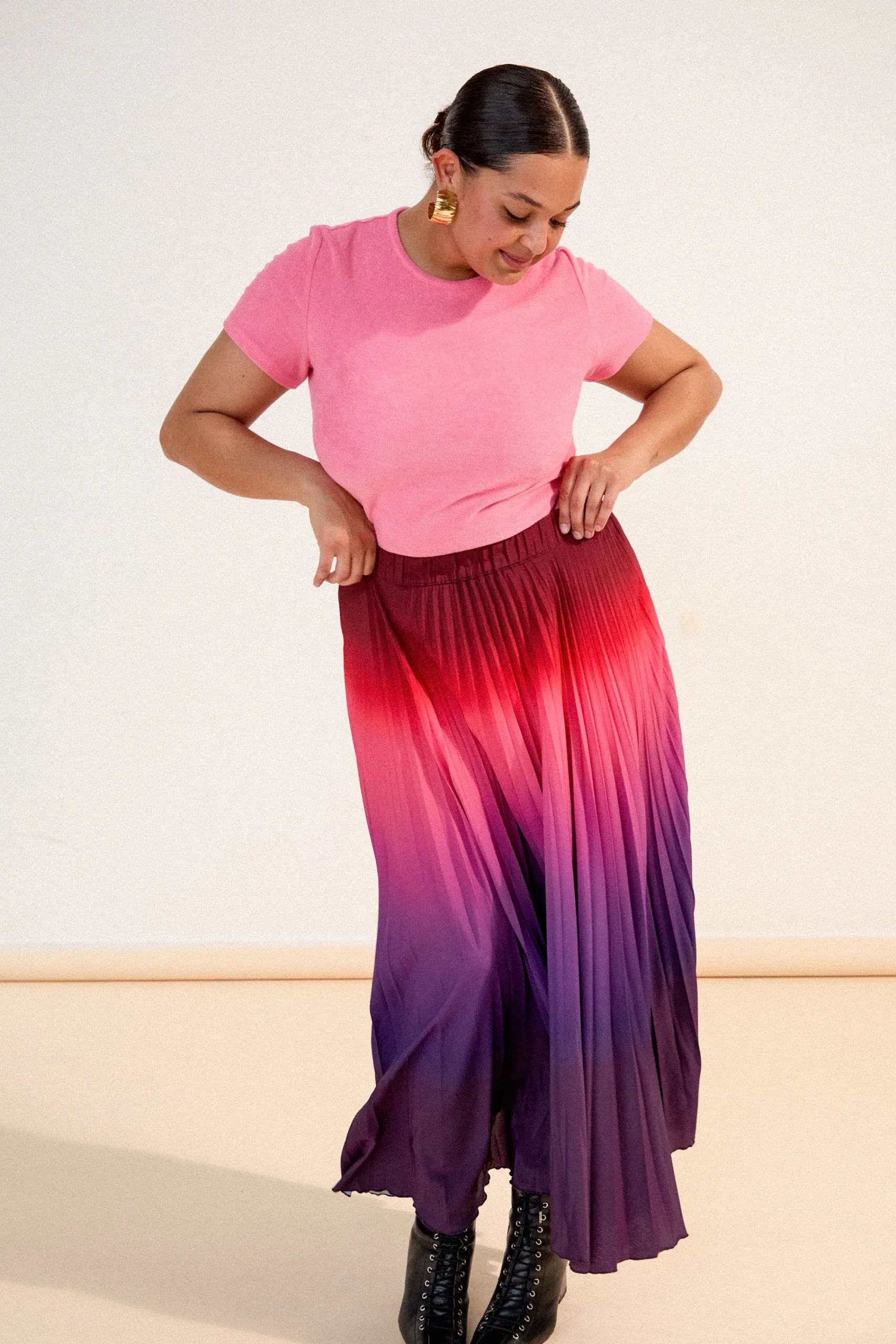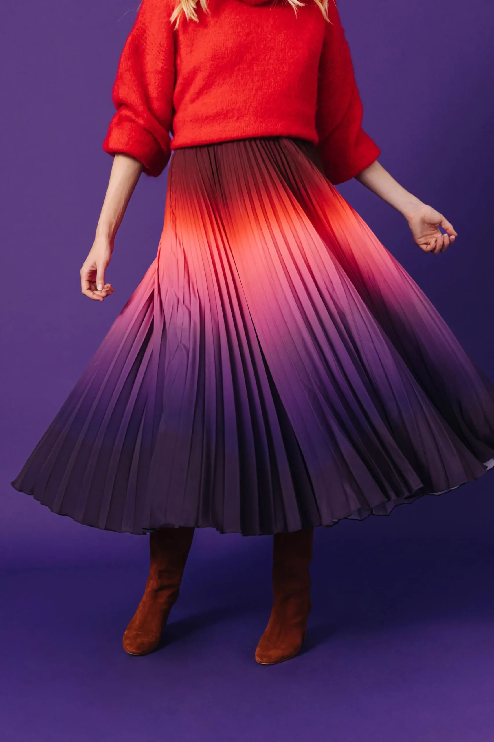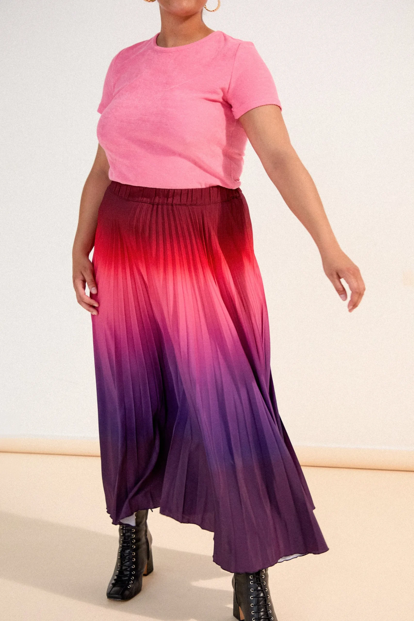 Jupe longue, plissée soleil. Taille élastiquée. Finition bourdon au bord.