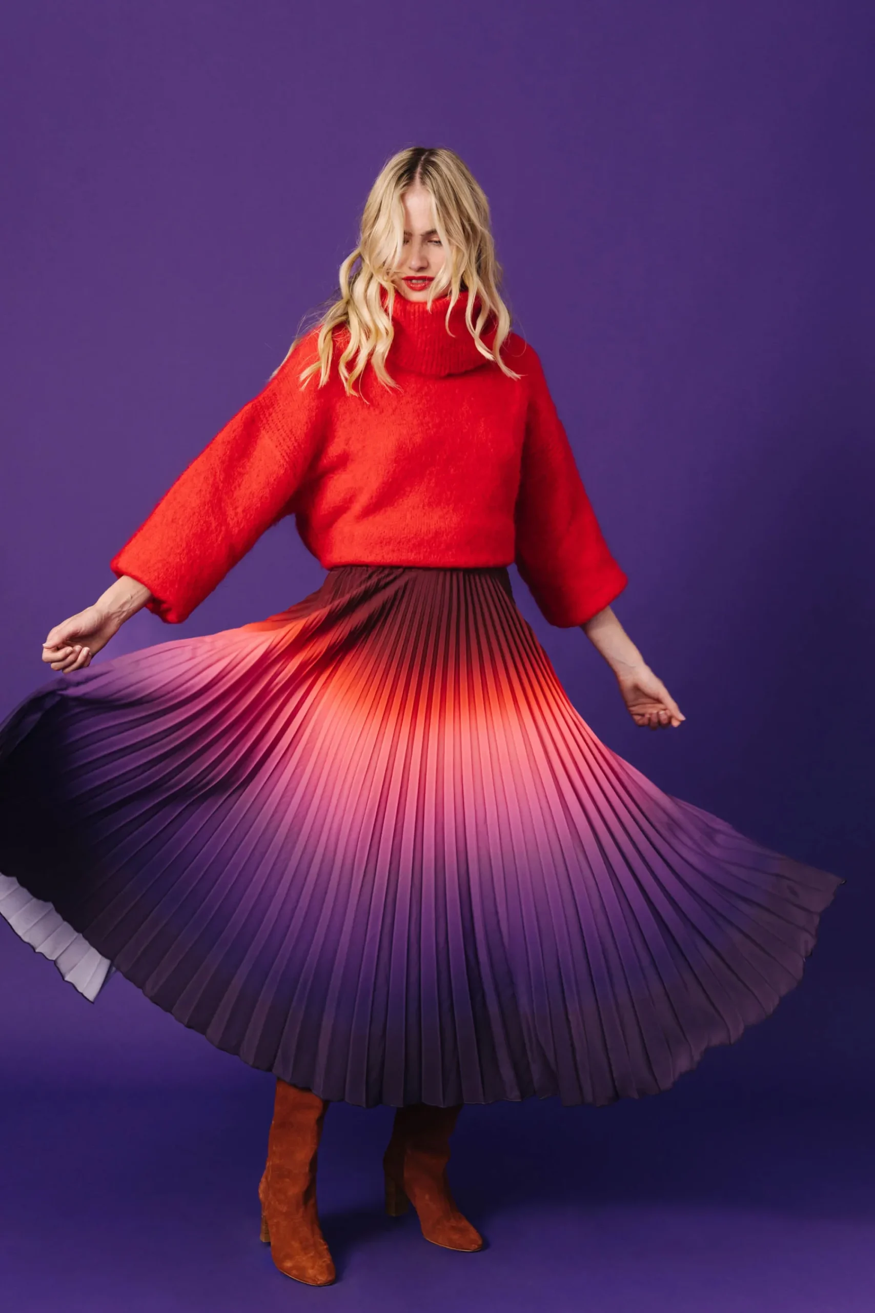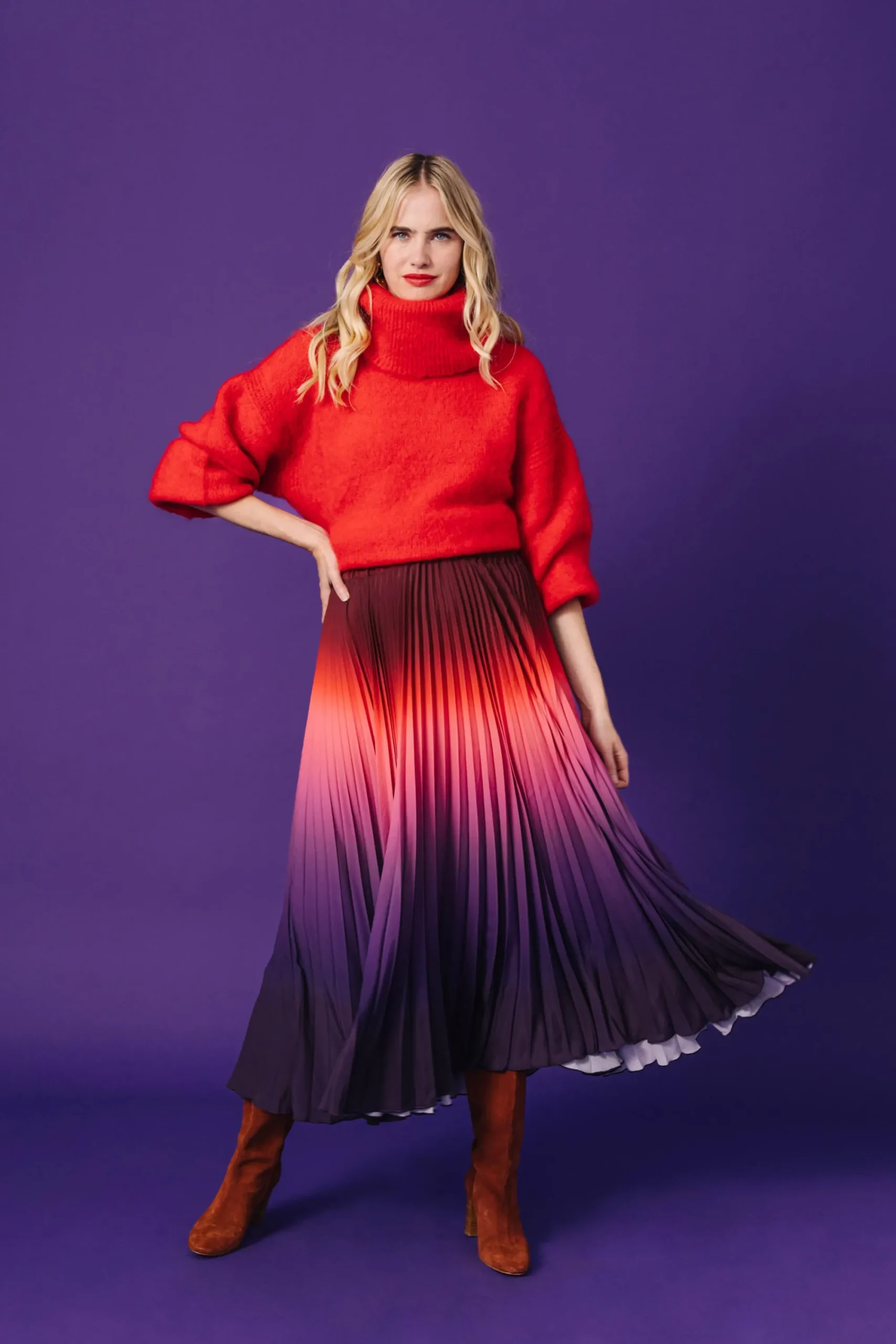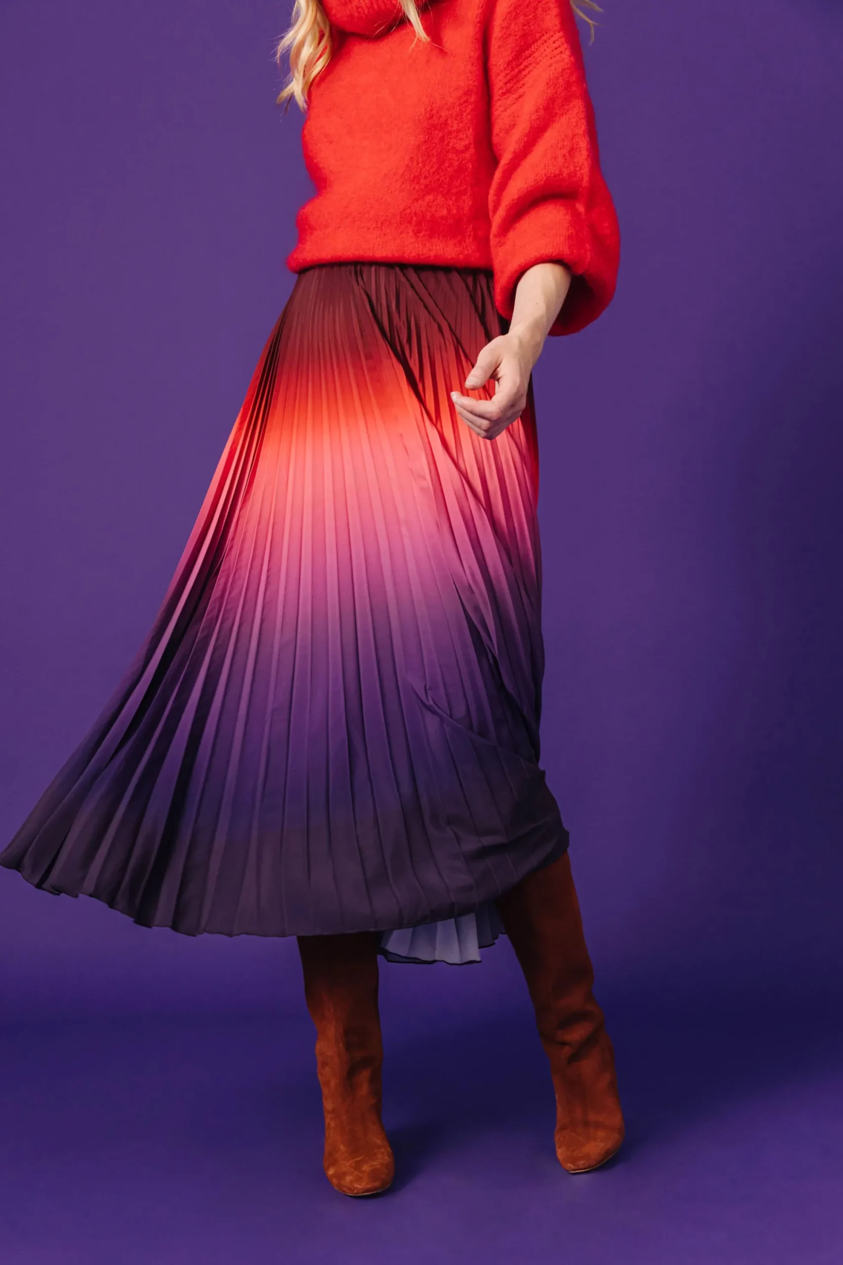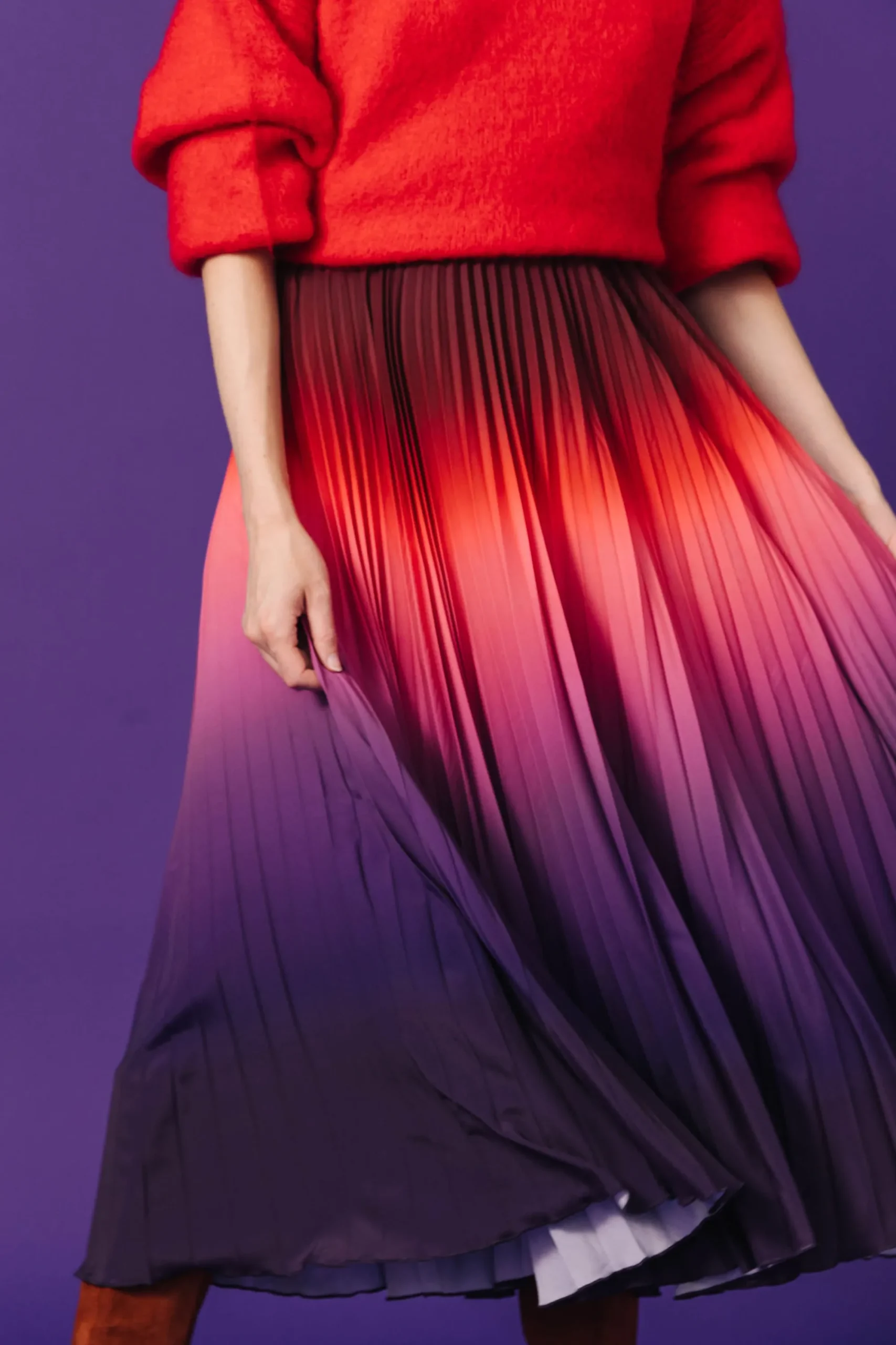 Jupe longue, plissée soleil. Taille élastiquée. Finition bourdon au bord.
