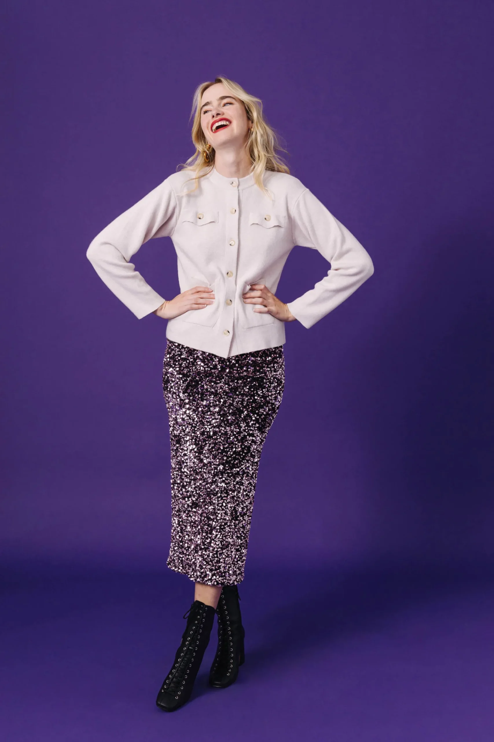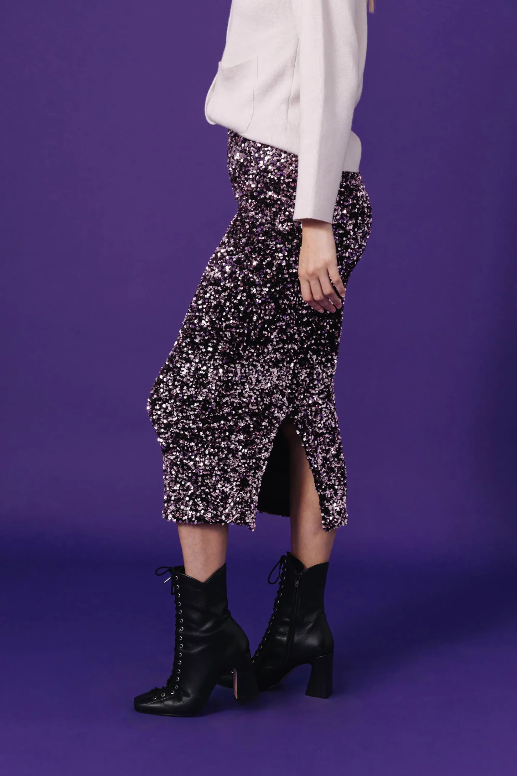 Jupe moulante en sequin stretch. Longueur midi. Ceinture intérieure en jersey doux. Fente dans le dos en bas de la jupe. Ourlet de jupe avec bande appliquée sur l’intérieur.