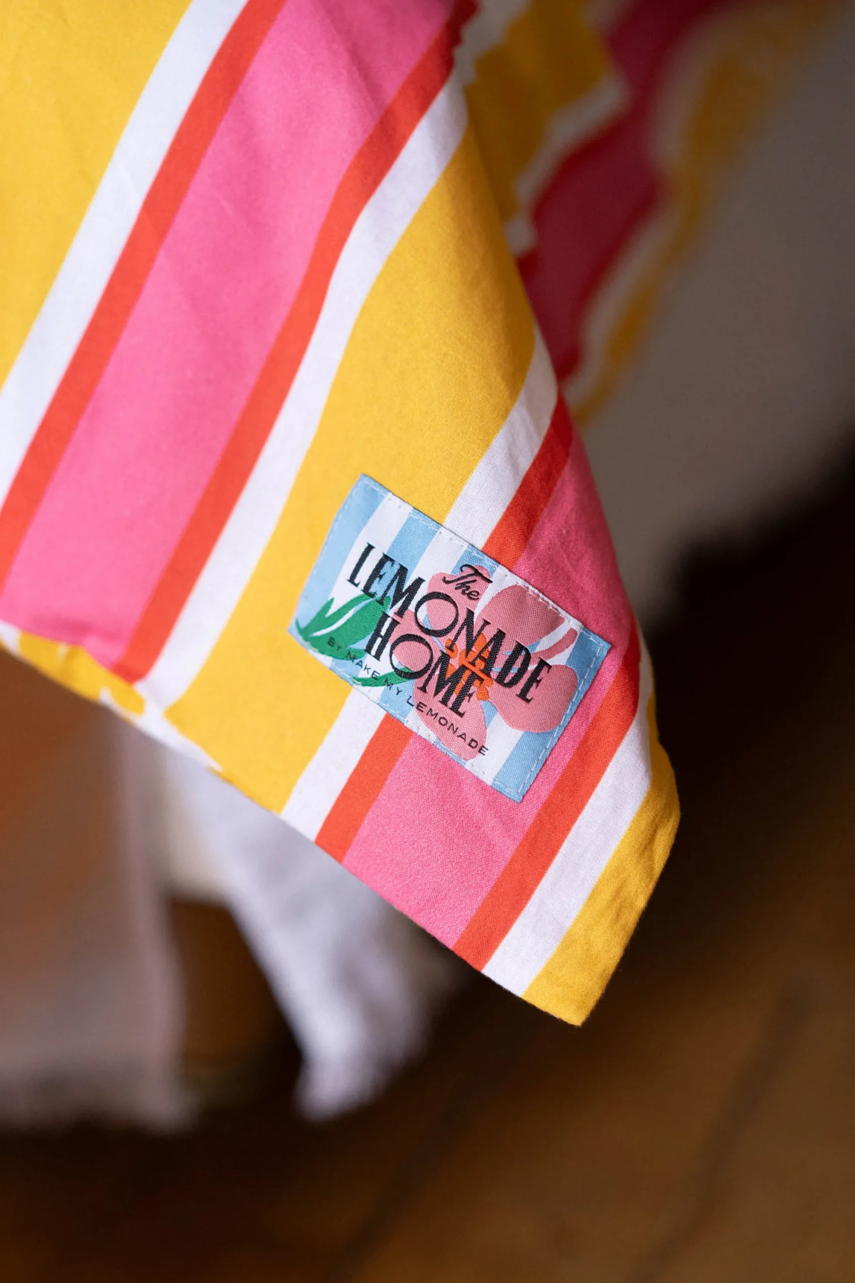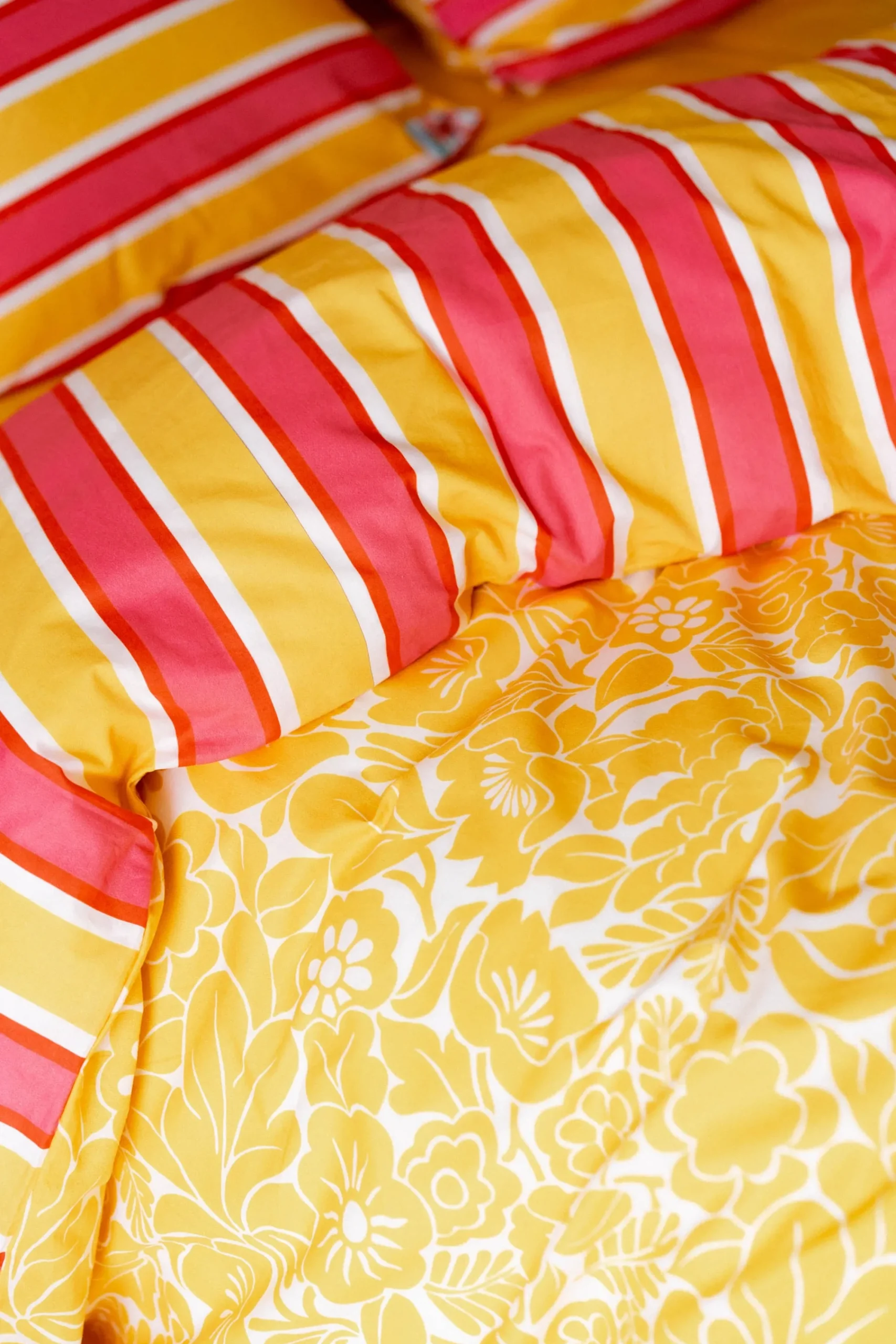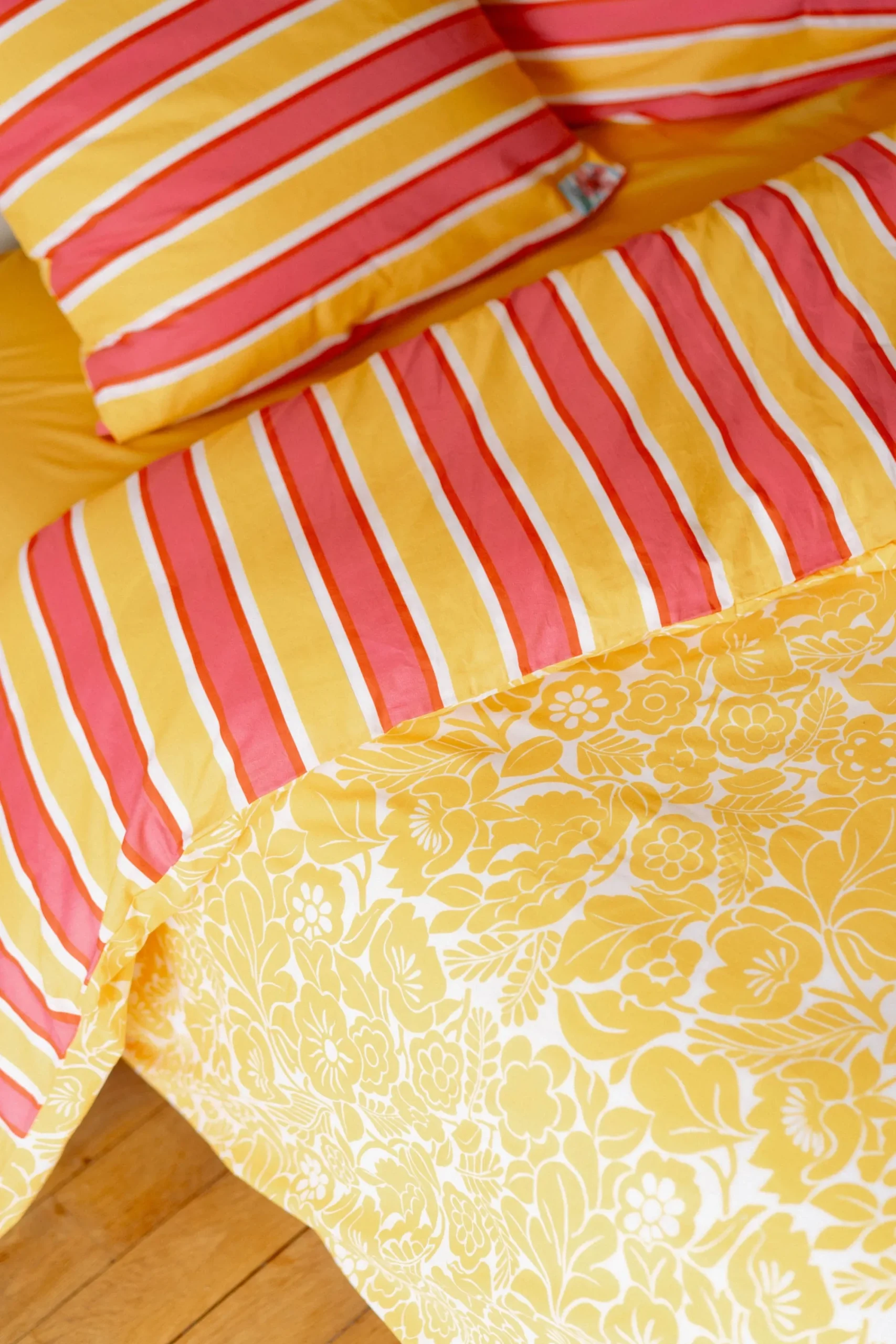 Housse de couette bi-motif. Motif fleuri jaune et blanc sur l’endroit et motif rayure rose et jaune sur l’envers.