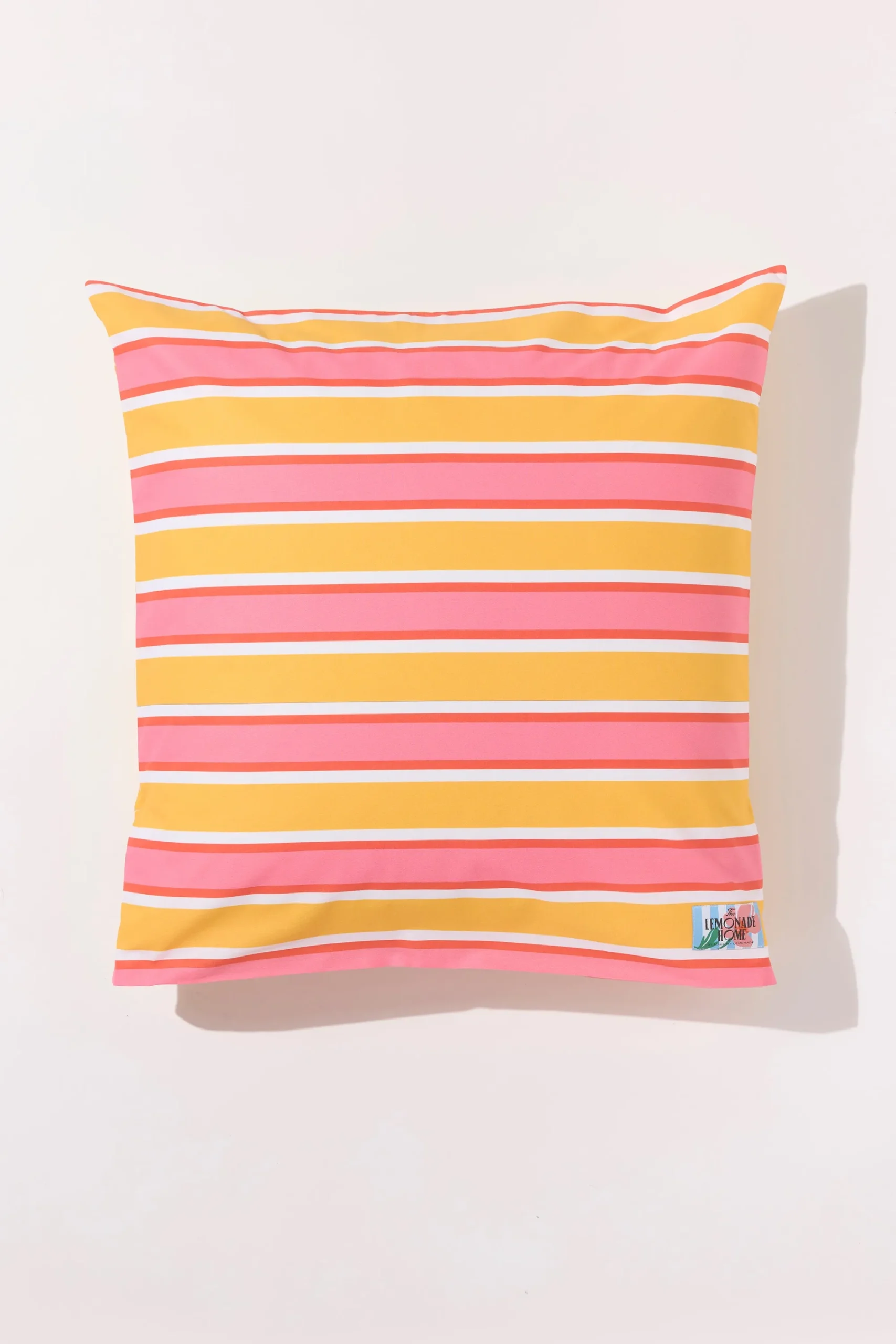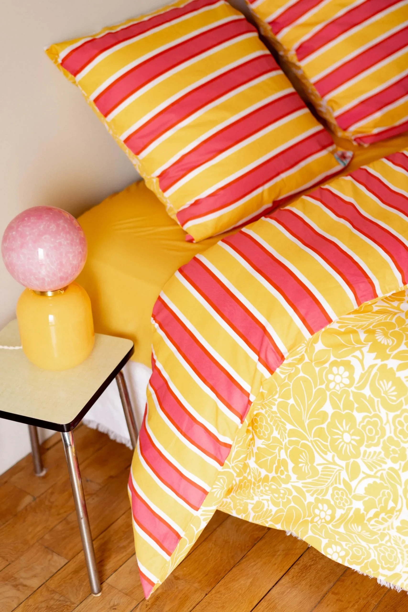 Taie d’oreiller bi-motif. Motif fleuri jaune et blanc sur l’endroit, rayure rose et jaune sur l’envers.