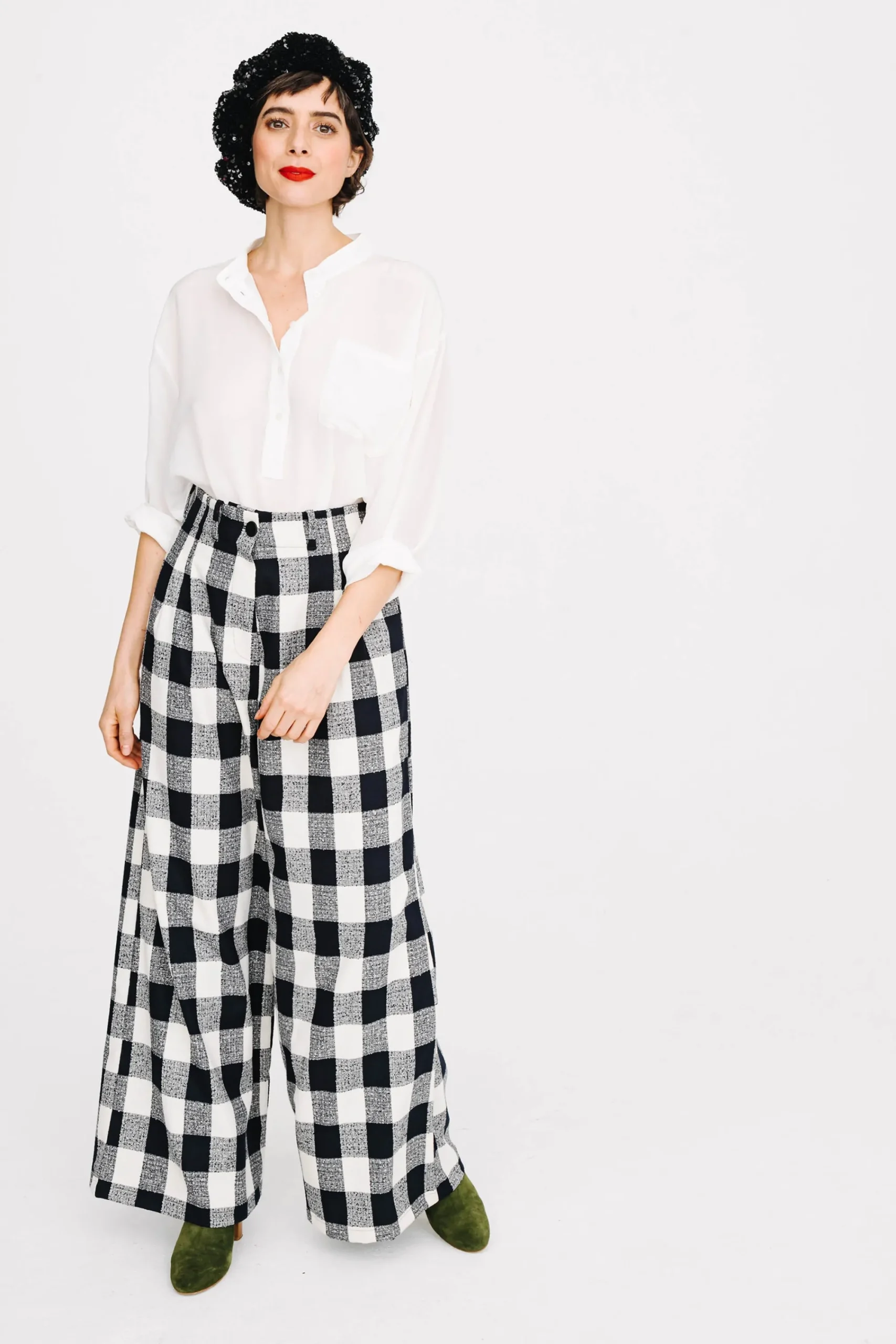 Pantalon taille haute, jambes larges, avec deux grands plis piqués sur chaque jambe devant. Pinces aux dos. Passants à la taille. Enforme à l’intérieur de la ceinture finie par un biais. Fermeture devant par un zip et 1 bouton type jeans noir. Poches dans les coutures côtés.