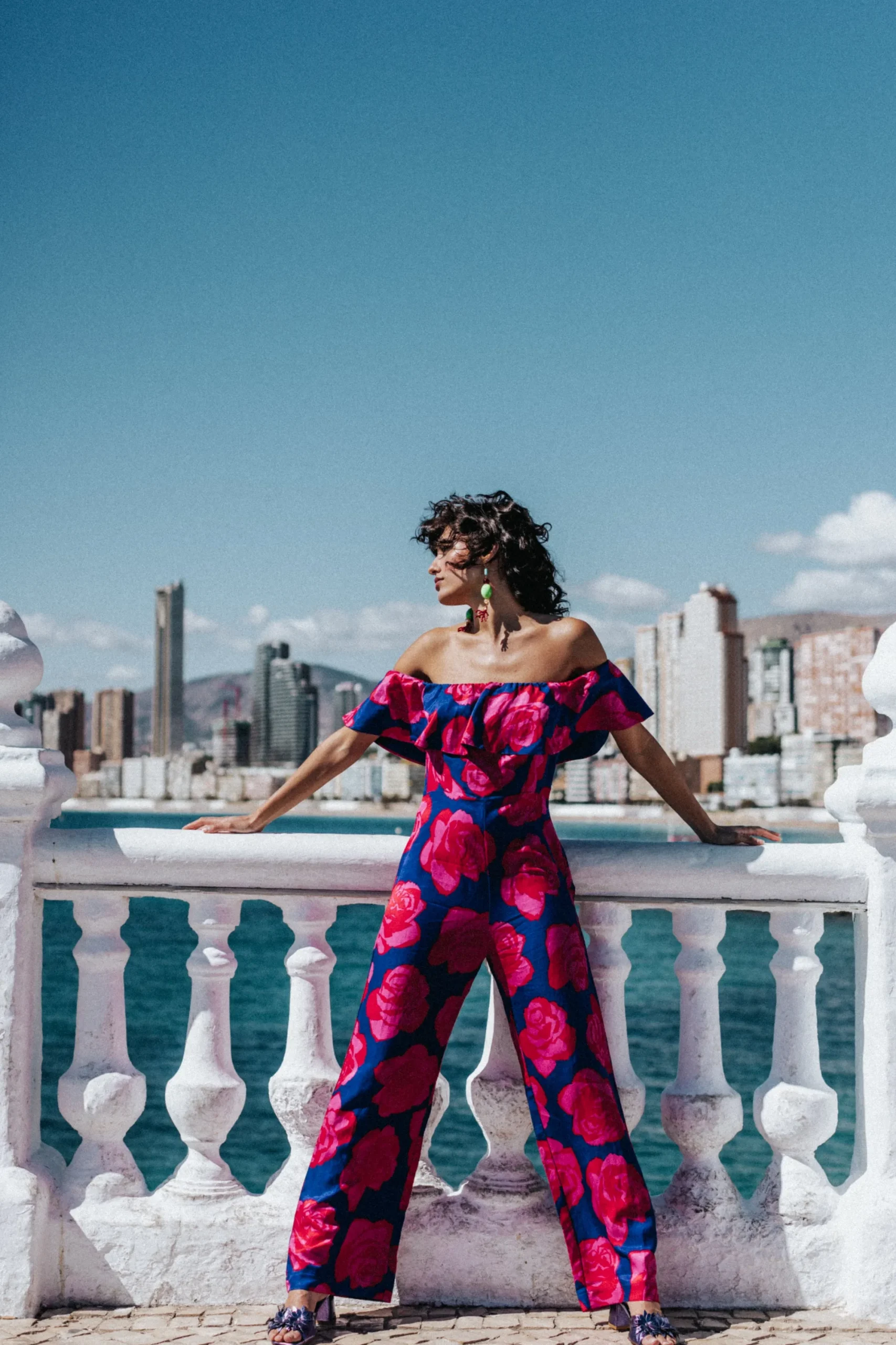 Combinaison avec épaules dénudées. Grand volant couvrant le haut des bras avec un élastique caché et une doublure ton sur ton. Coupe près du corps au niveau du buste et jambes larges. Matière avec léger relief. Zip invisible sur le côté. Deux poches plaquées sur les fesses.