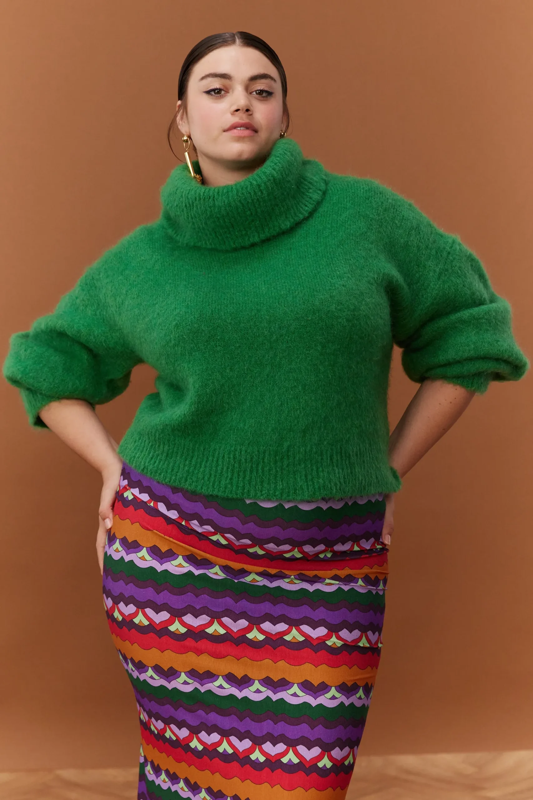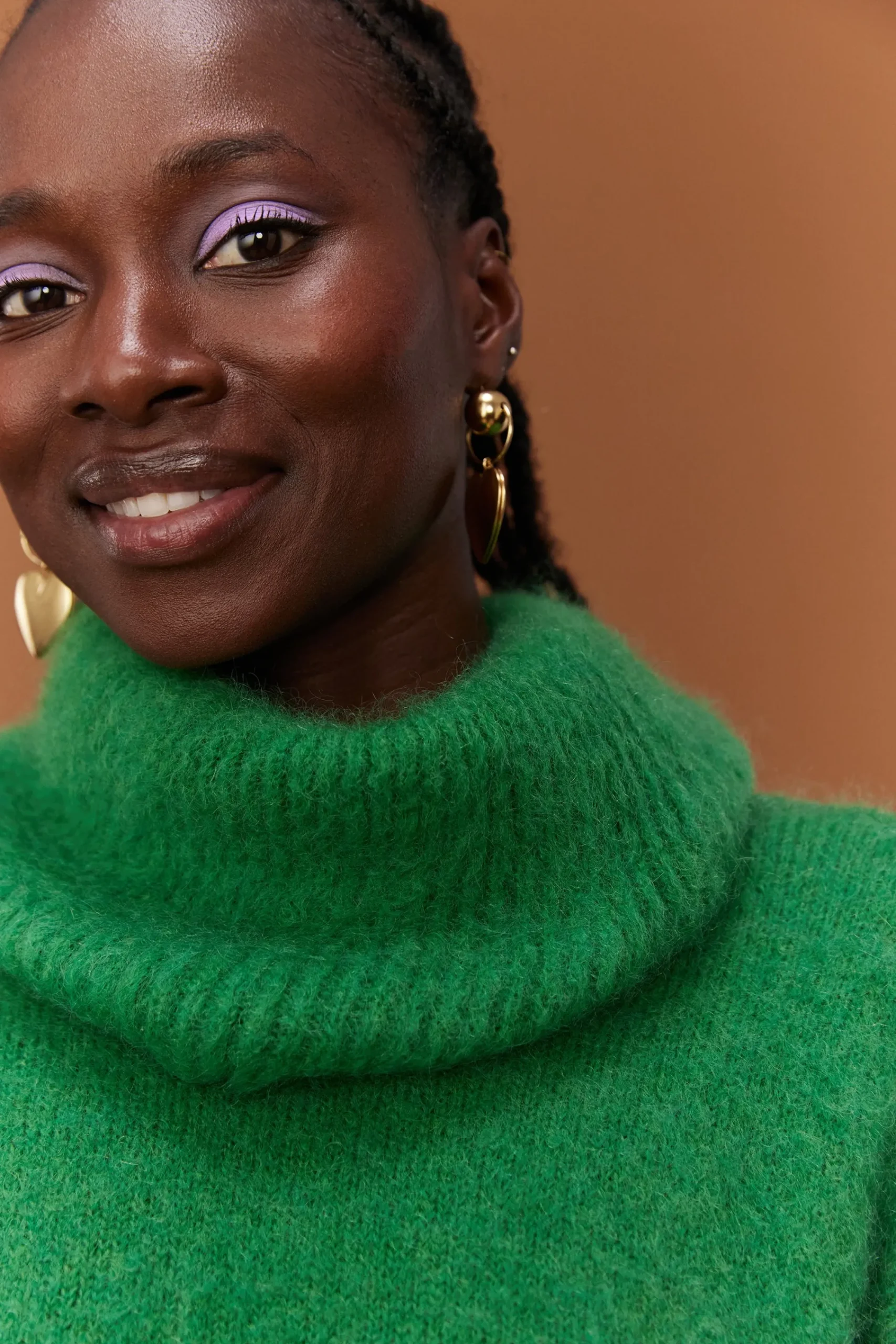 Pull duveteux à col boule, manches bouffantes avec poignets resserrés. Coupe plutôt droite. Fil mohair.