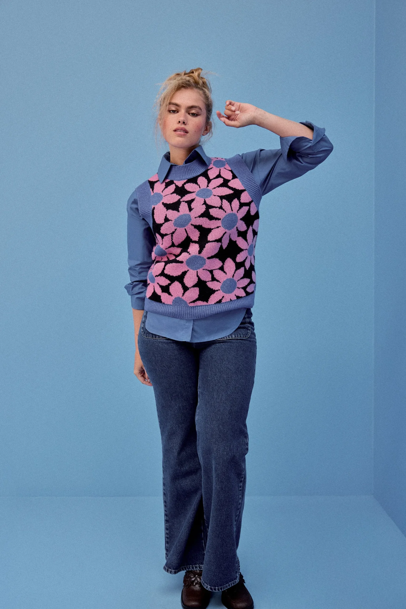 Gilet sans manche, encolure ronde. Motif de fleurs tricoté en jacquard sur le devant et le dos. Bord-côte à l’encolure, aux emmanchures et à la taille. Longueur au dessus des hanches.