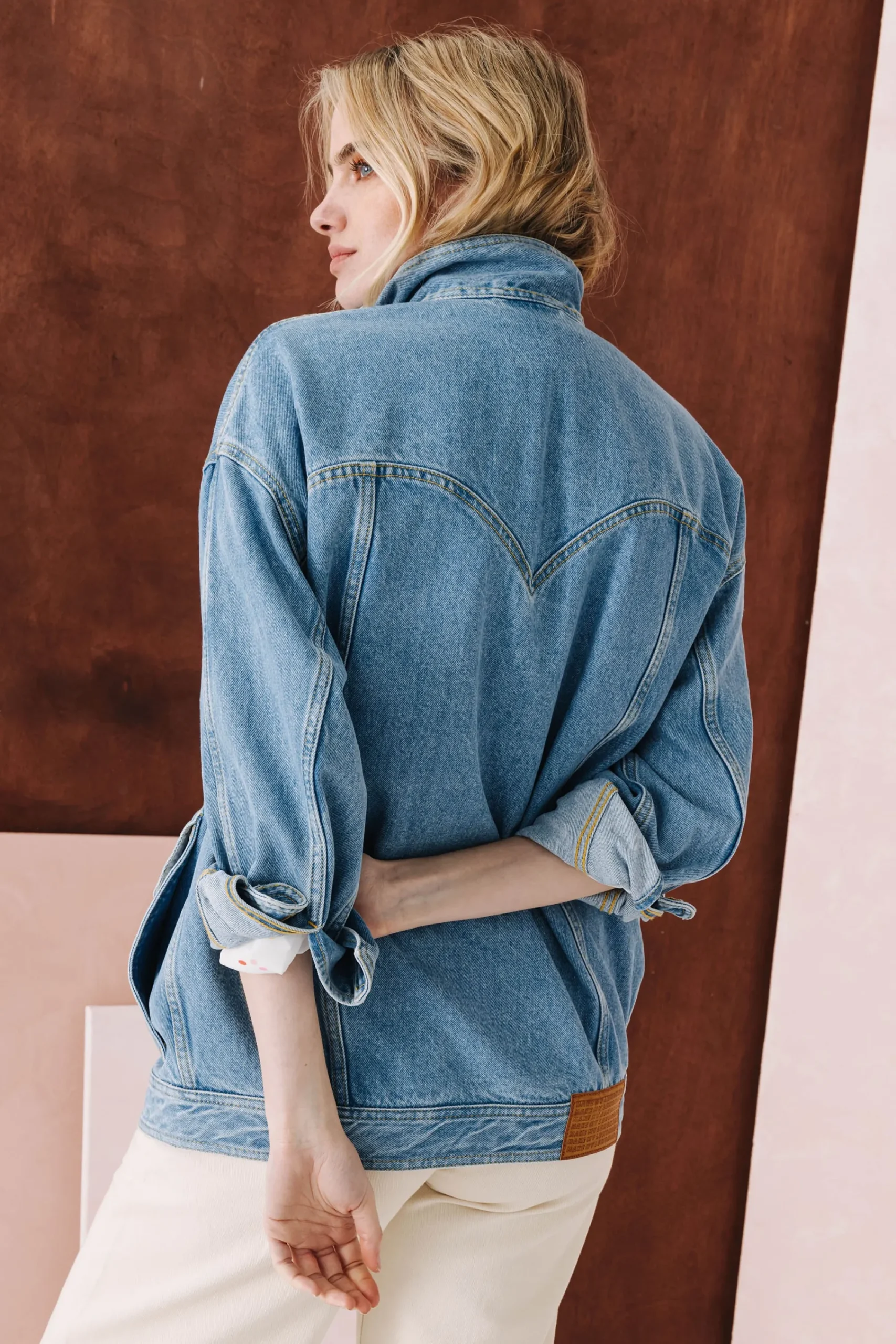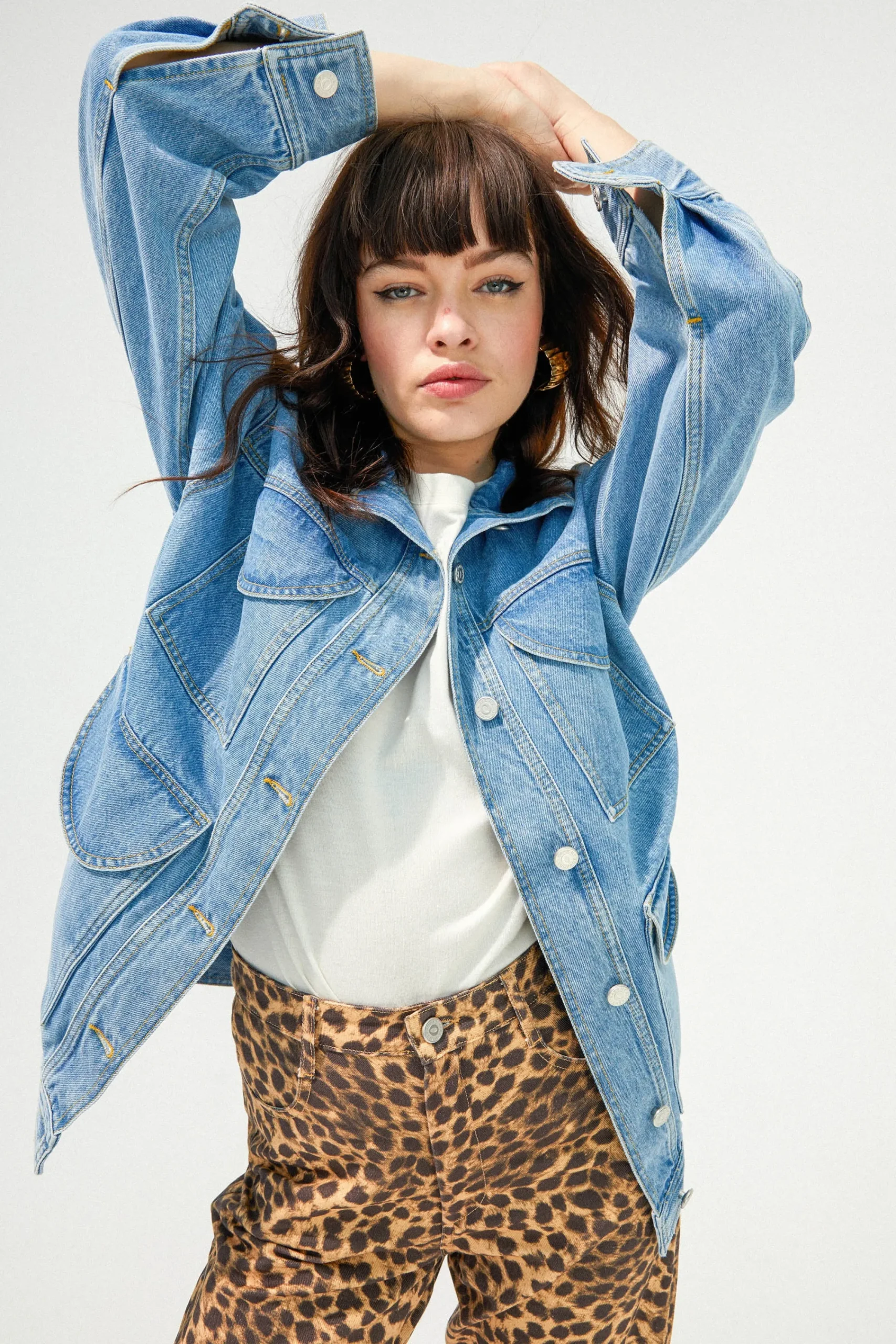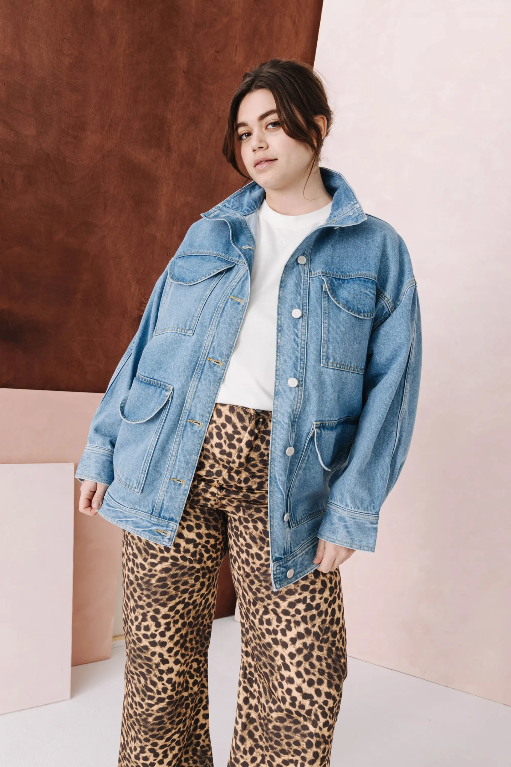 Veste en jean coupe ample. Quatre poches à rabat sur le devant. Deux poches à la poitrine. Les poches du bas ont une double ouverture, sur le dessus et latérale. Manches longues avec poignet fermé par un bouton. Col montant. Patte de boutonnage avec boutons jean métal argenté. « Jacron » vegan sur la ceinture dos.